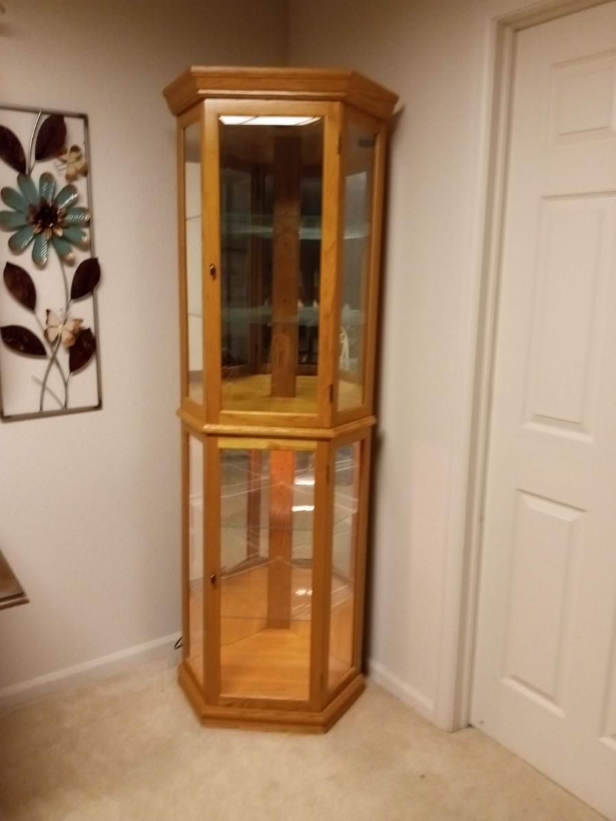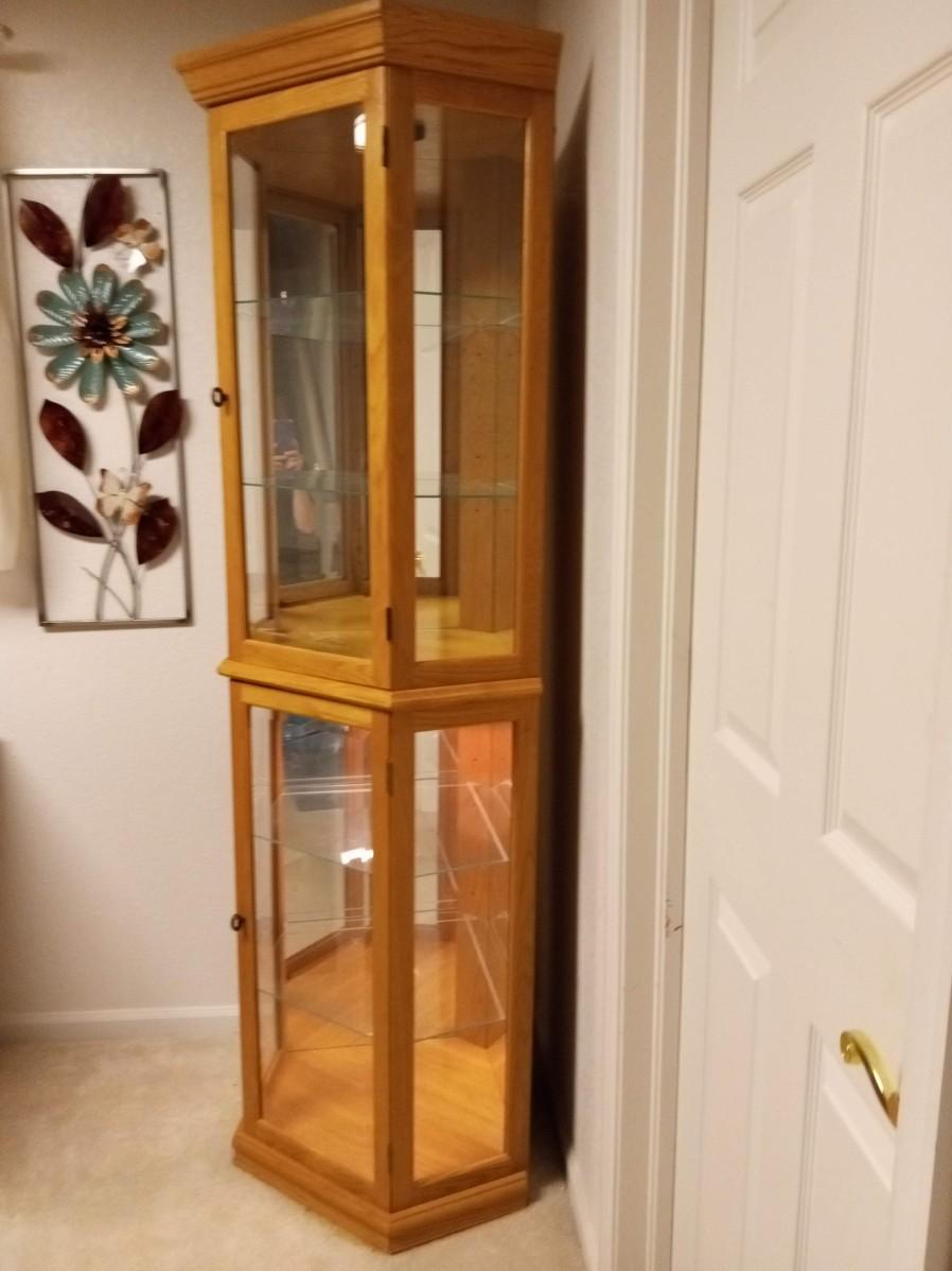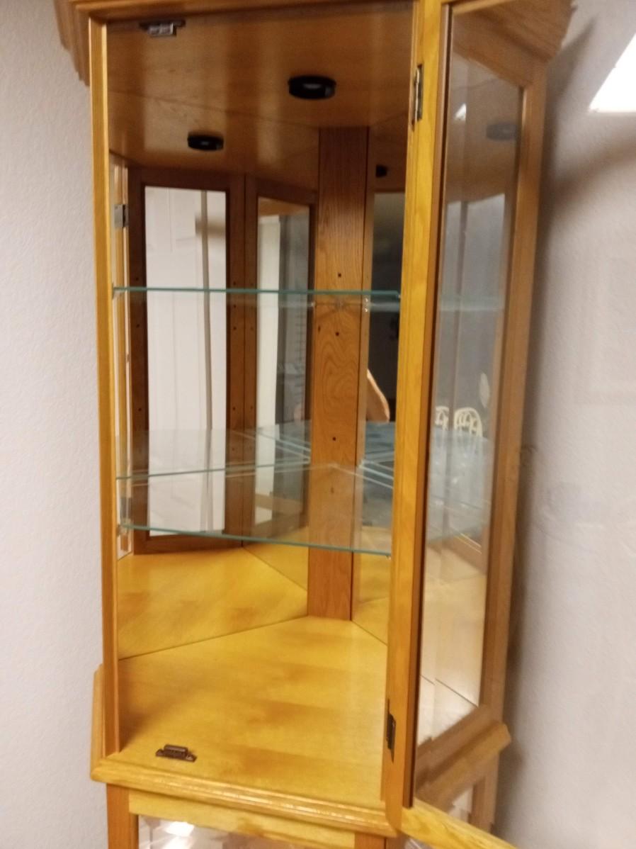 THE TOP AND BOTTOM BOTH LIGHT. EACH SECTION HAS 2 ROUTERED GLASS SHELVES, IT IS IN GREAT SHAPE AND MEASURES APPROX 30" X 75"