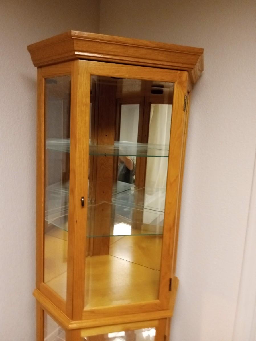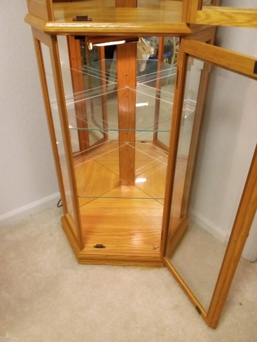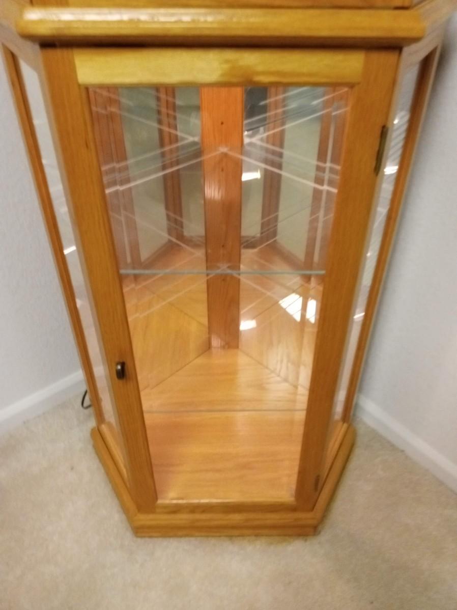 THE TOP AND BOTTOM BOTH LIGHT. EACH SECTION HAS 2 ROUTERED GLASS SHELVES, IT IS IN GREAT SHAPE AND MEASURES APPROX 30" X 75"