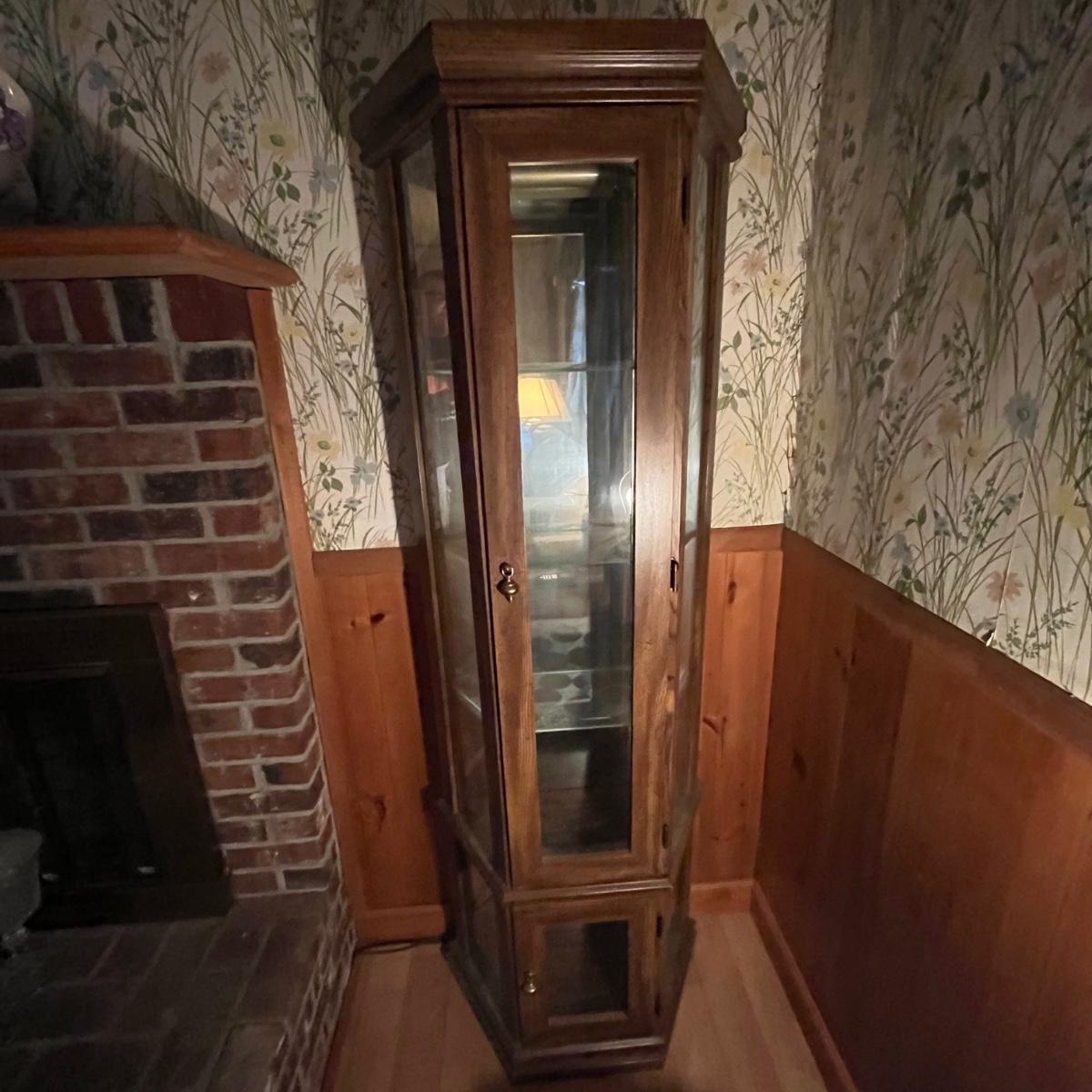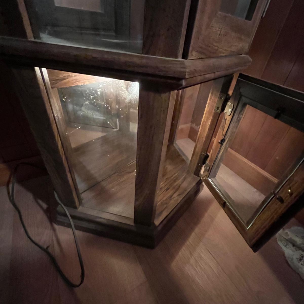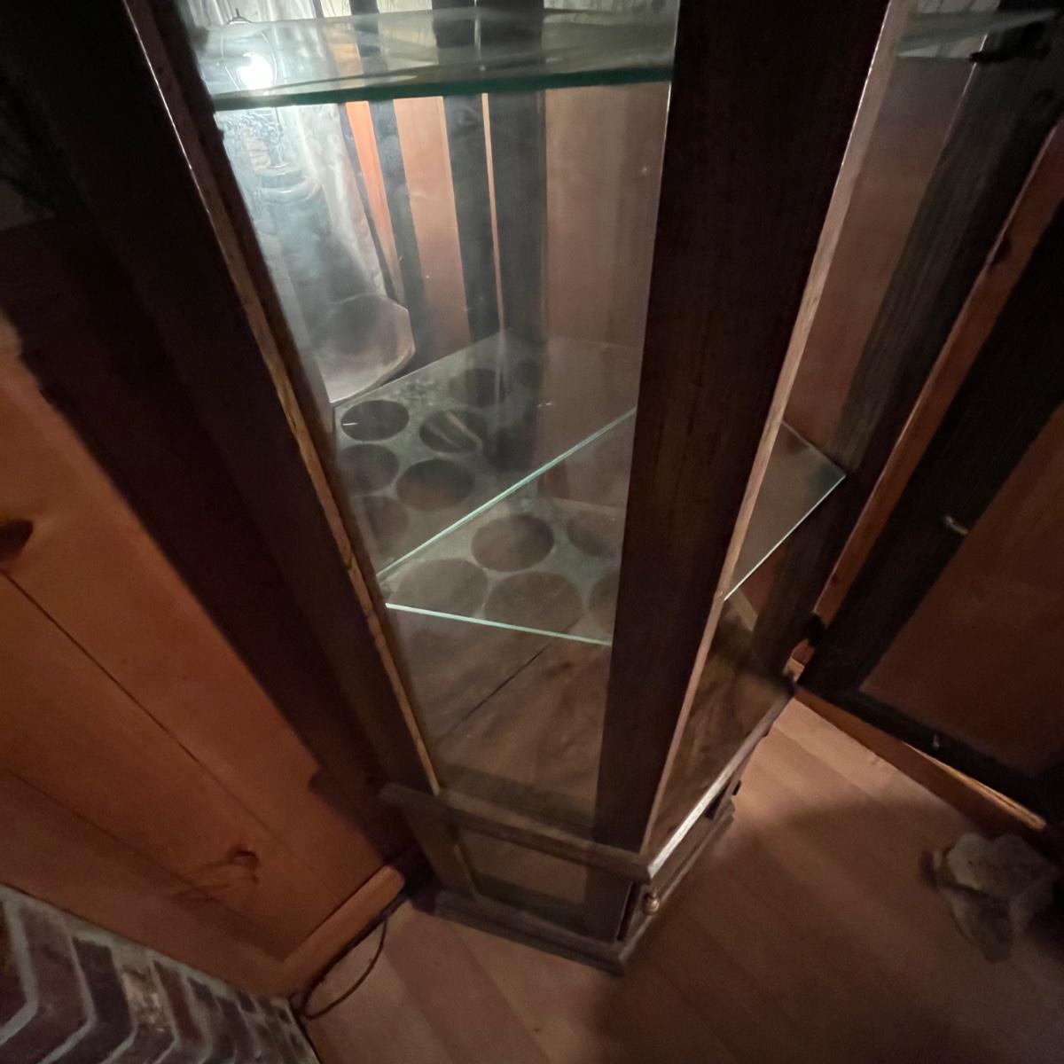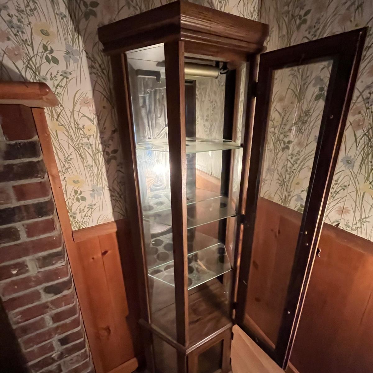 Lot includes a lighted display cabinet with three glass shelves. Cabinet has two lights that both worked when tested. Cabinet measures 12” x 24” x 71” and is made from pressed wood.