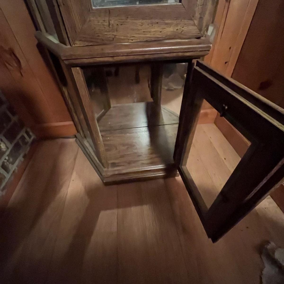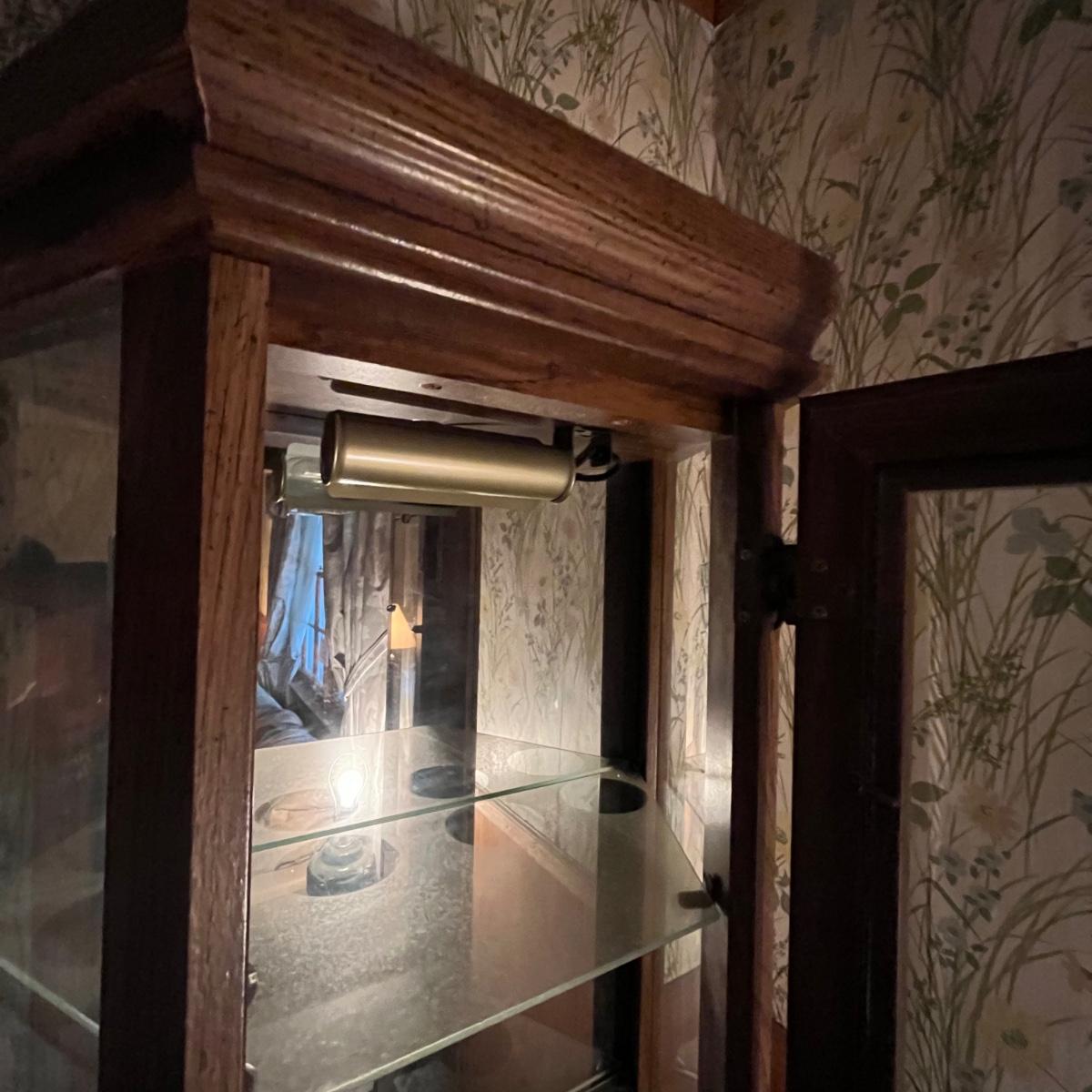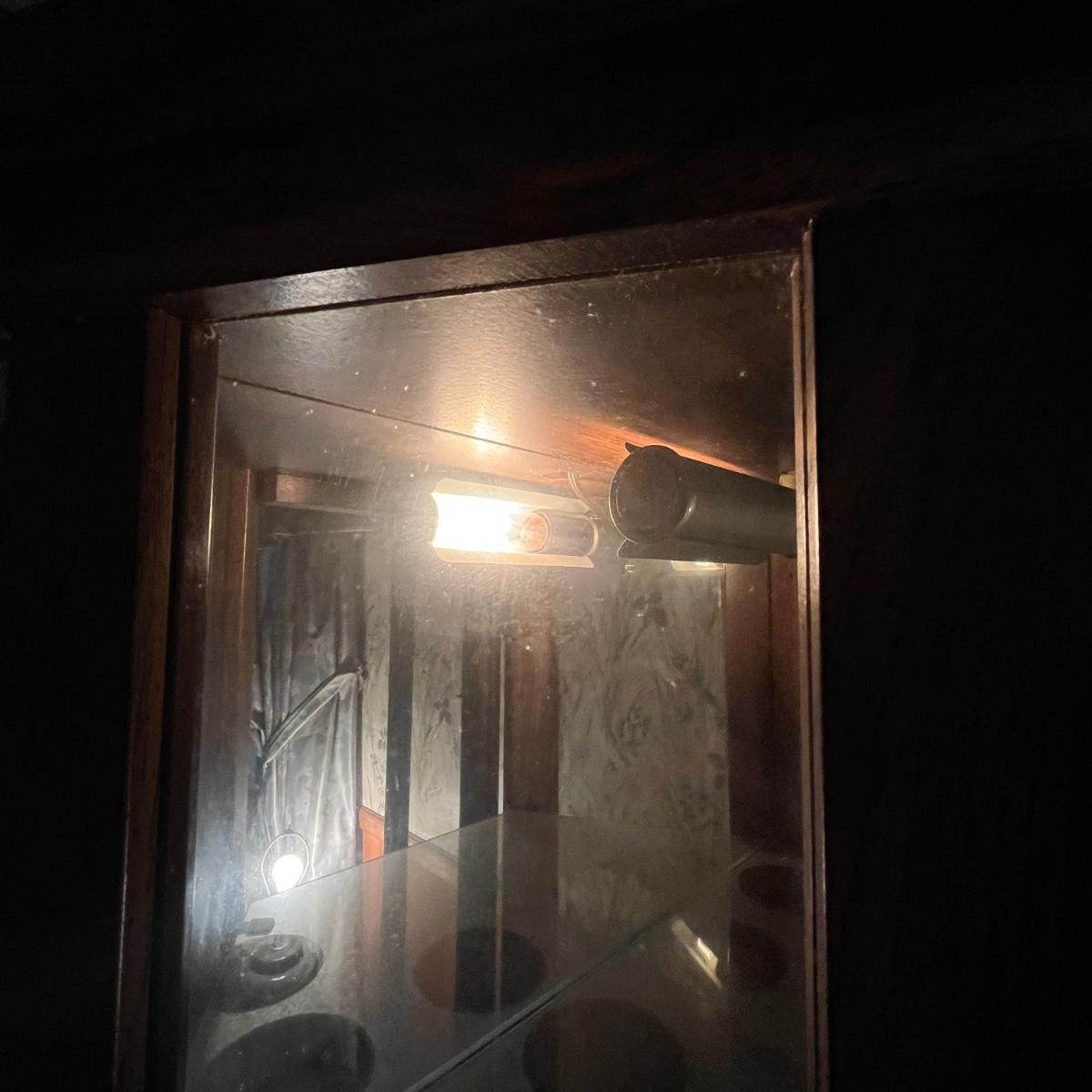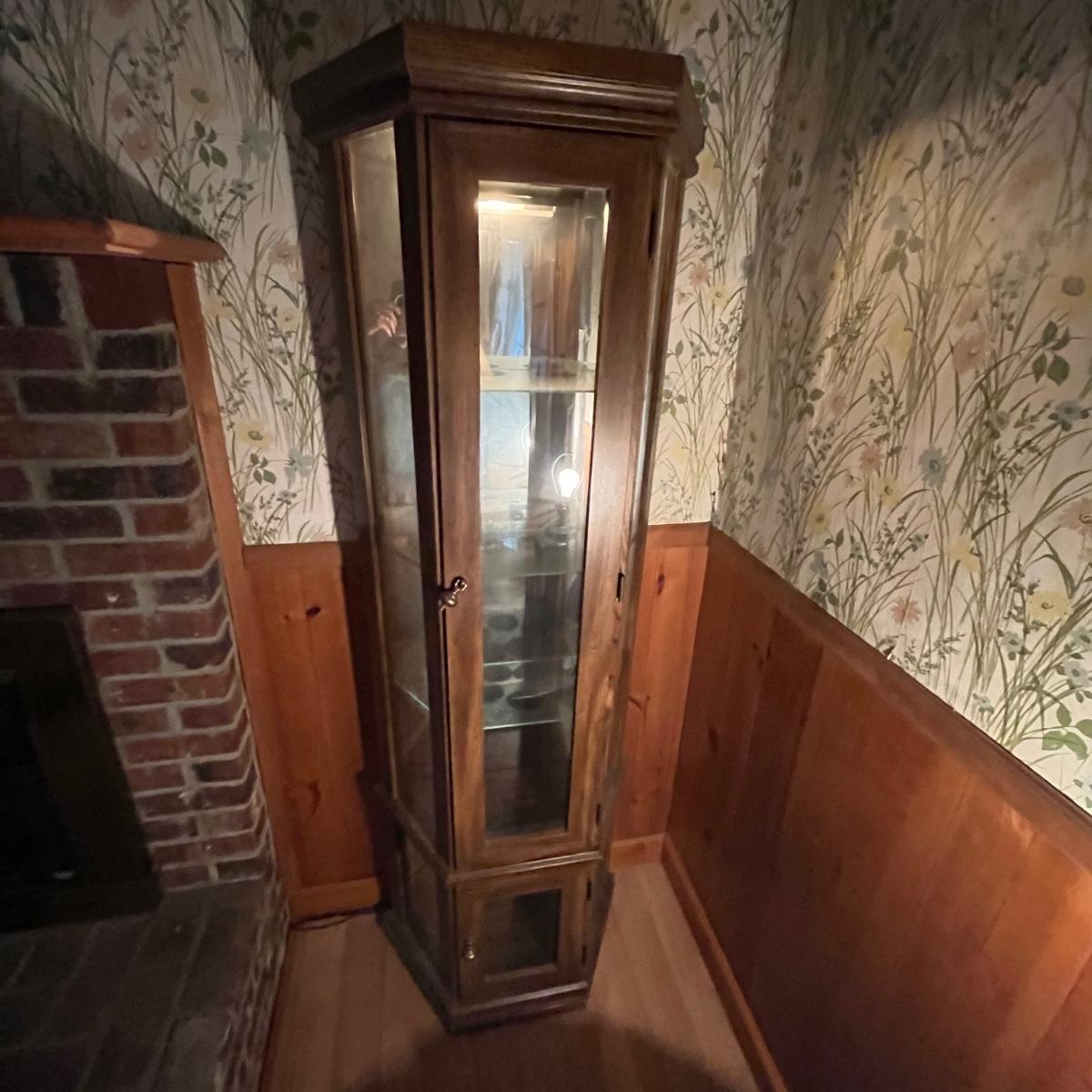Lot includes a lighted display cabinet with three glass shelves. Cabinet has two lights that both worked when tested. Cabinet measures 12” x 24” x 71” and is made from pressed wood.