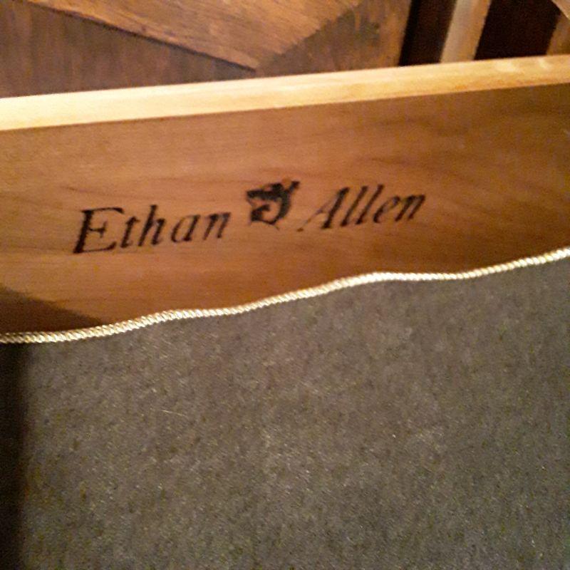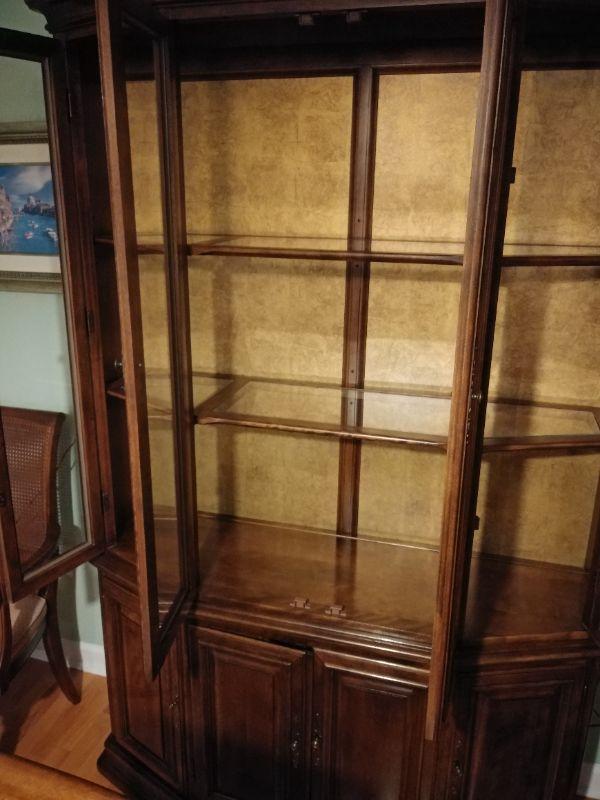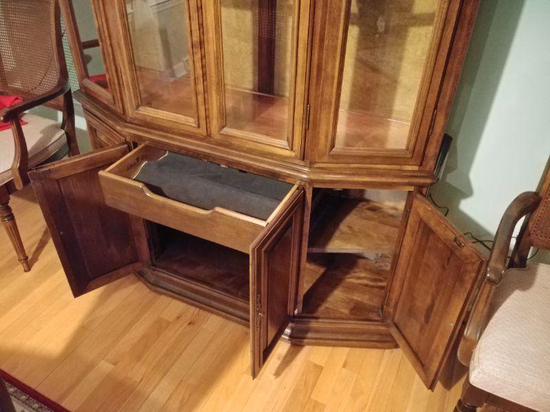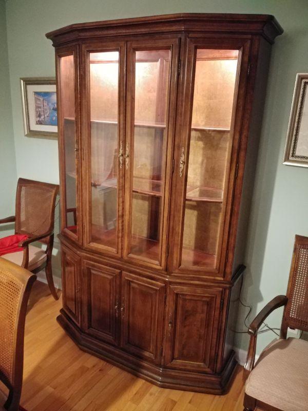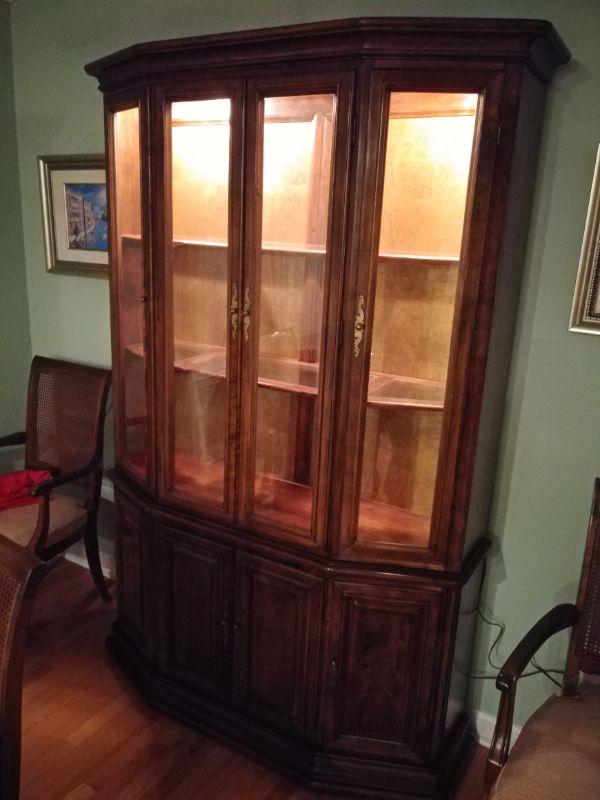 Lighted Ethan Allen China Cabinet has four doors and two glass shelves in the upper cabinet. The lower cabinet has four solid doors, one shelf and a silverware drawer.