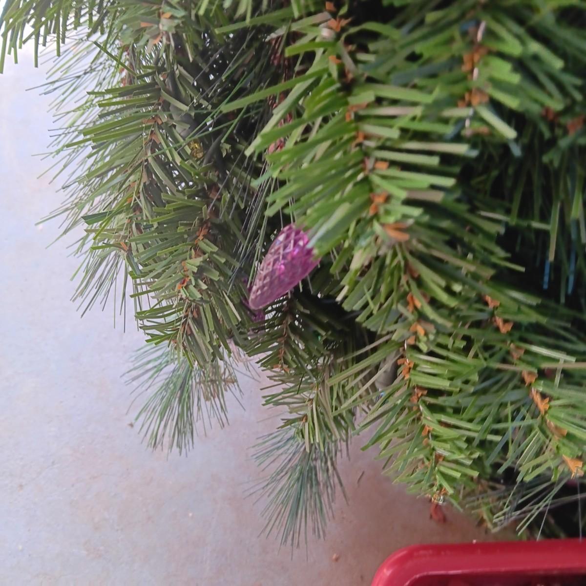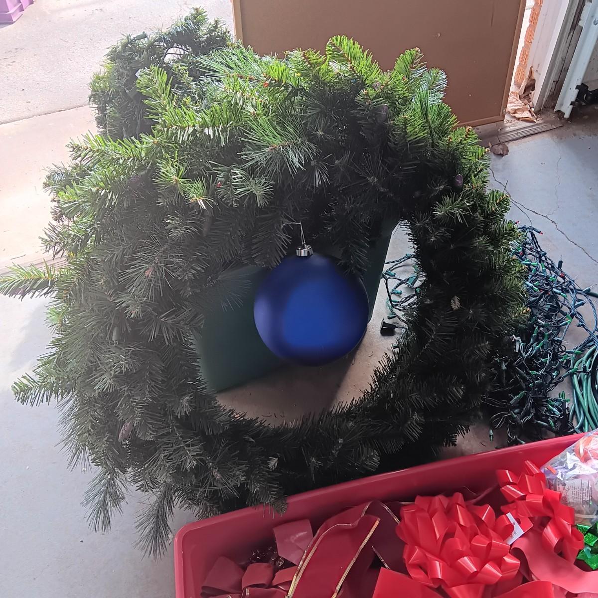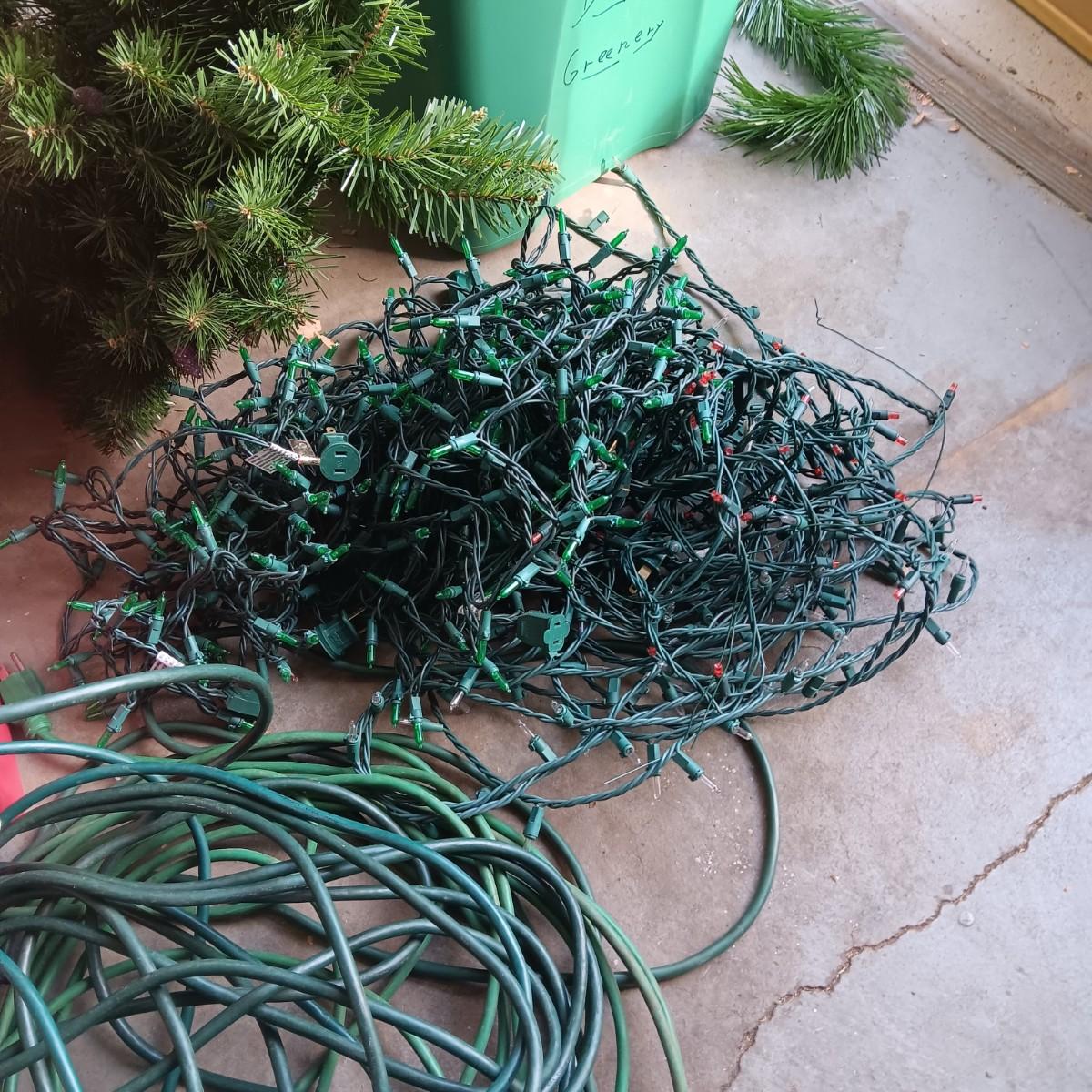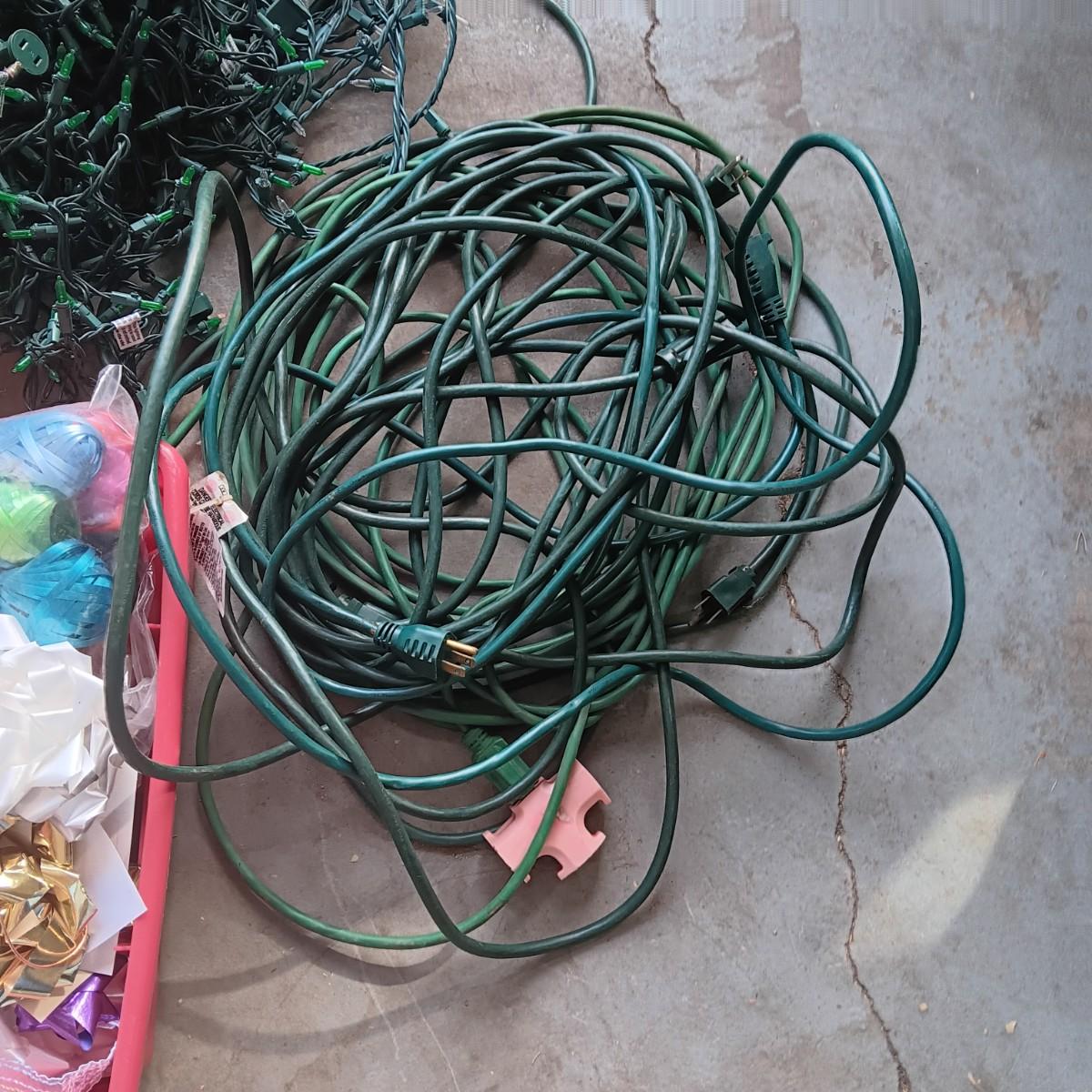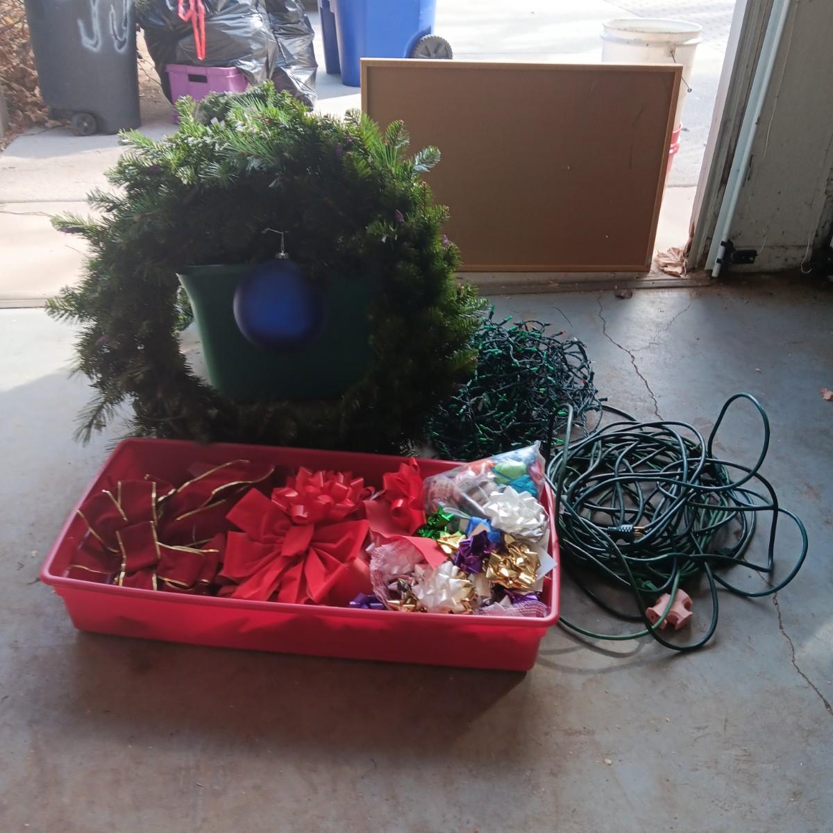 LIGHTED GARLAND AND LARGE WREATH, CHRISTMAS LIGHTS, EXTENSION CORDS AND MORE