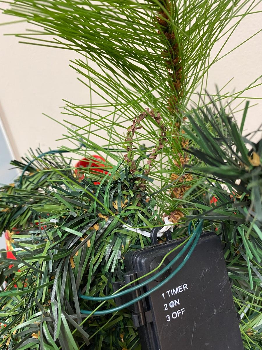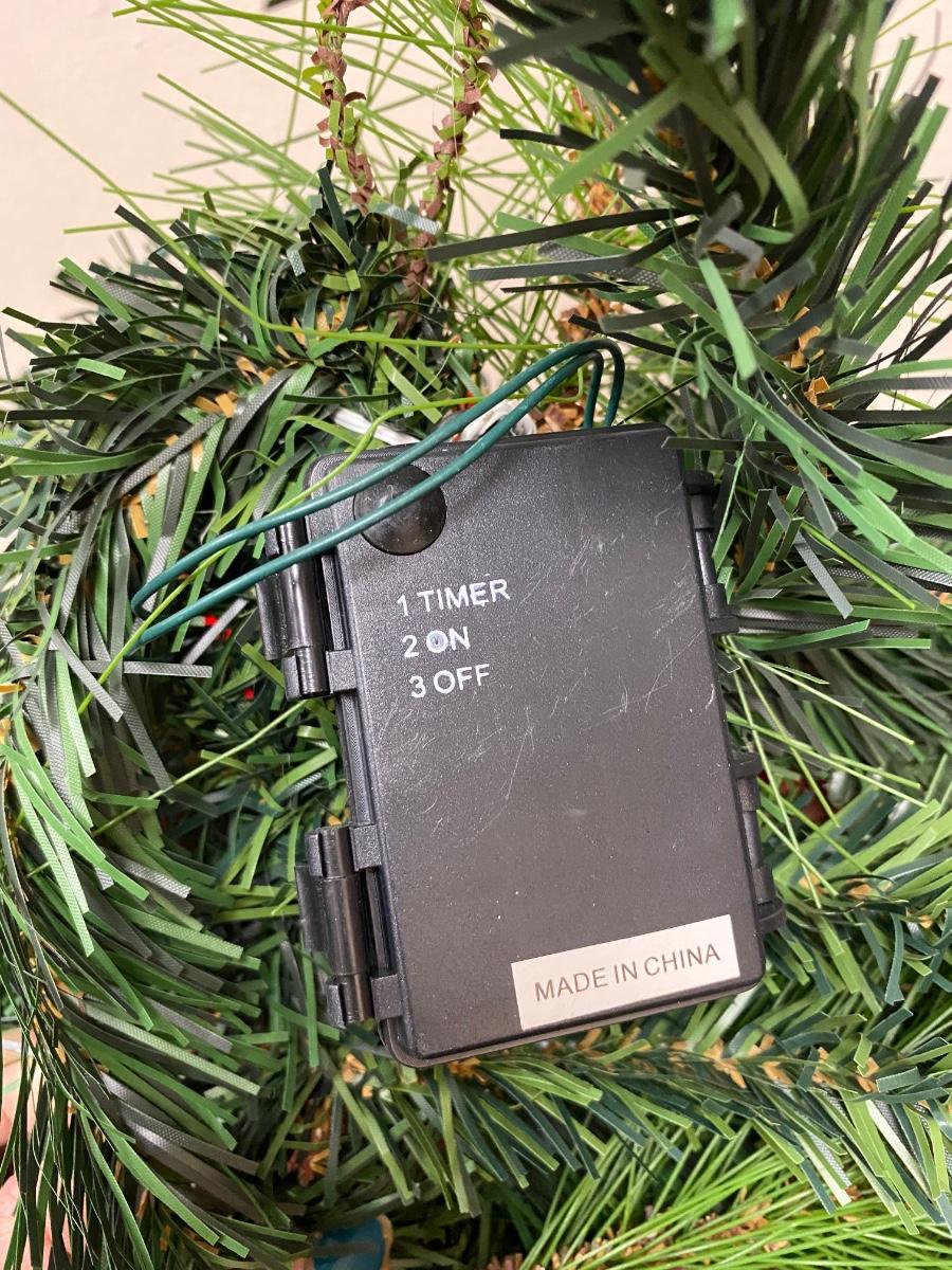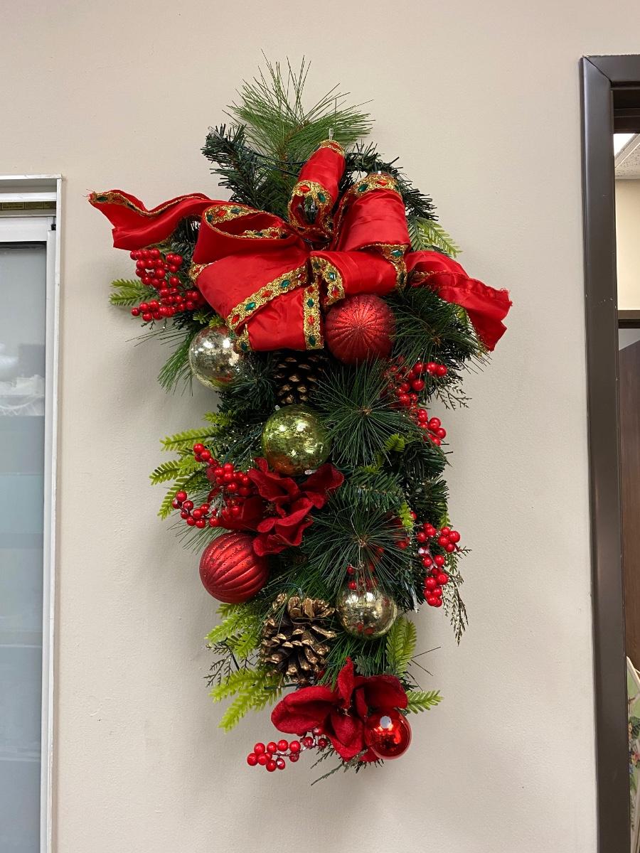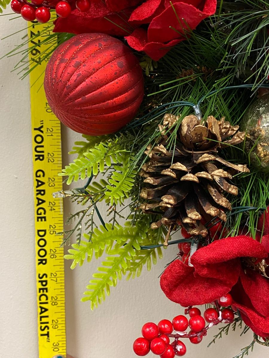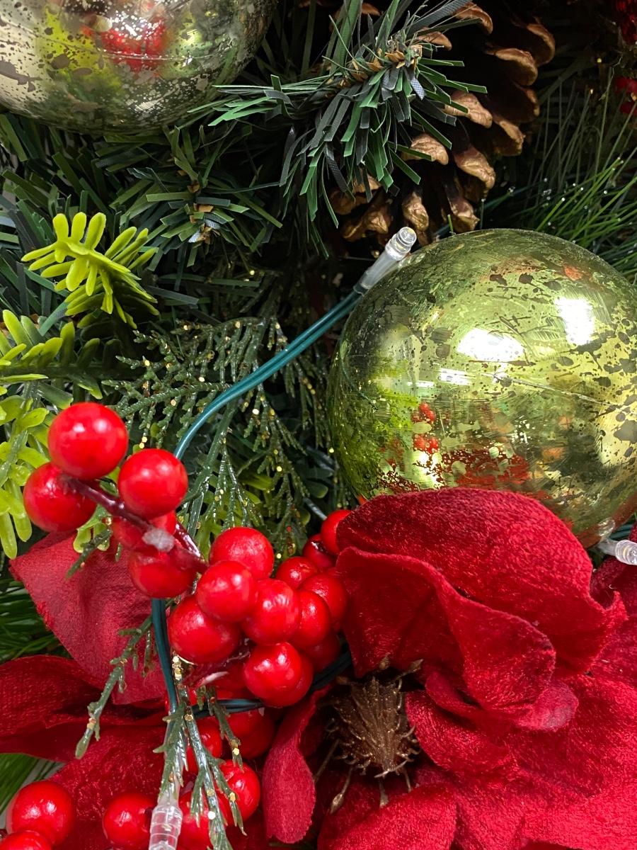 Large hanging Christmas arrangement of artificial pine, red berries, pinecones, and ornaments. Has fairy lights wrapped through it, needs batteries. Displays well. About 30" length.
