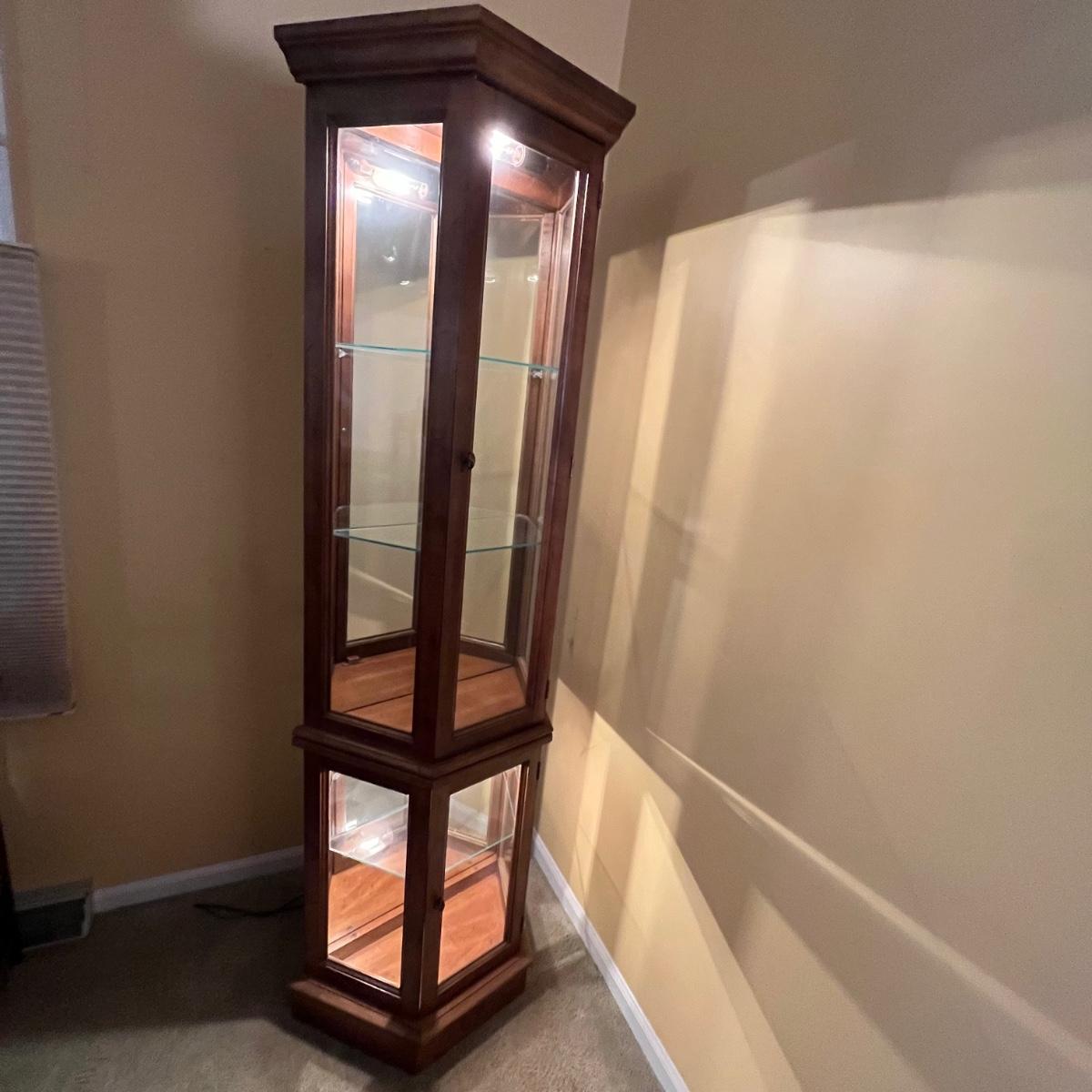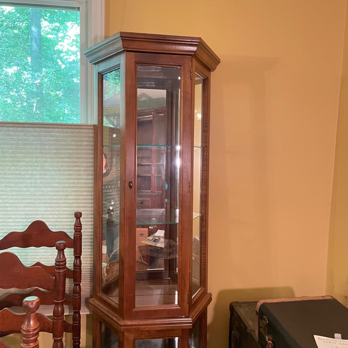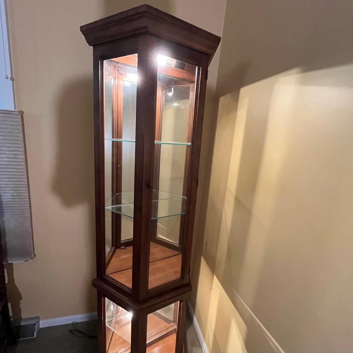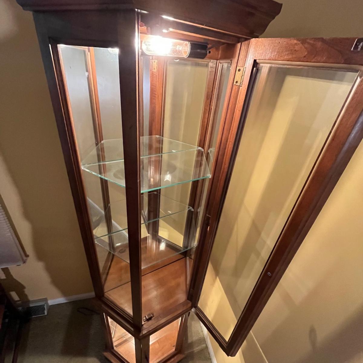 Lot includes a solid wood curio cabinet with two lights, mirrored back and three glass shelves. The glass shelves are removable for transport, but height is non-adjustable. Both lights worked when tested. Cabinet is shaped like an isosceles trapezoid and measures 12” x 21” x 70”.