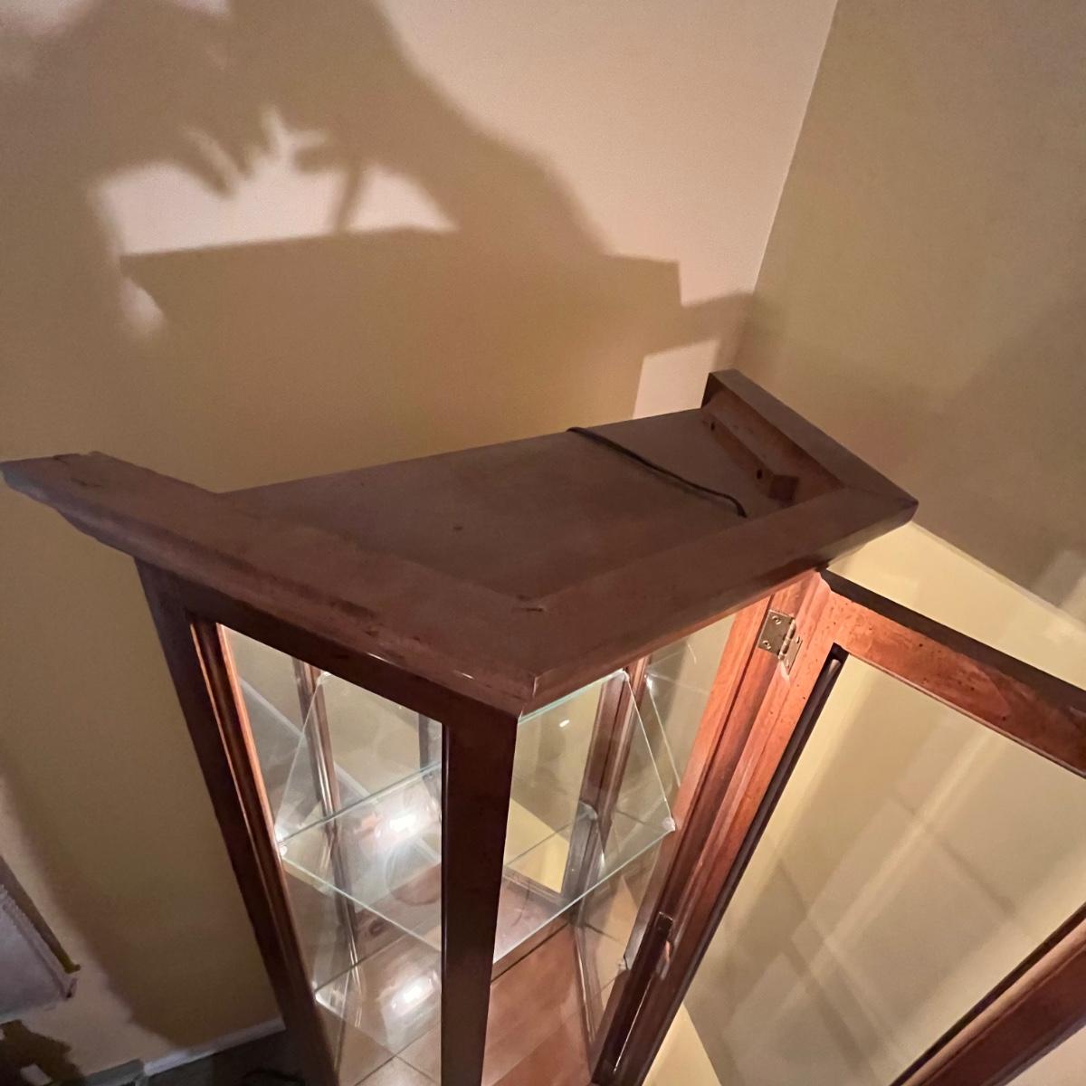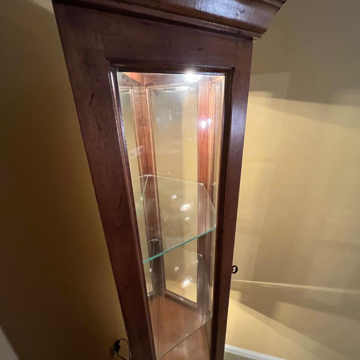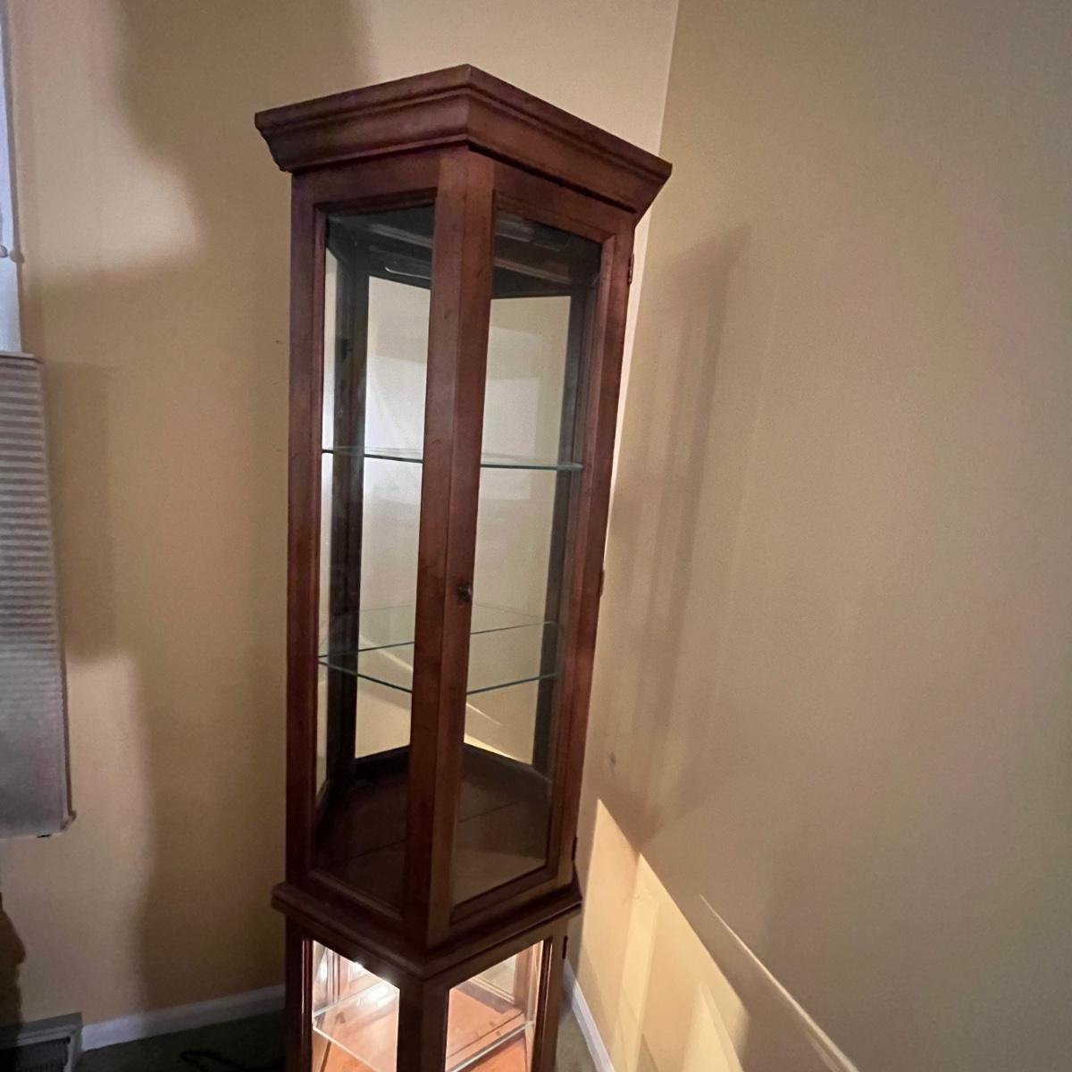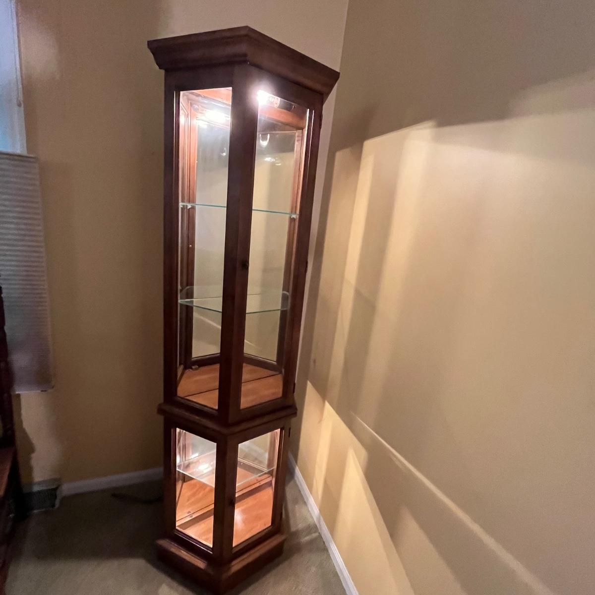 Lot includes a solid wood curio cabinet with two lights, mirrored back and three glass shelves. The glass shelves are removable for transport, but height is non-adjustable. Both lights worked when tested. Cabinet is shaped like an isosceles trapezoid and measures 12” x 21” x 70”.