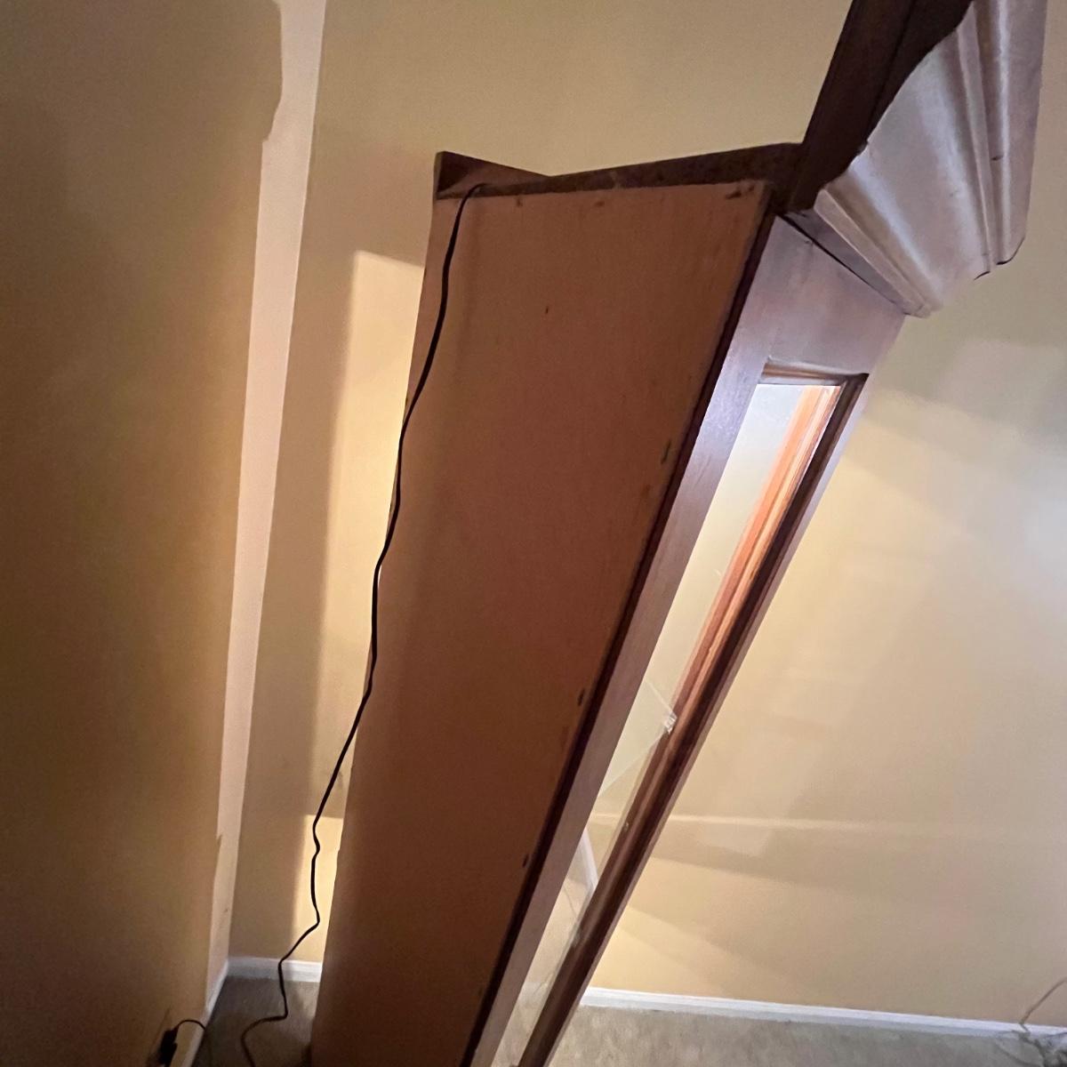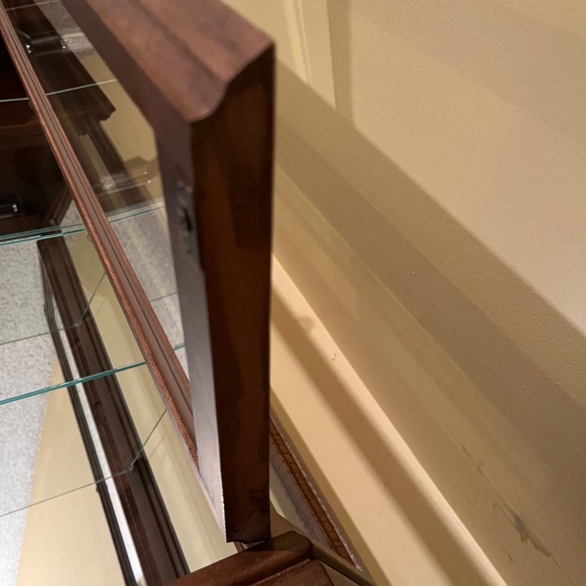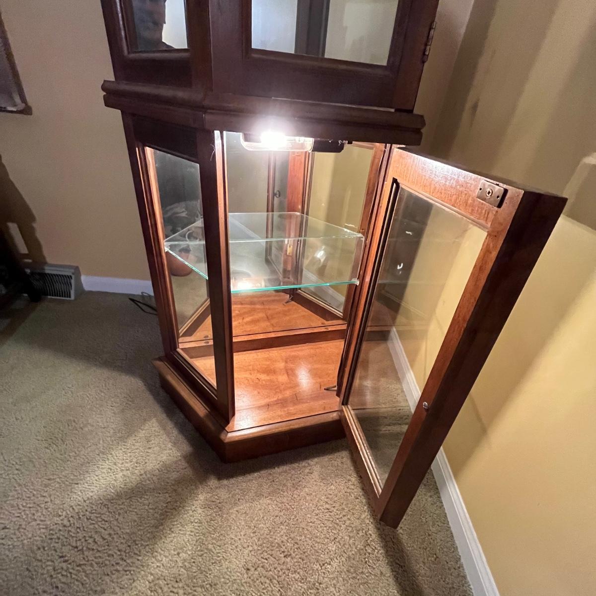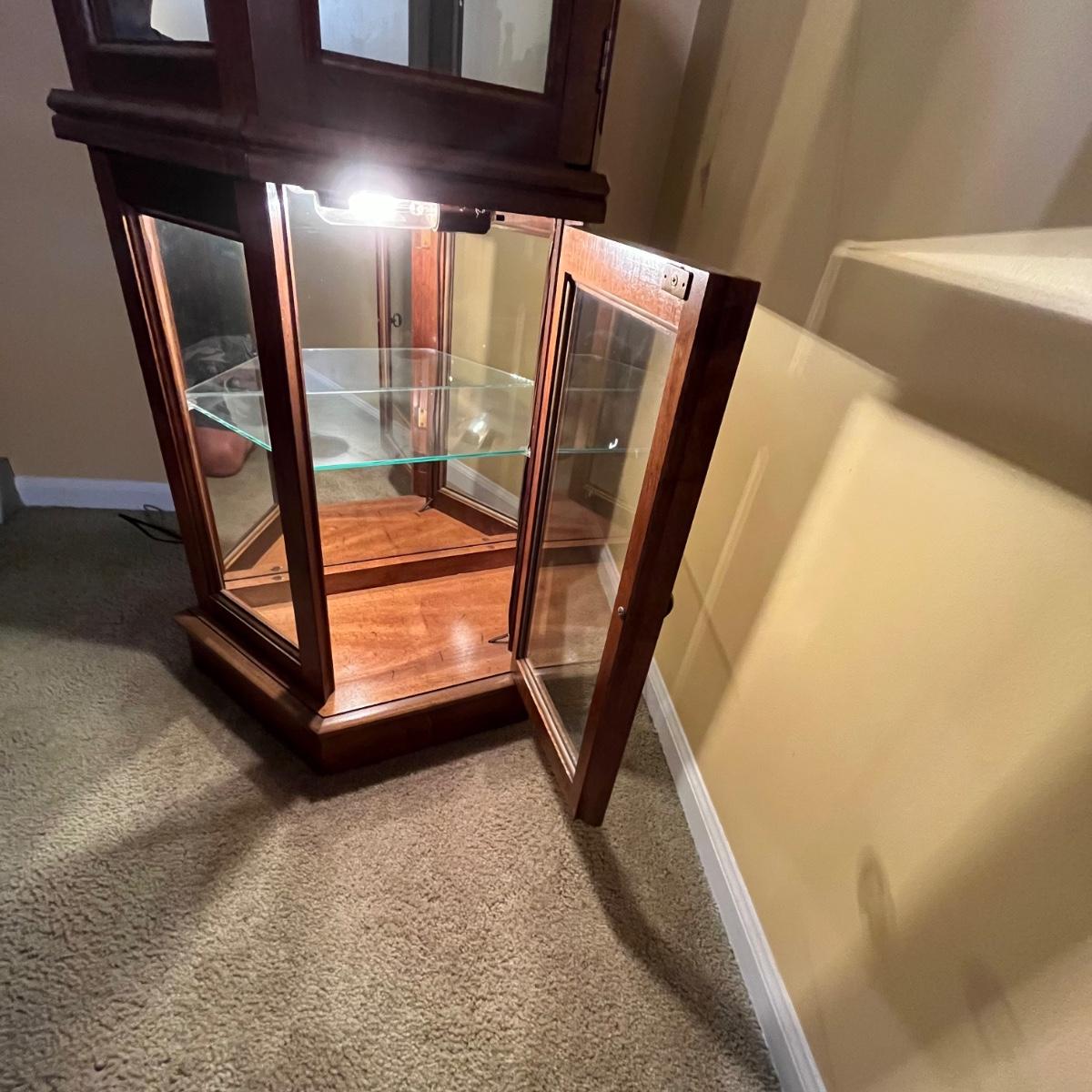 Lot includes a solid wood curio cabinet with two lights, mirrored back and three glass shelves. The glass shelves are removable for transport, but height is non-adjustable. Both lights worked when tested. Cabinet is shaped like an isosceles trapezoid and measures 12” x 21” x 70”.