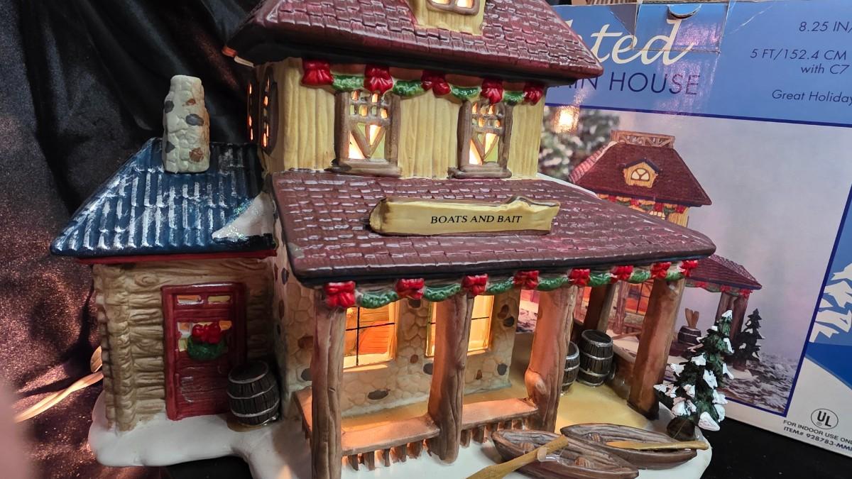 Lighted Porcelain “Boats & Bait” Holiday Village Marina House – Illuminated Collectible