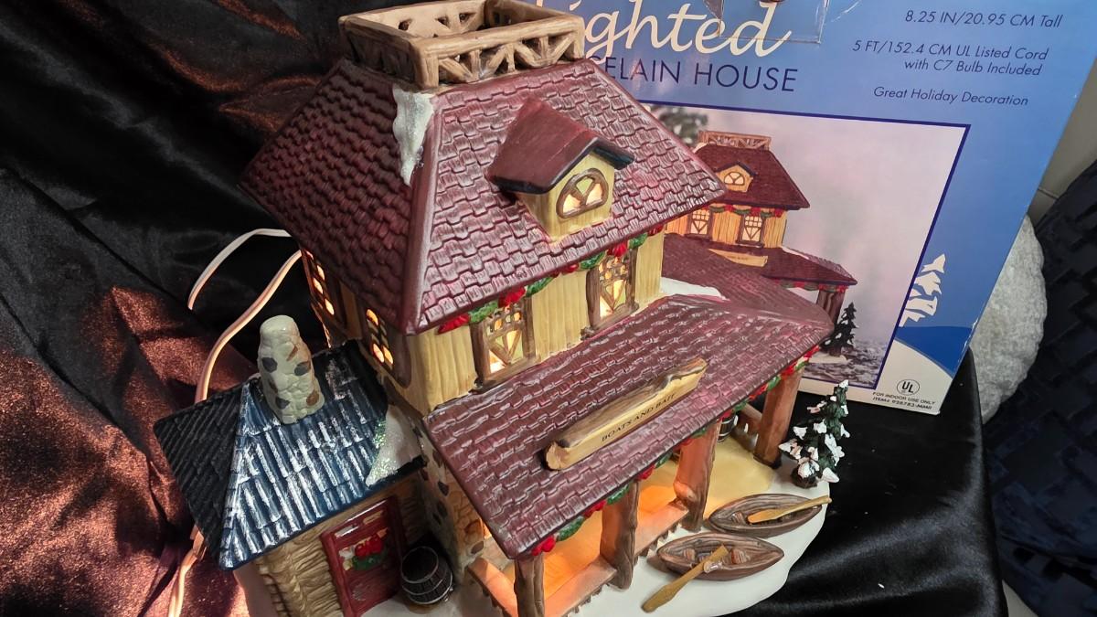A winter village isn’t complete without a cozy lakeside stop, and this beautifully illuminated “Boats & Bait” Marina House brings that perfect storybook charm. Hand-painted porcelain with warm glowing windows, this piece is full of character—stone chimney, wood-beam porch, snow-tipped roof, holiday garland, and a pair of rowboats waiting on the dock for early morning fishing at the frozen lake’s edge.