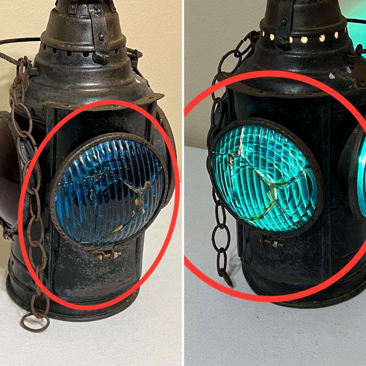 Lamp has surface rust & only 1 light cover has been repaired, I wanted to show you with it on & off, see photos ~ 16” H x 9” Round ~ Made into a hanging lantern (plug in)