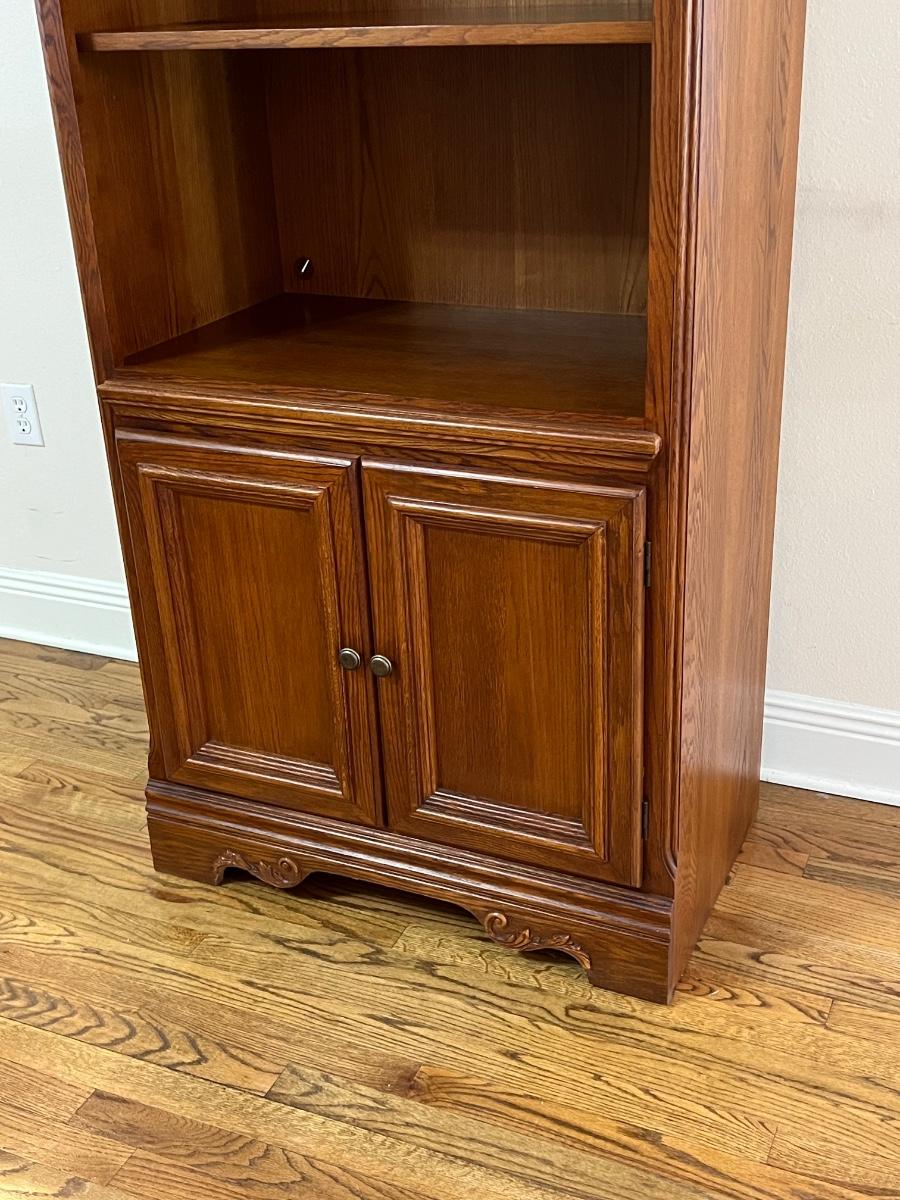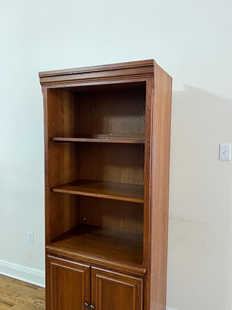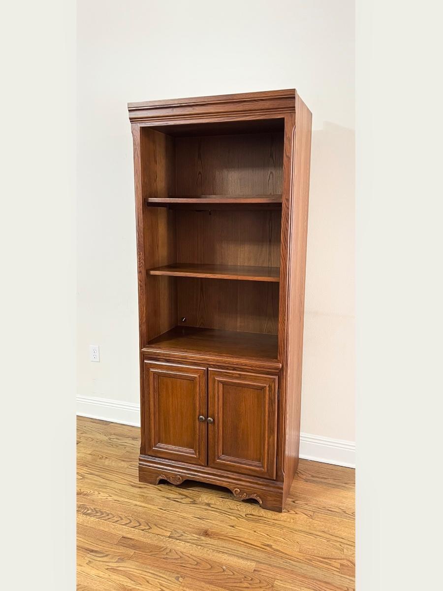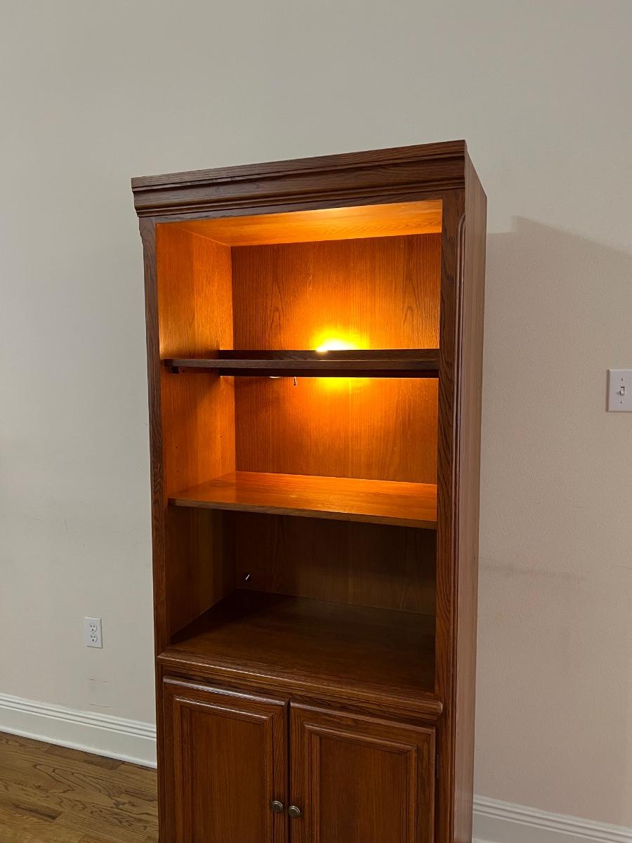 1 piece ~ Shelf in cabinet is adjustable & the middle shelf on bookshelf is adjustable ~ Needs a new bulb ~ No brand name ~ 74” H x 30” W x 19” D