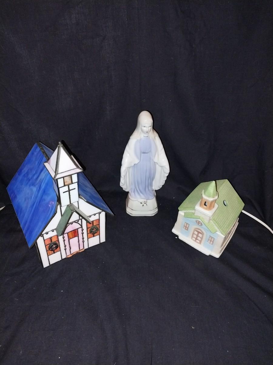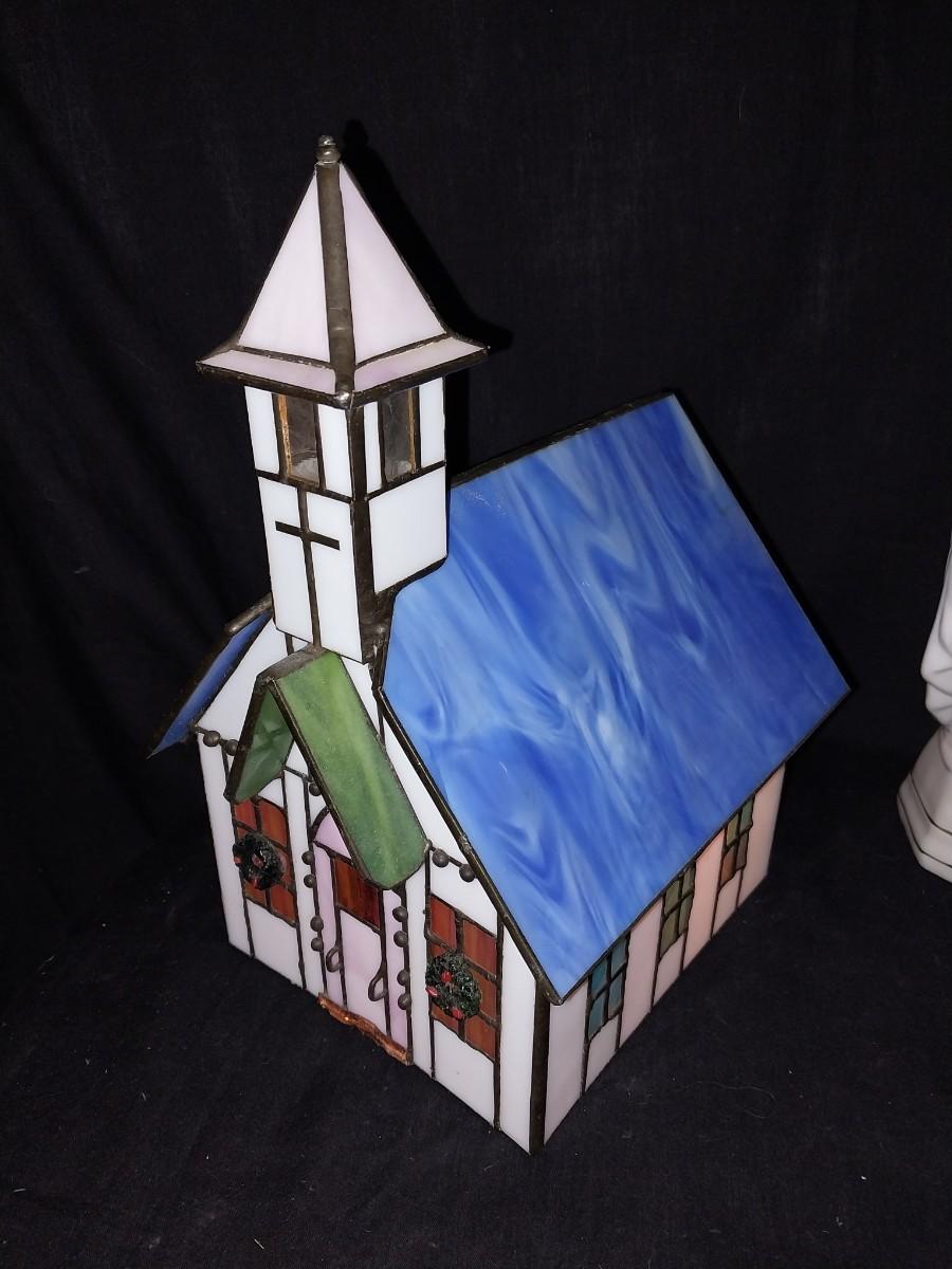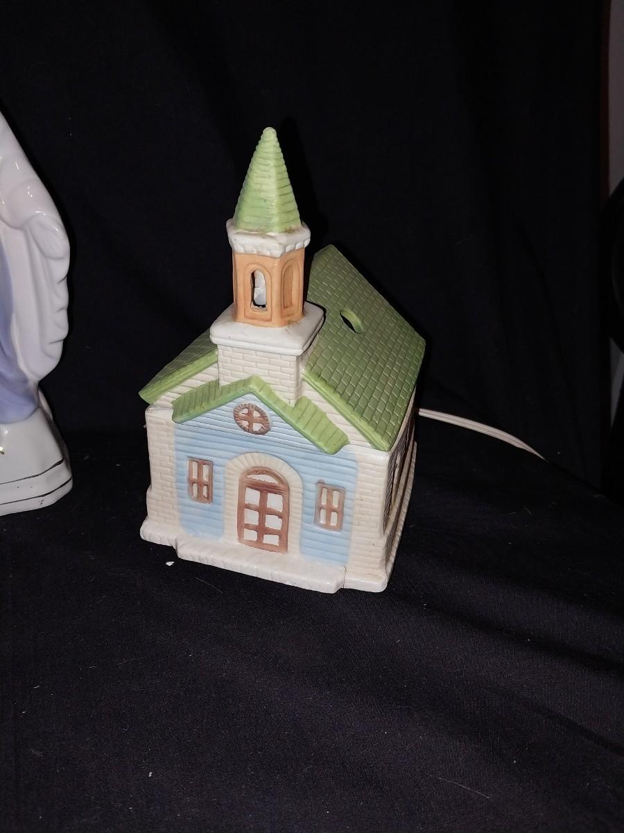 LIGHTED STAINGLASS CHURCH-LIGHTED CERAMIC CHURCH AND CERAMIC MOTHER MARY FIGURINE