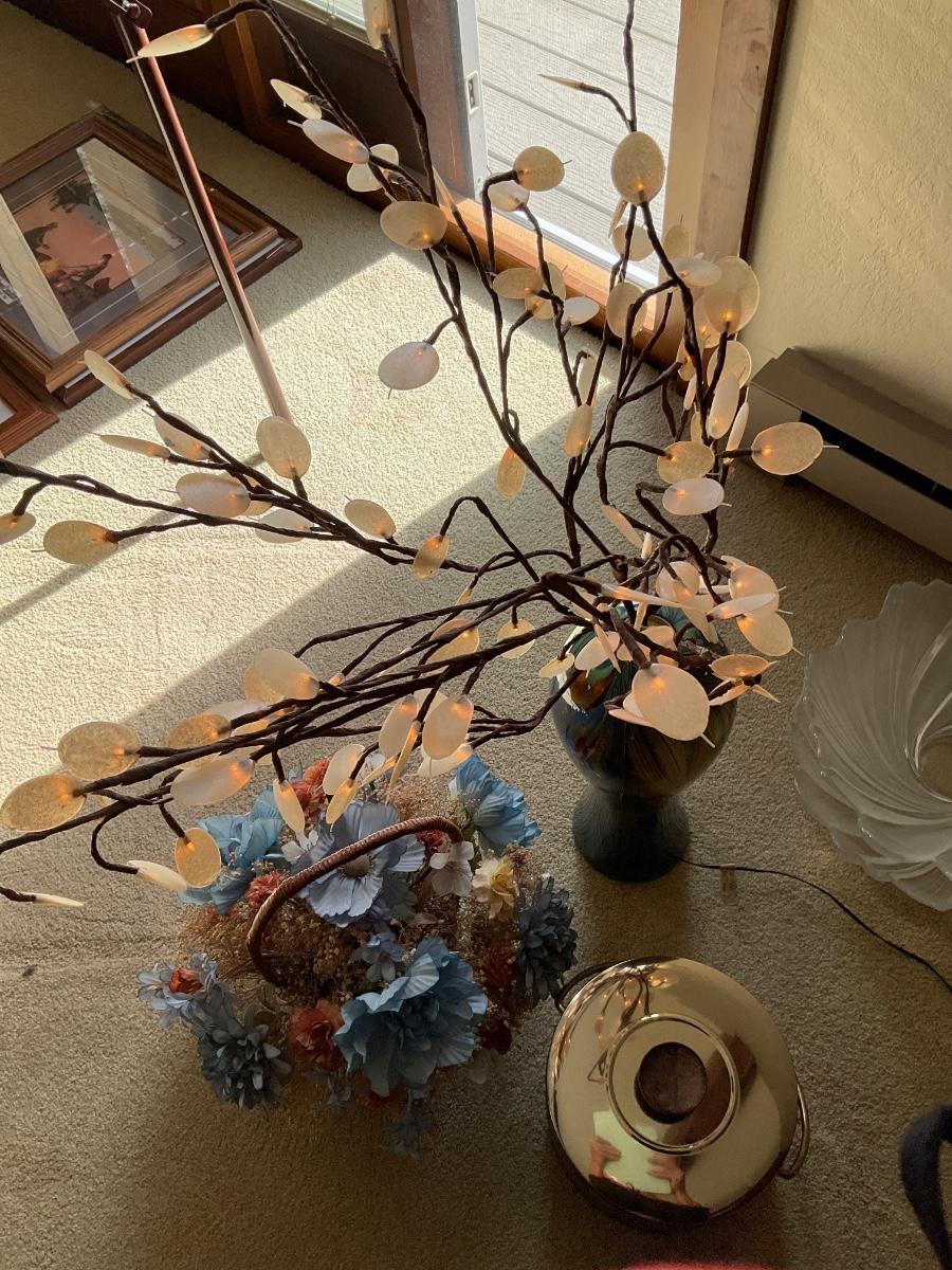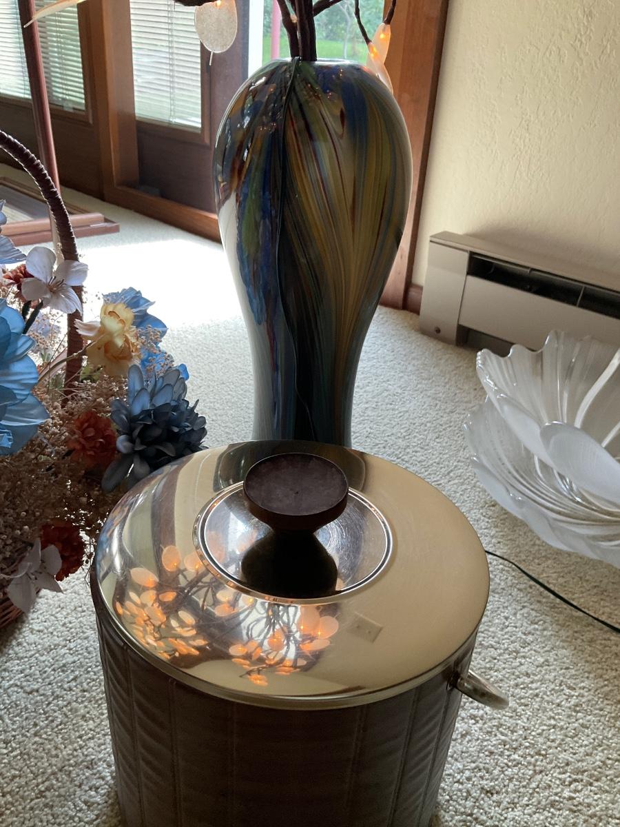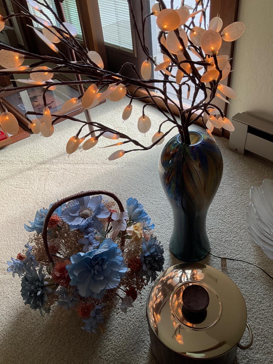 Lighted tree, basket of flowers & ice bucket
