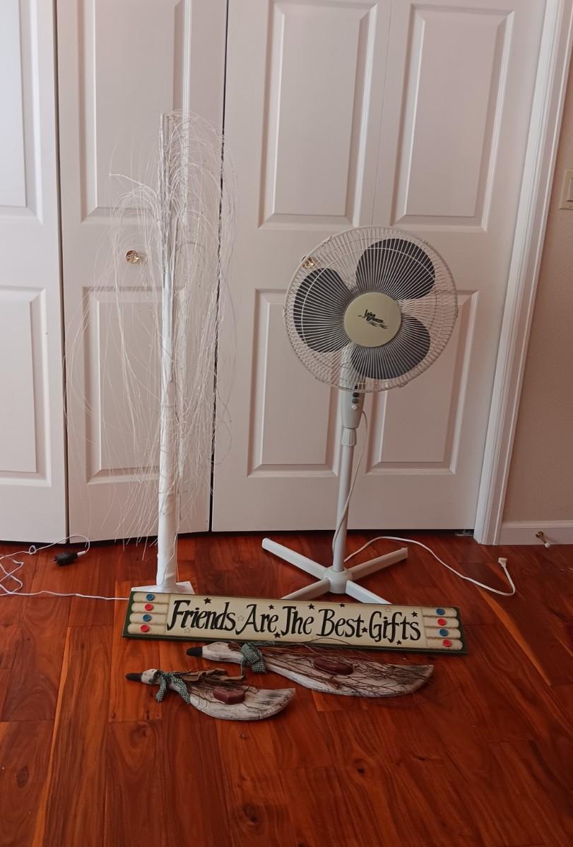 LIGHTED TREE, FLOOR FAN AND WALL HANGINGS