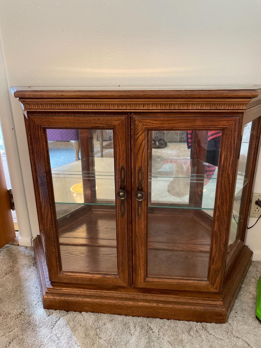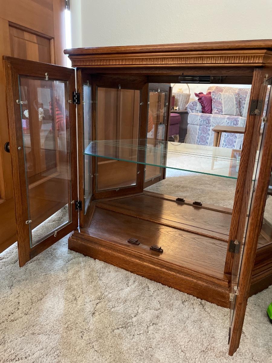 Lighted glass and wood display case with mirror backing