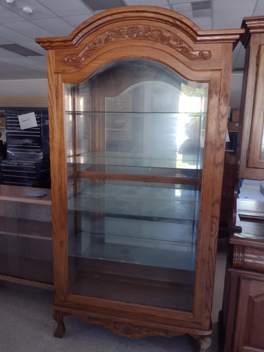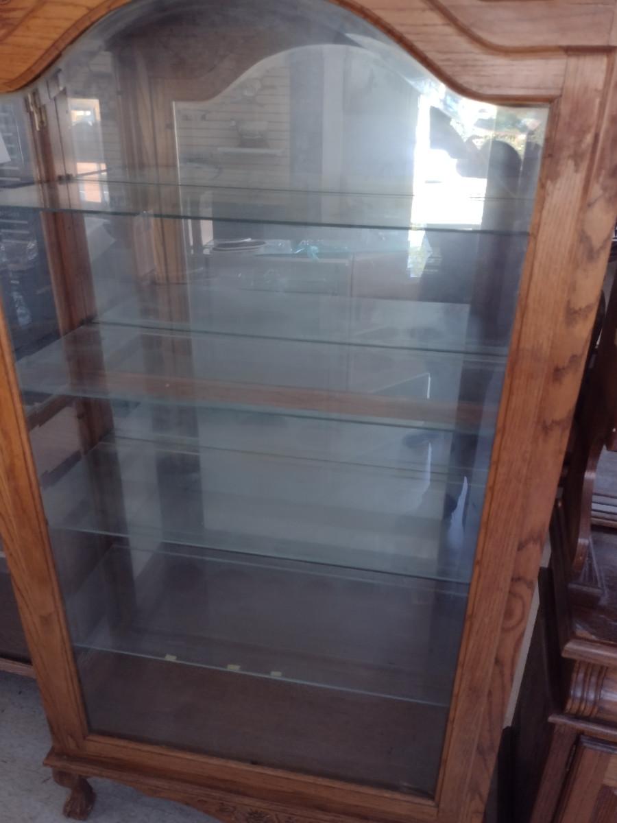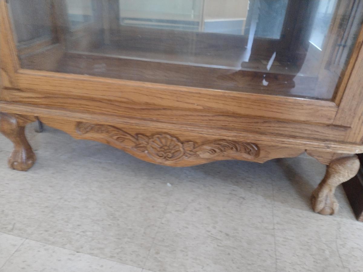 Lighted Wood and Glass Display Cabinet. Please see all pictures- item has some damage and will need a new cord for the light. Item measures approx 80 1/4" tall.