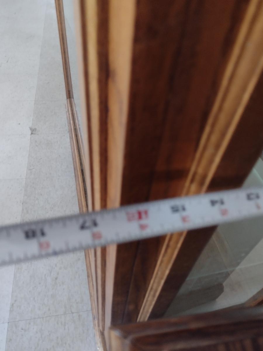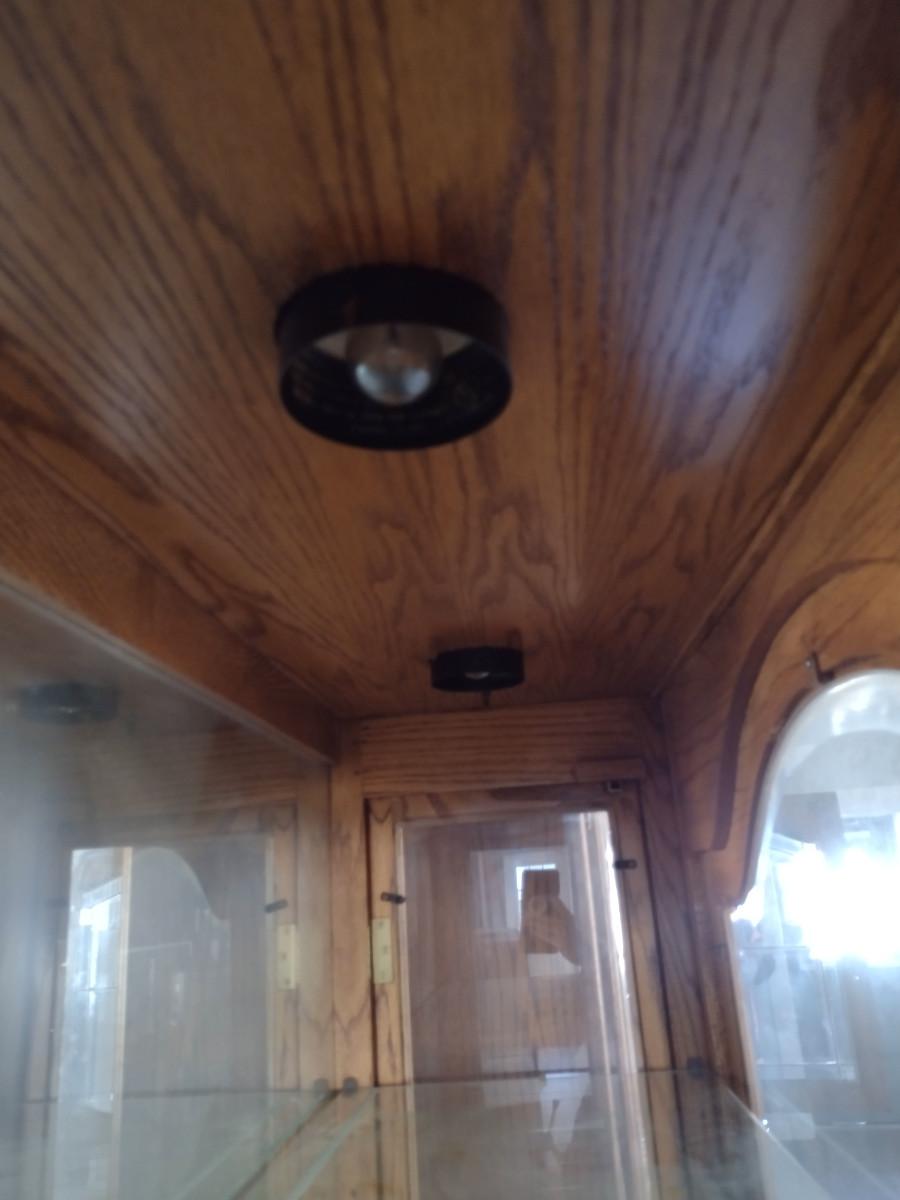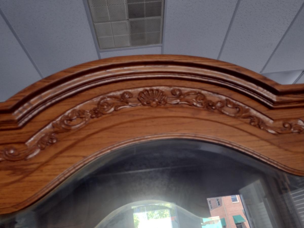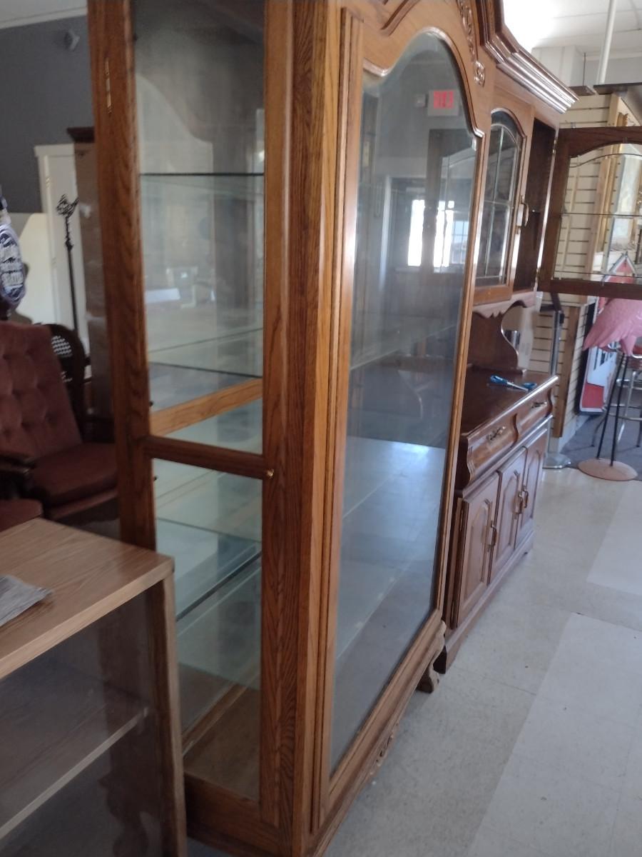 Lighted Wood and Glass Display Cabinet. Please see all pictures- item has some damage and will need a new cord for the light. Item measures approx 80 1/4" tall.