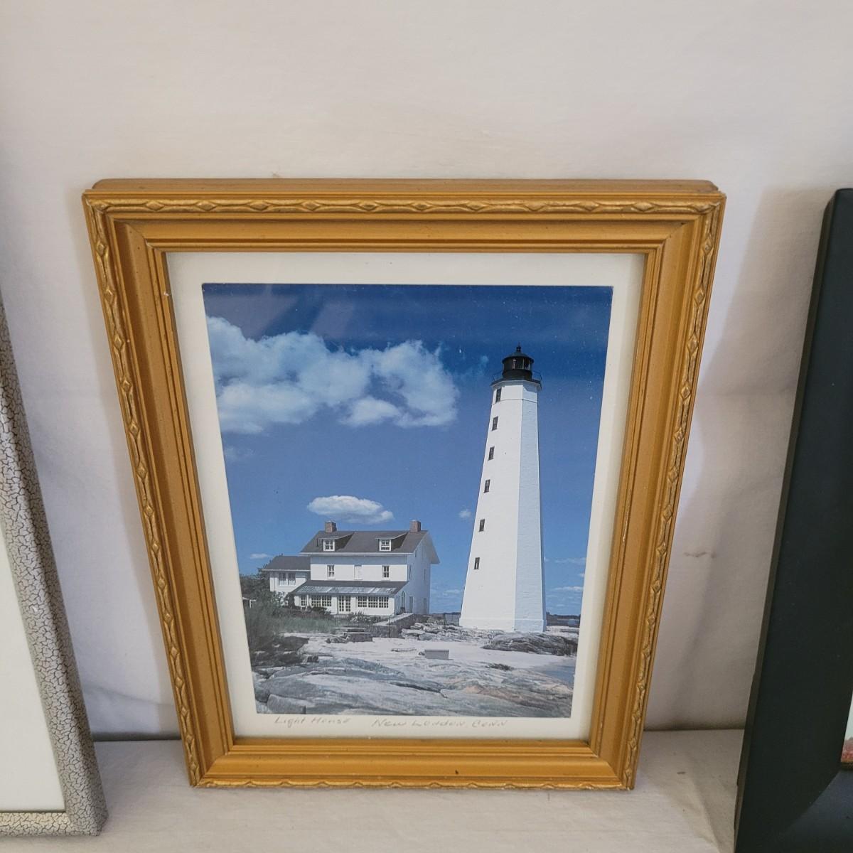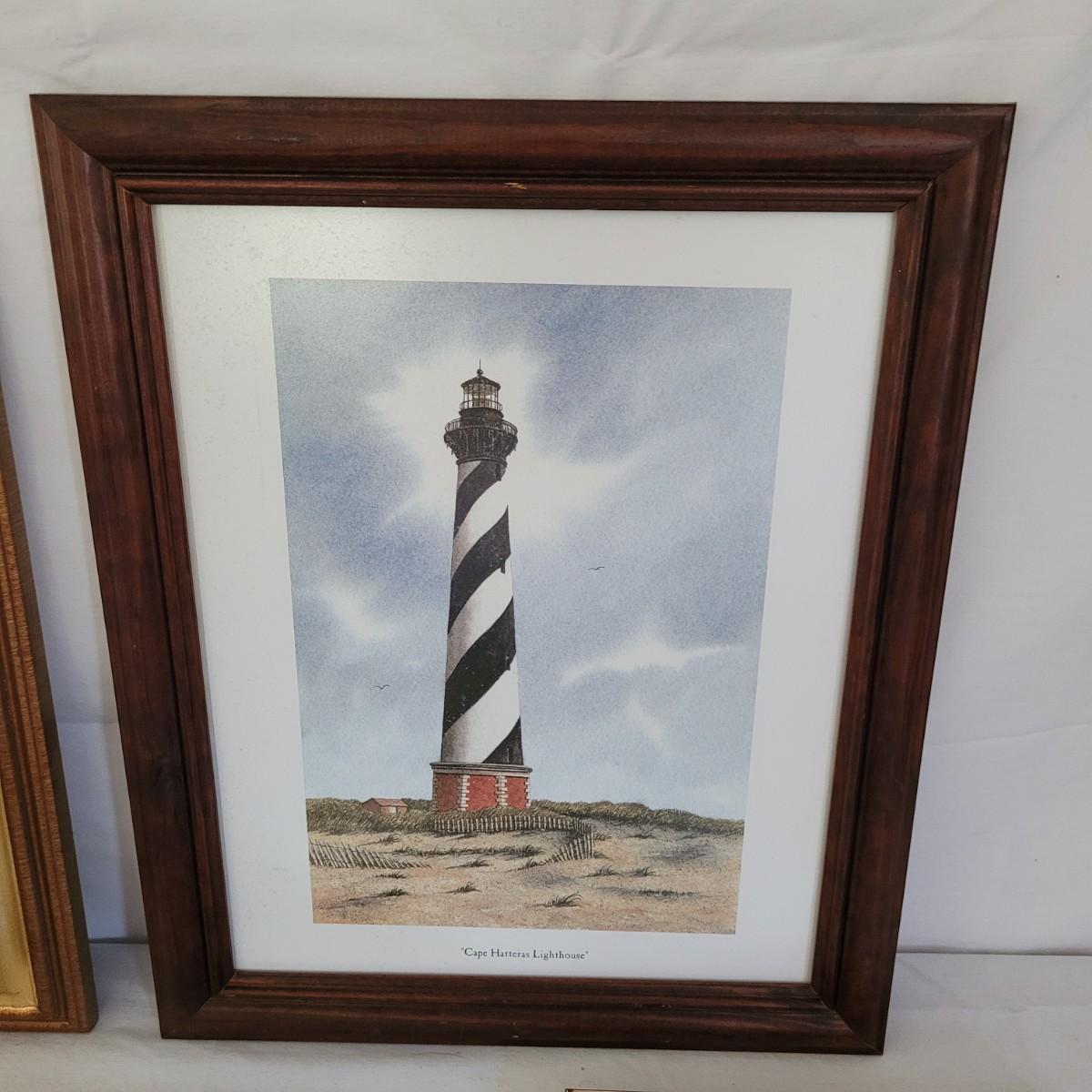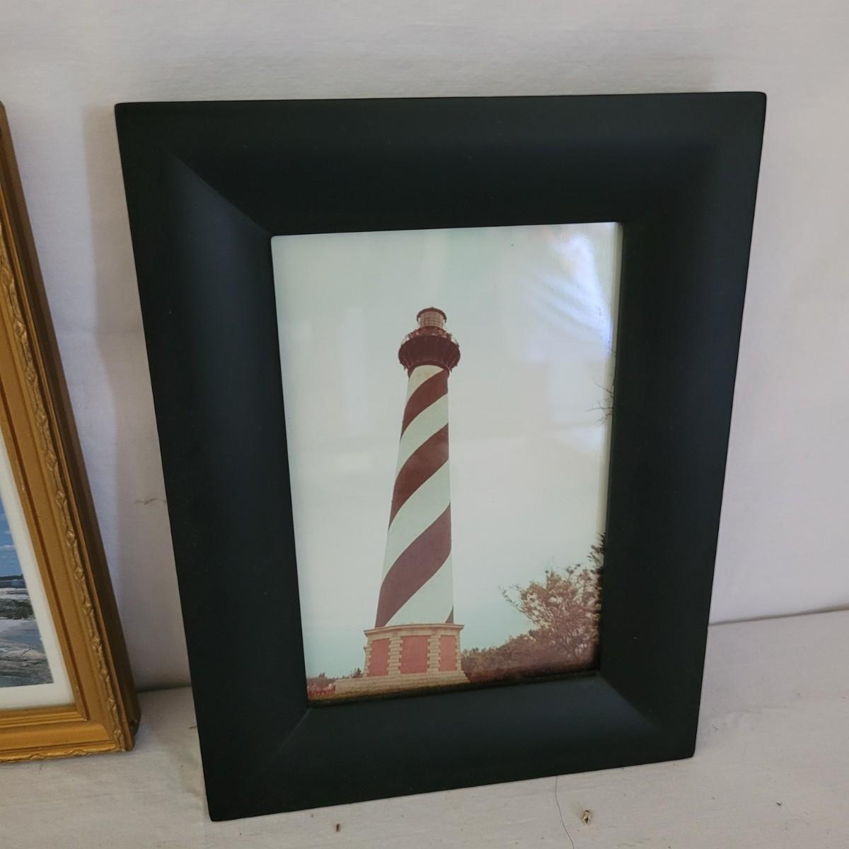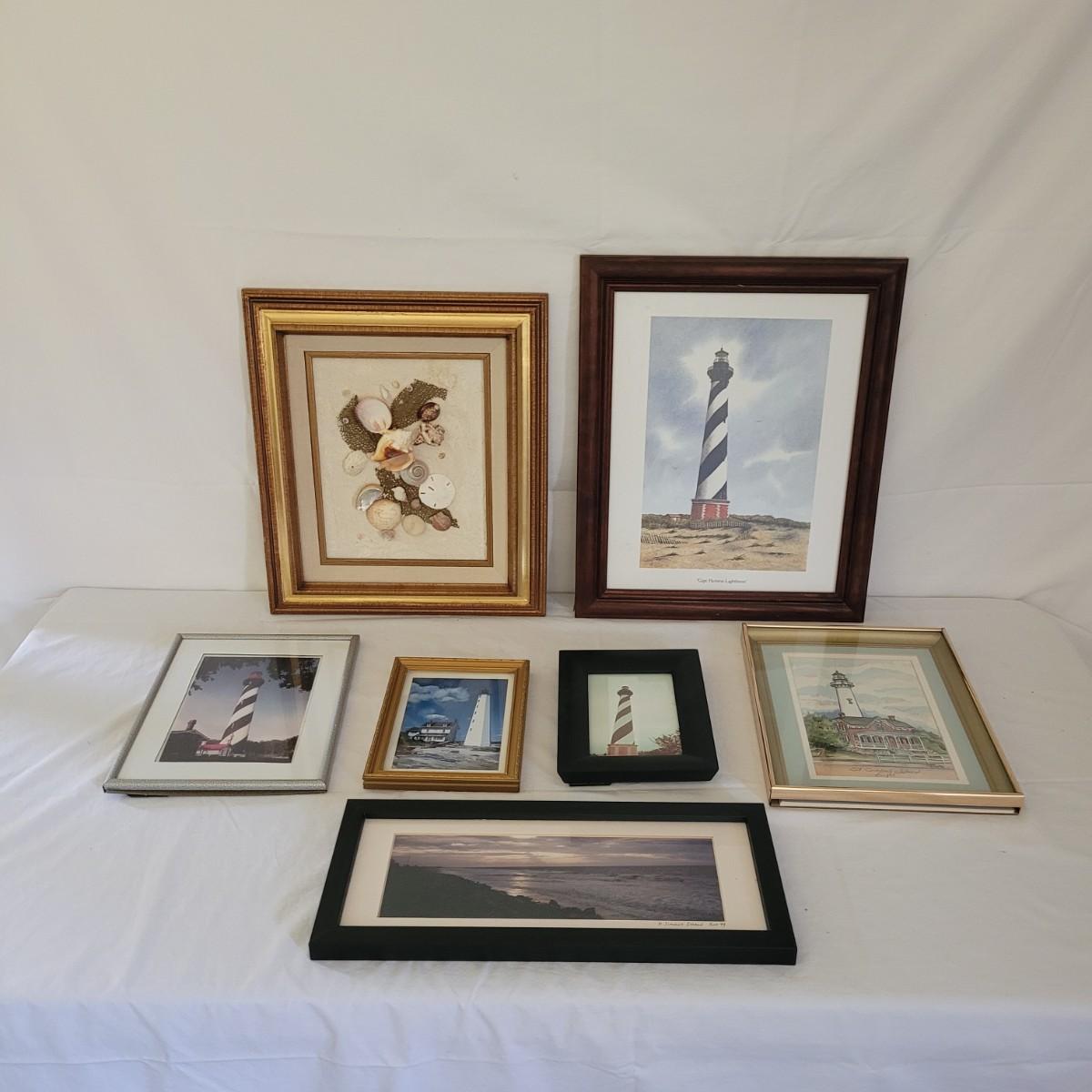 This collection of lighthouse and ocean themed art includes photos from St. Simons Island, Cape Hatteras and New London, CT, as well as a framed display of ocean shells and flora. All pices have wooden frames, except the St. Simons Lighthouse that has a metal frame. Shell artwork measures approximately 15” x 13.” Shipping available.