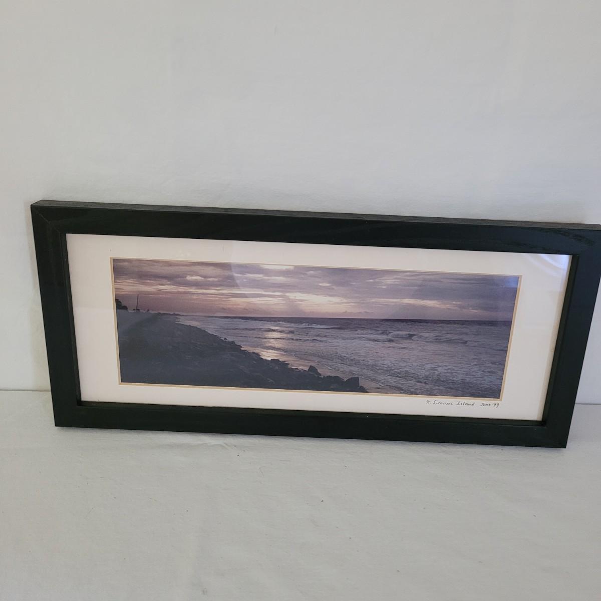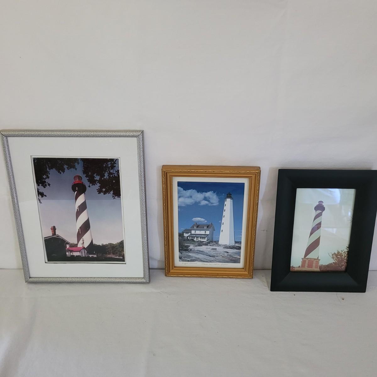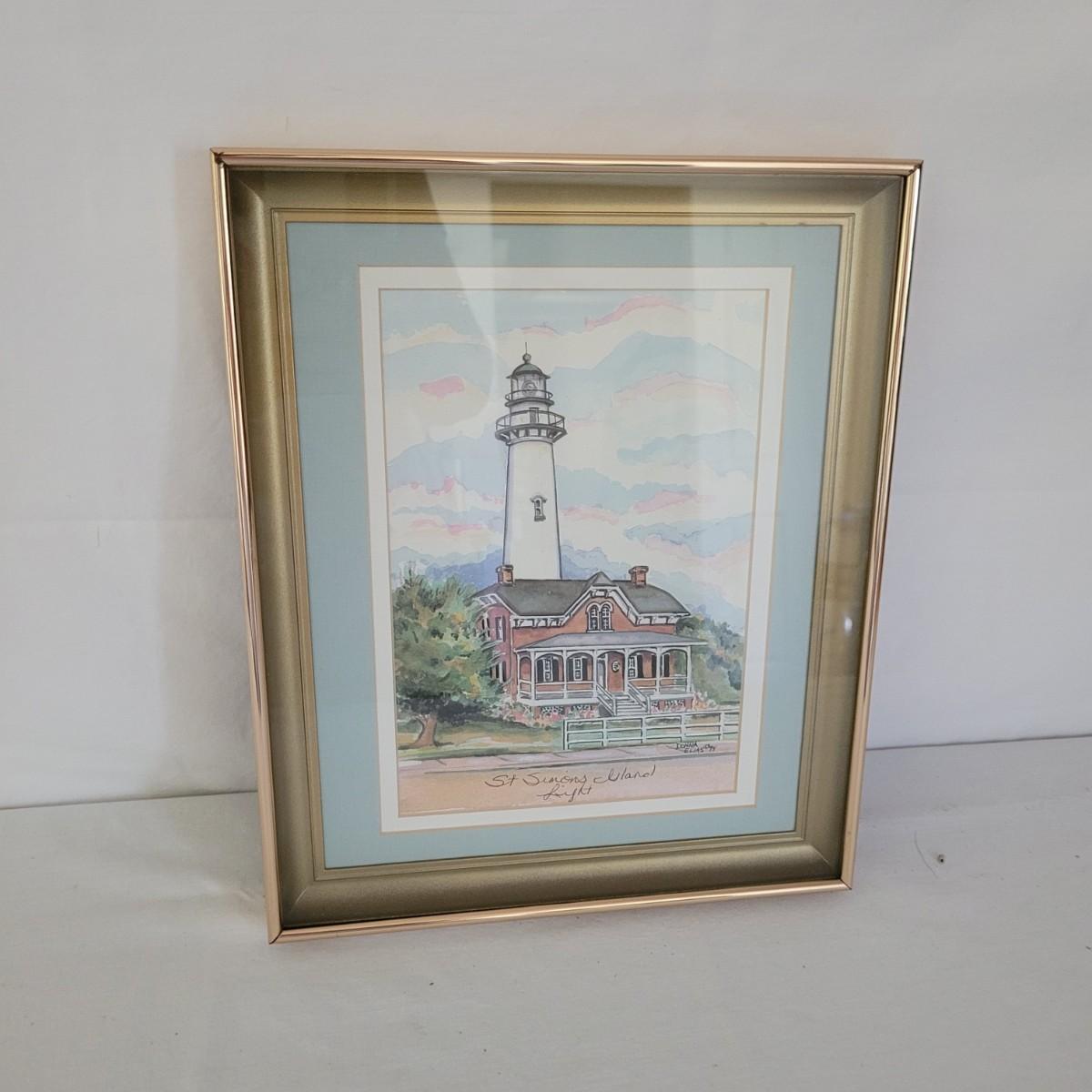 This collection of lighthouse and ocean themed art includes photos from St. Simons Island, Cape Hatteras and New London, CT, as well as a framed display of ocean shells and flora. All pices have wooden frames, except the St. Simons Lighthouse that has a metal frame. Shell artwork measures approximately 15” x 13.” Shipping available.