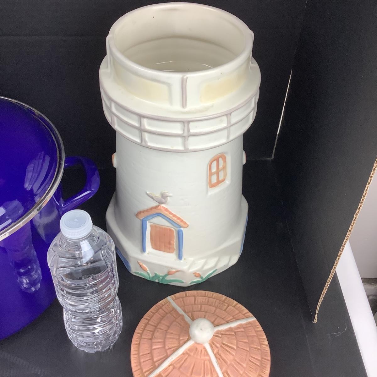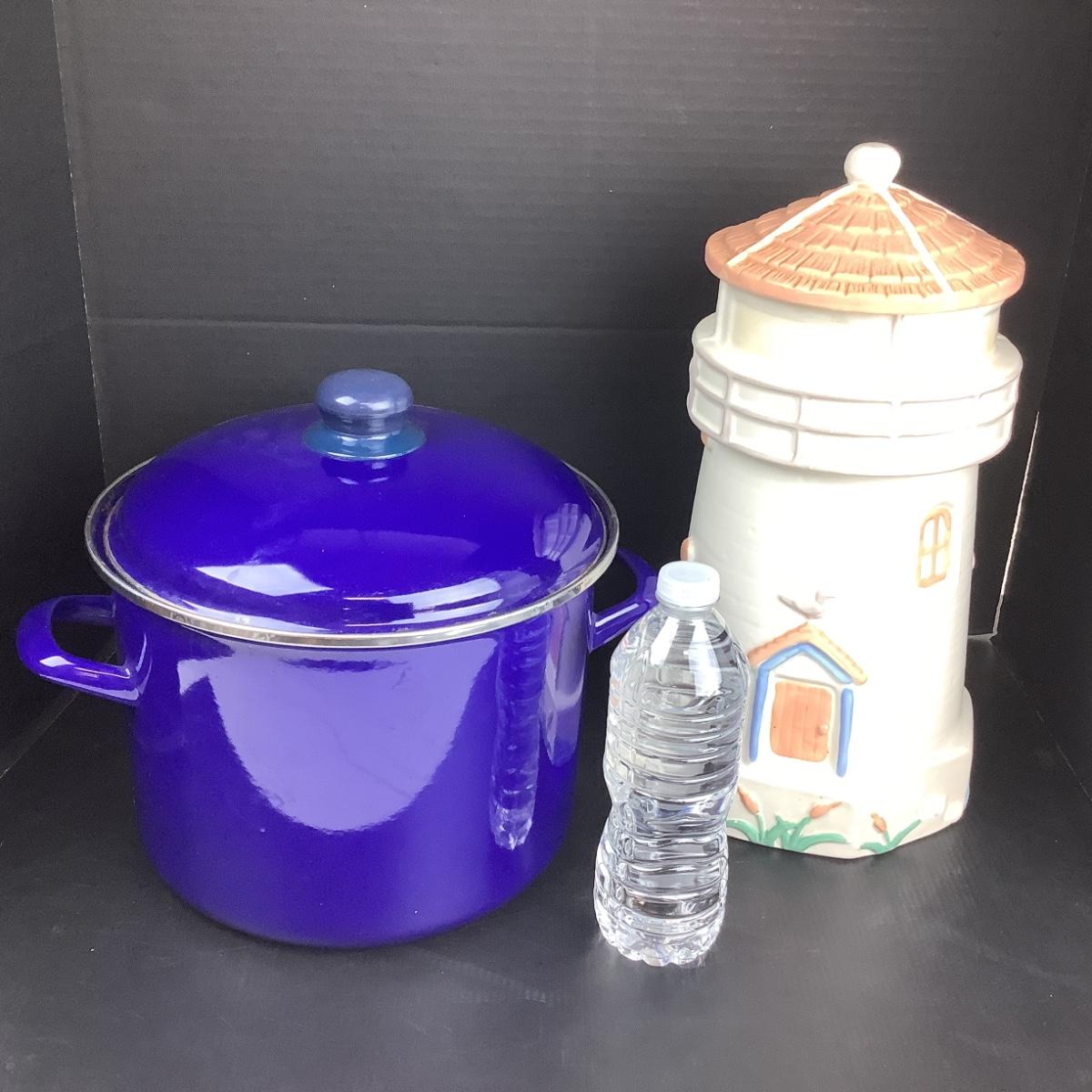 Treasure craft USA lighthouse cookie jar is 15" tall. Stock pot is 10" in diameter and 8" tall.