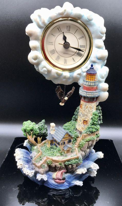 Lighthouse cottage themed table clock. Battery operated.