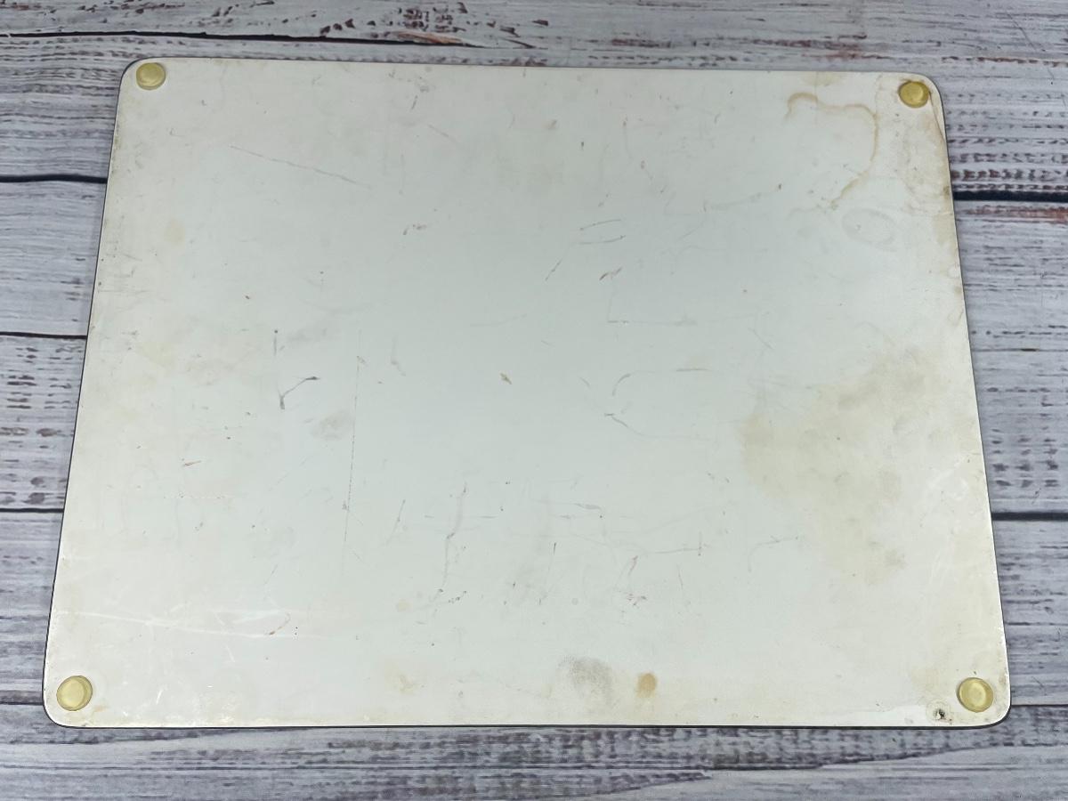 Item is in good condition. There is some white spots in the front and on the back there are some stains and scratches. This item is approximately 15” wide and 11” tall.