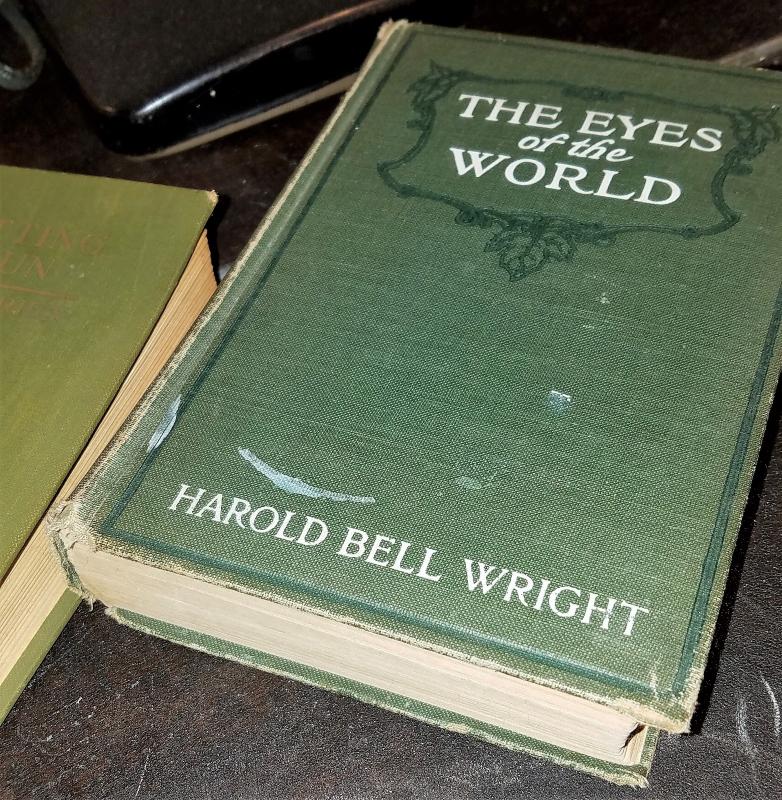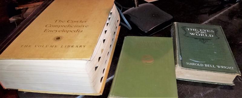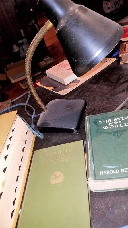 Old adjustable desk lamp and world adviser reading by Howard bell and other hardcover books