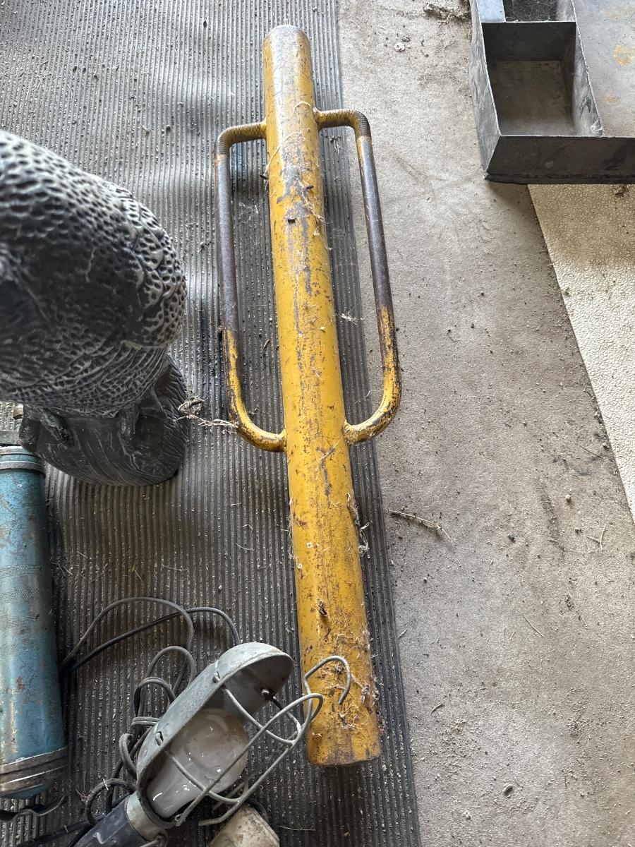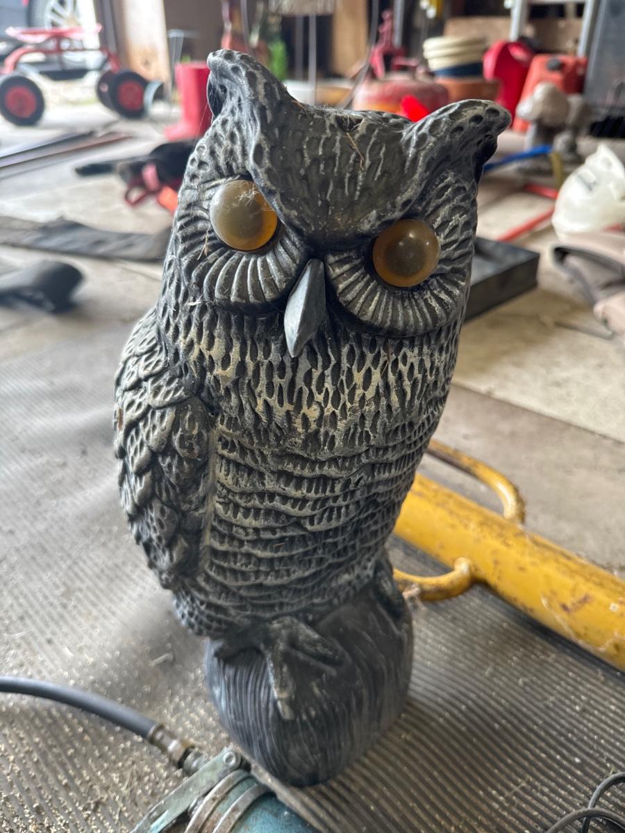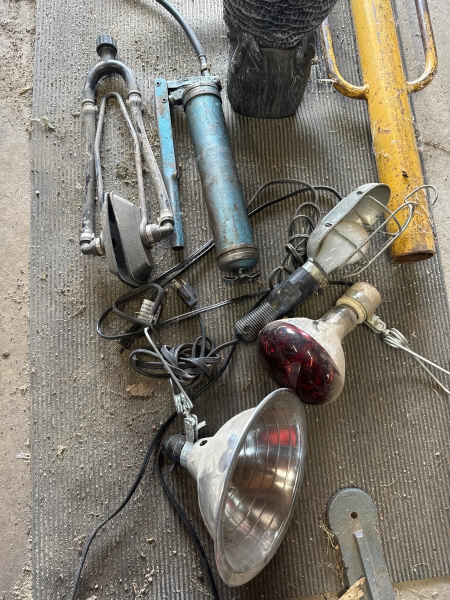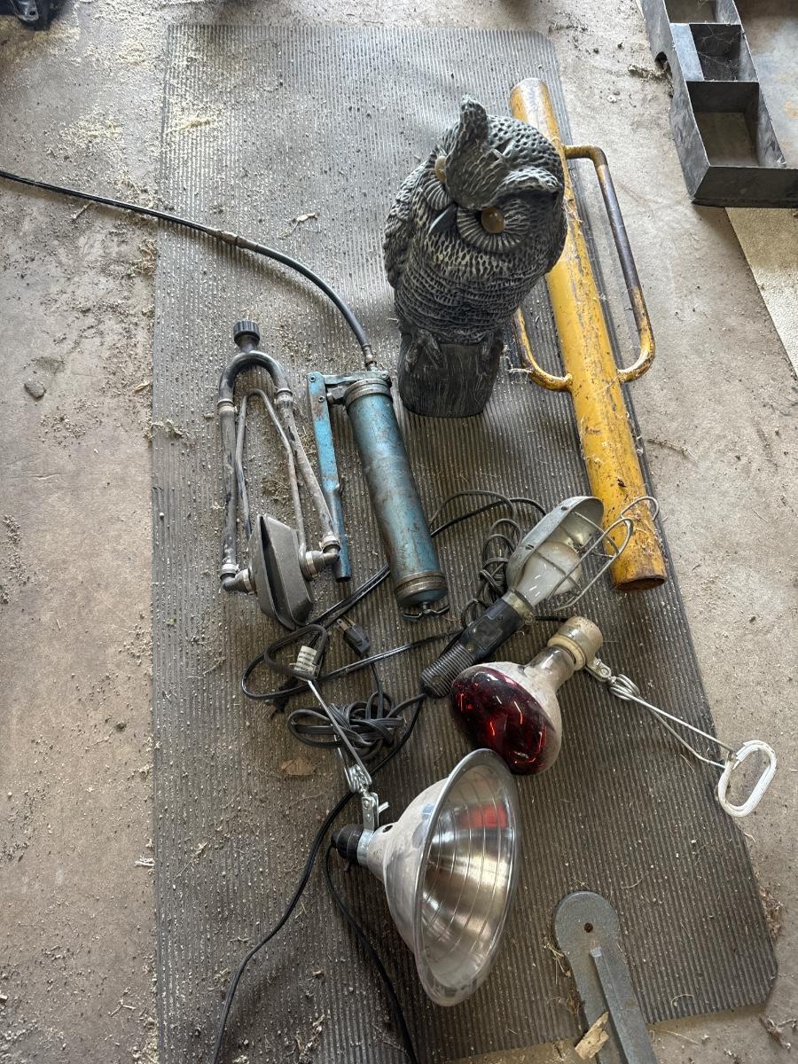 Lights, grease gun, owl decor, steel post driver and boat motor flush tool