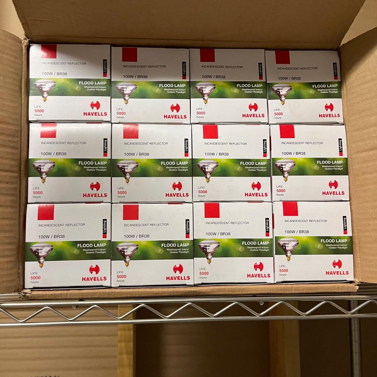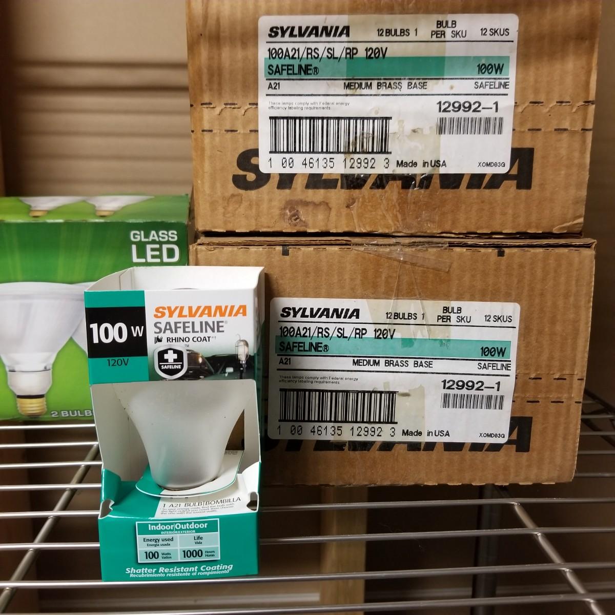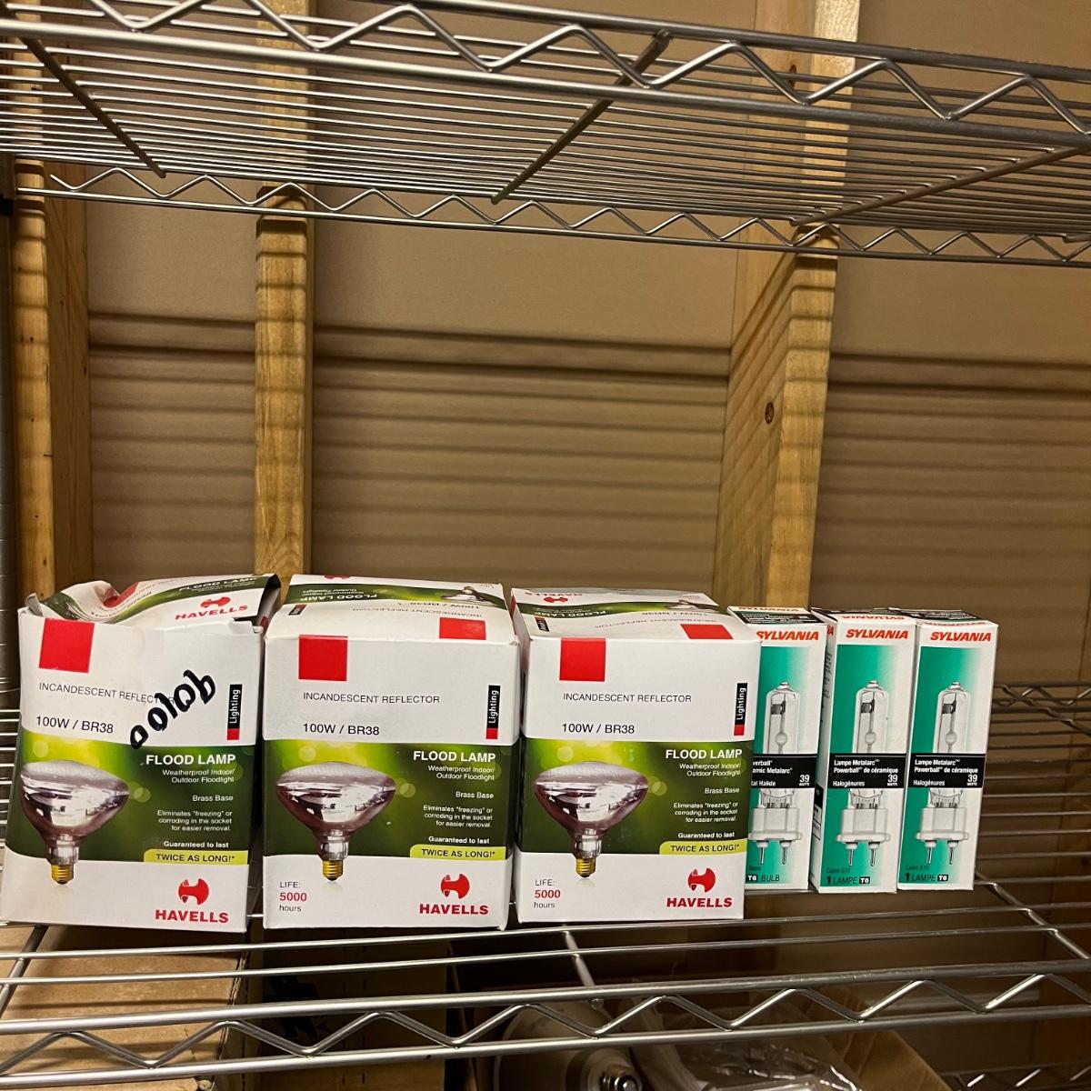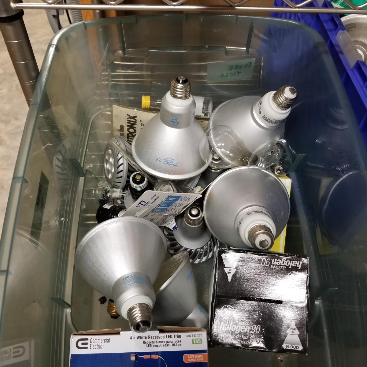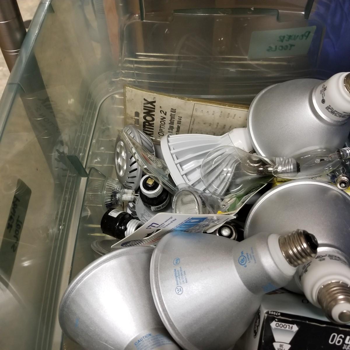 Floodlights, halogen bulbs, fluorescent tubes, incandescent bulbs, CFL bulbs. Hundreds of assorted bulbs in various wattages. Some candelabra base bulbs as well as standard size. One undercabinet fluorescent fixture, untested. See photos for details. We cannot guarantee that all lights function. Also includes fifteen Havells flood lights and twelve Sylvania Metalarc bulb T6. Local pickup only.