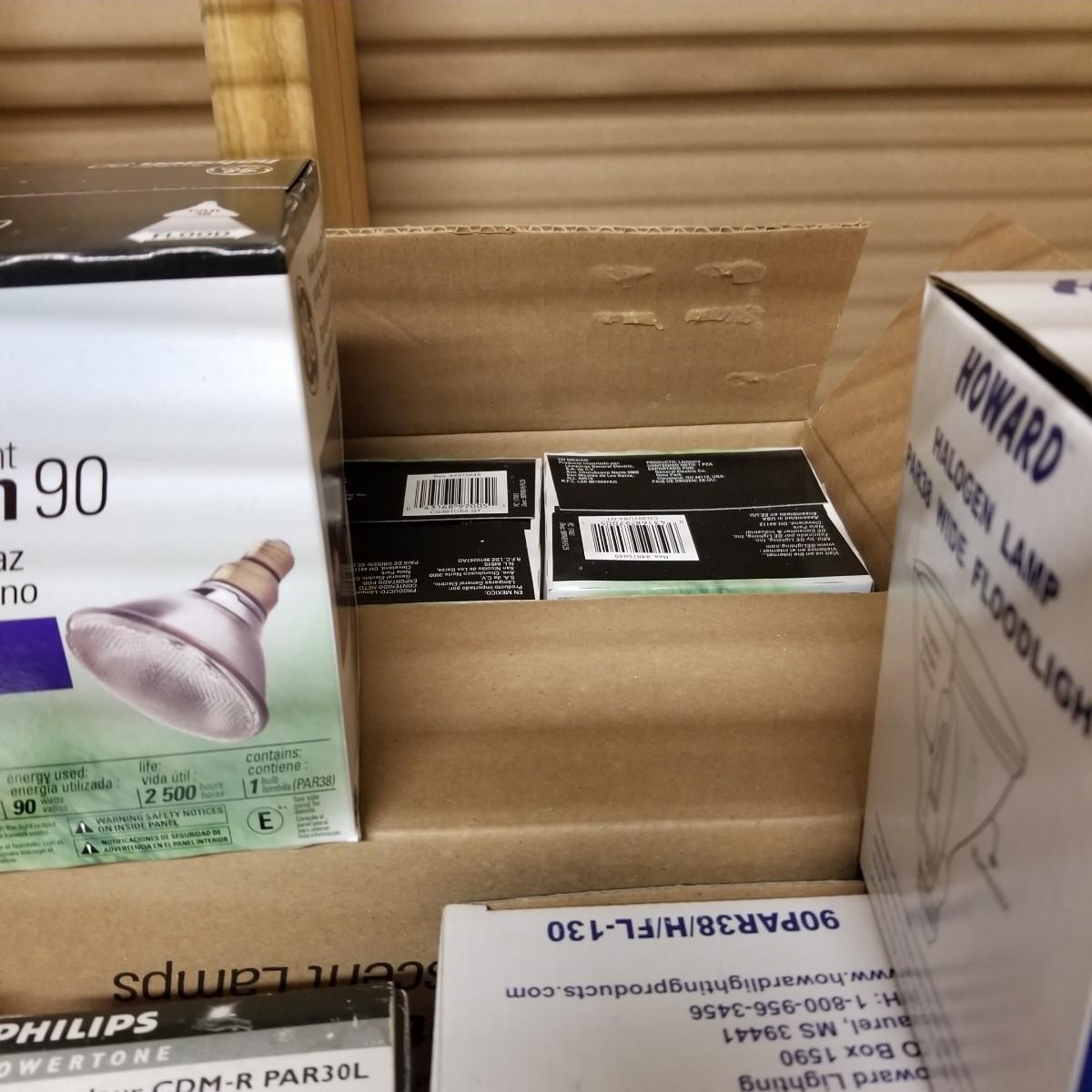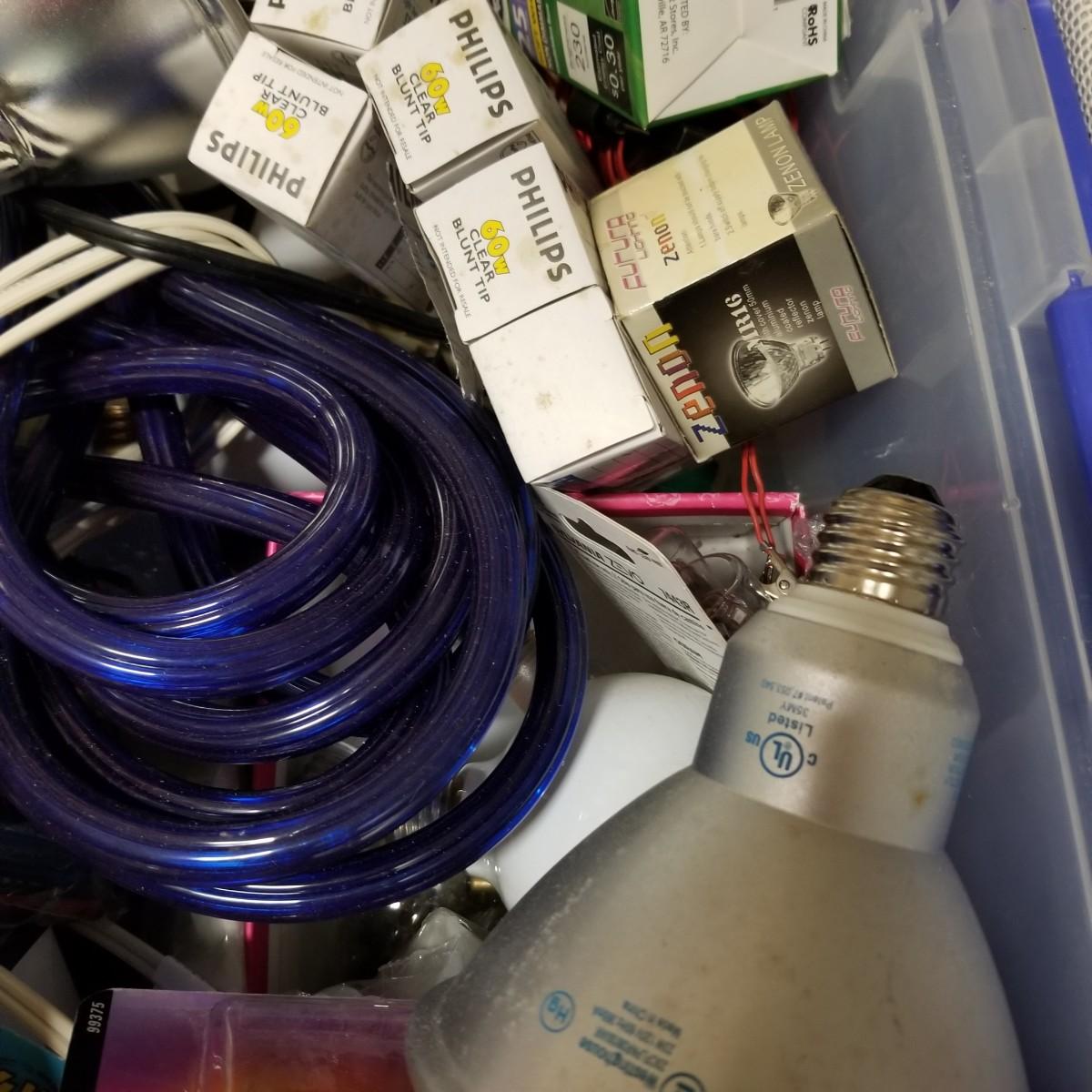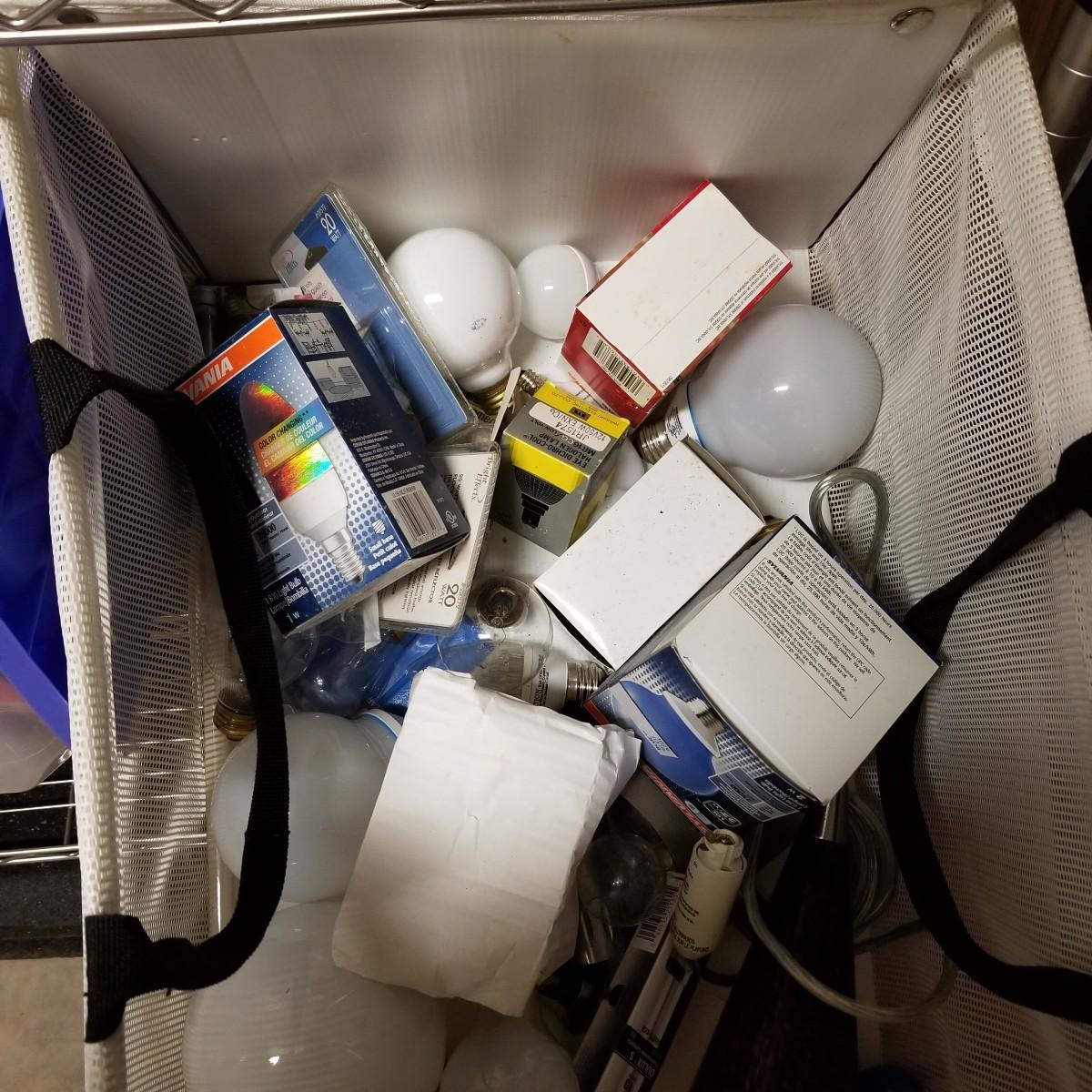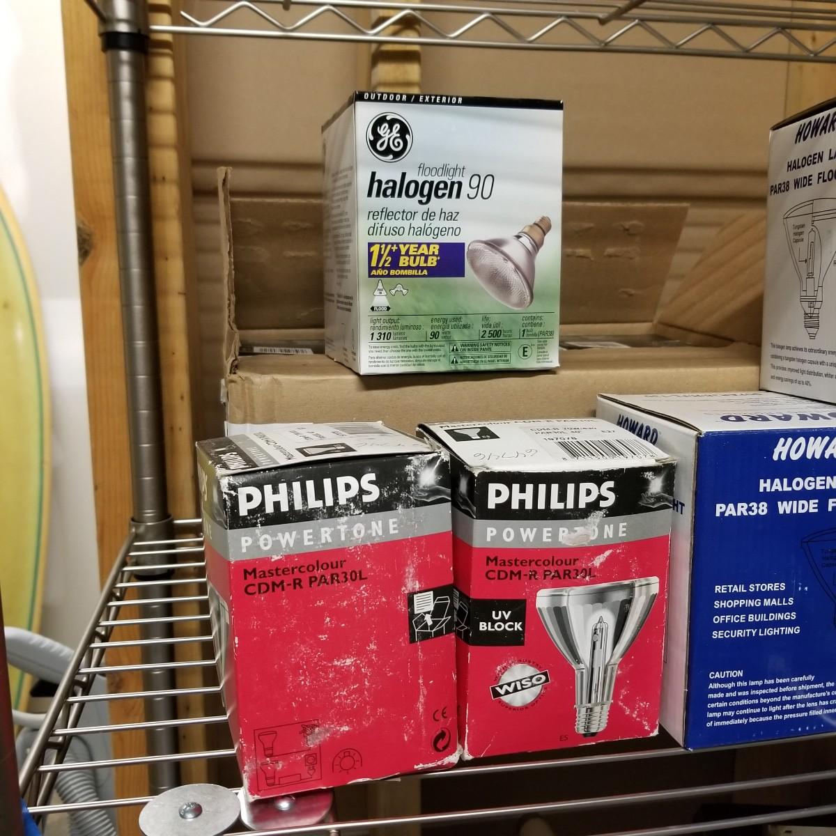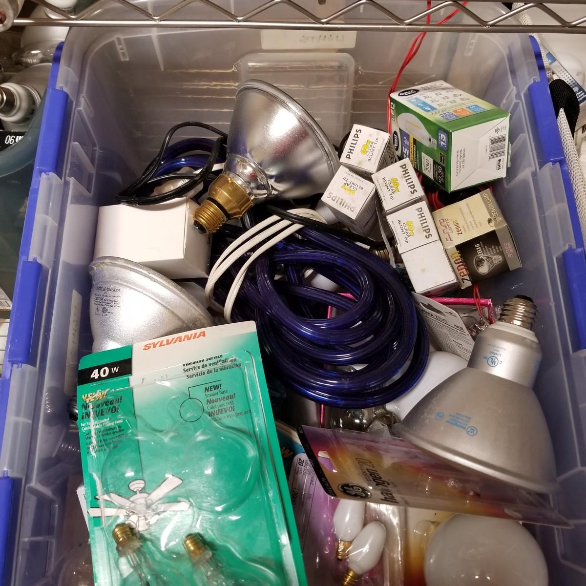 Floodlights, halogen bulbs, fluorescent tubes, incandescent bulbs, CFL bulbs. Hundreds of assorted bulbs in various wattages. Some candelabra base bulbs as well as standard size. One undercabinet fluorescent fixture, untested. See photos for details. We cannot guarantee that all lights function. Also includes fifteen Havells flood lights and twelve Sylvania Metalarc bulb T6. Local pickup only.