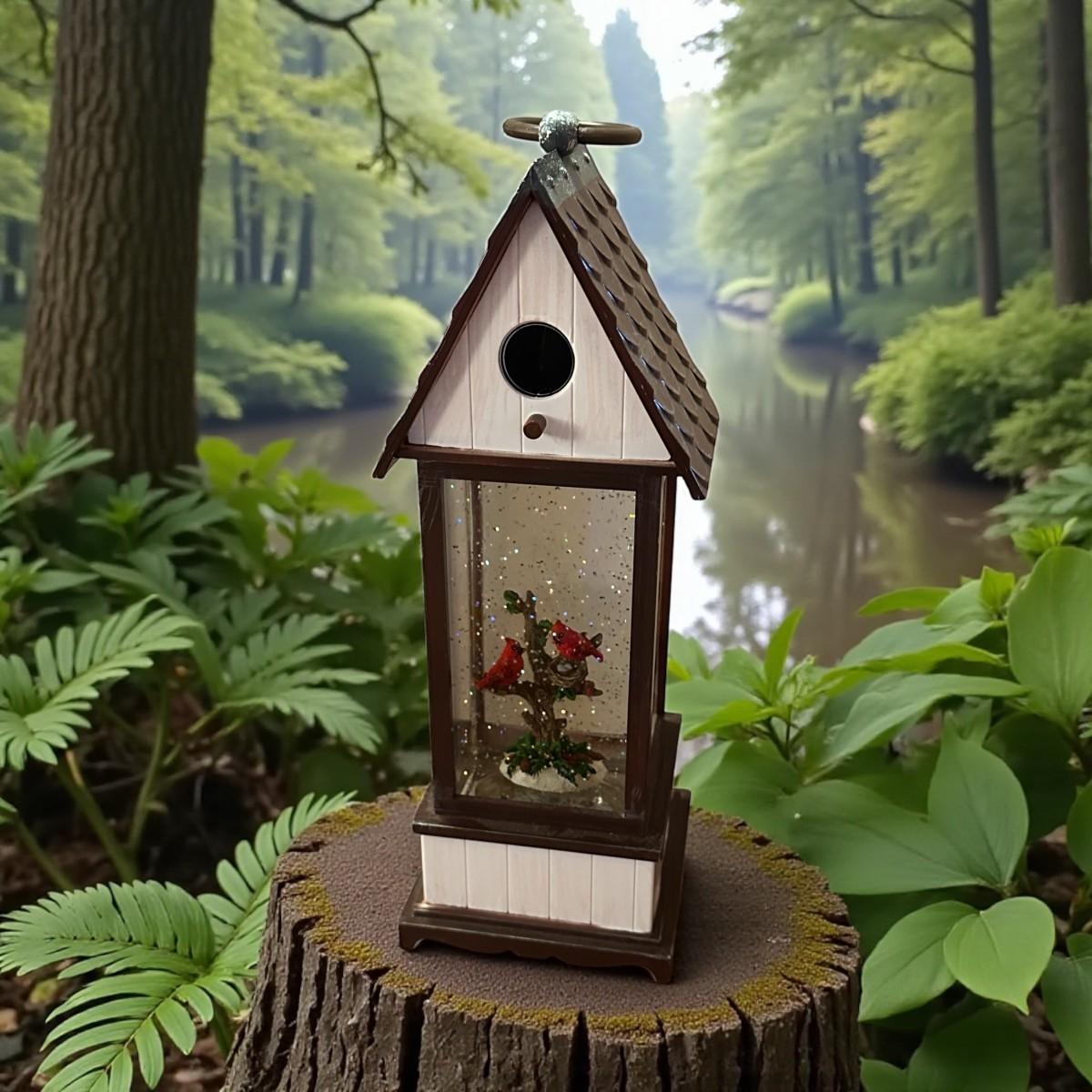 Light-Up "Birdhouse" Snow Globe Decor with Cardinals- Works- Battery Operated, 11" x 4"
