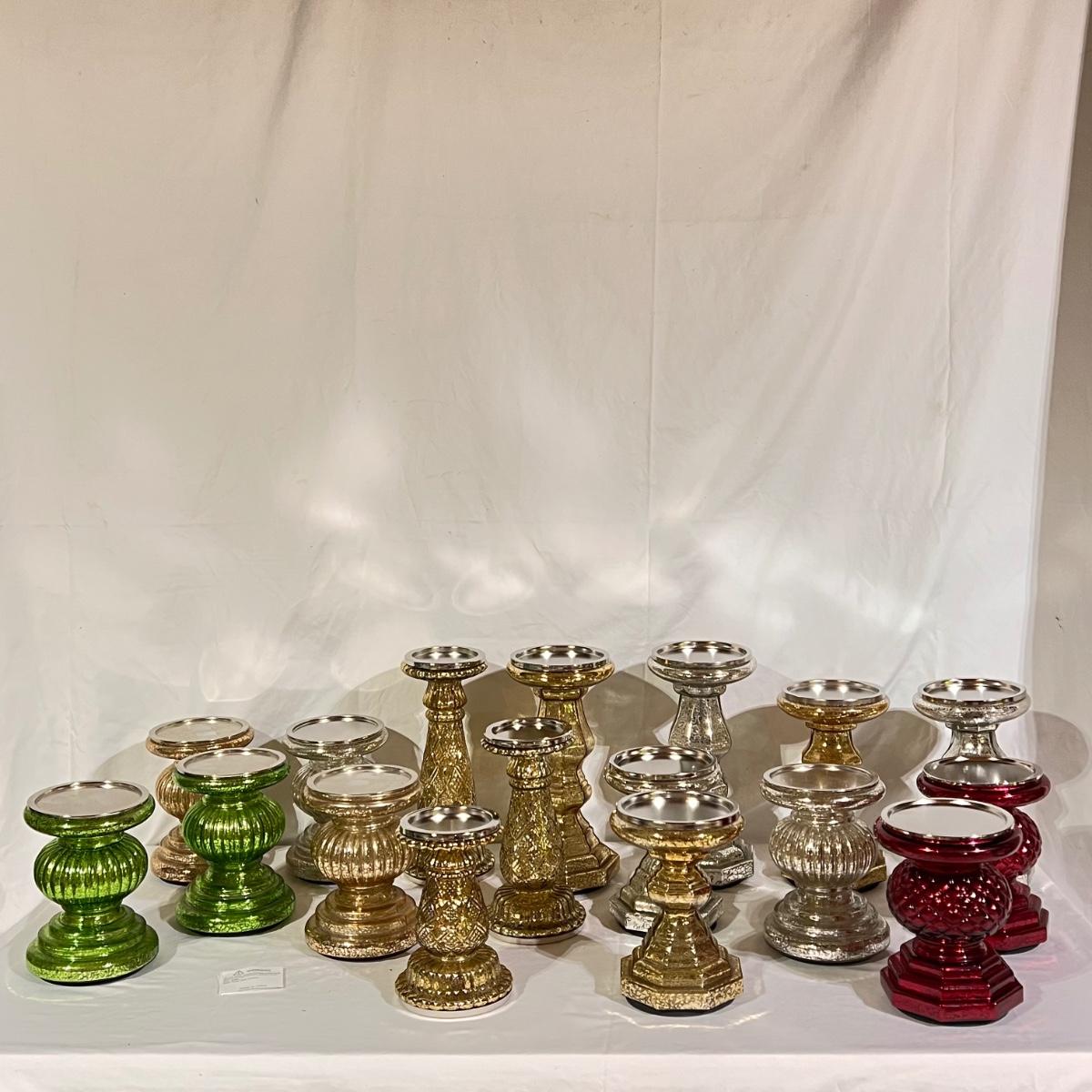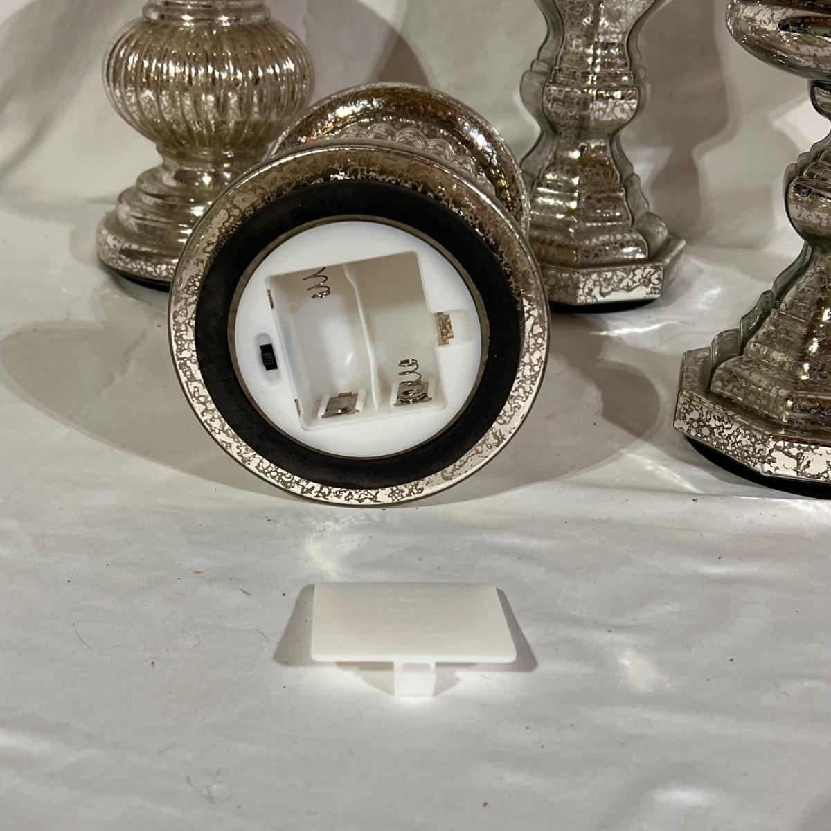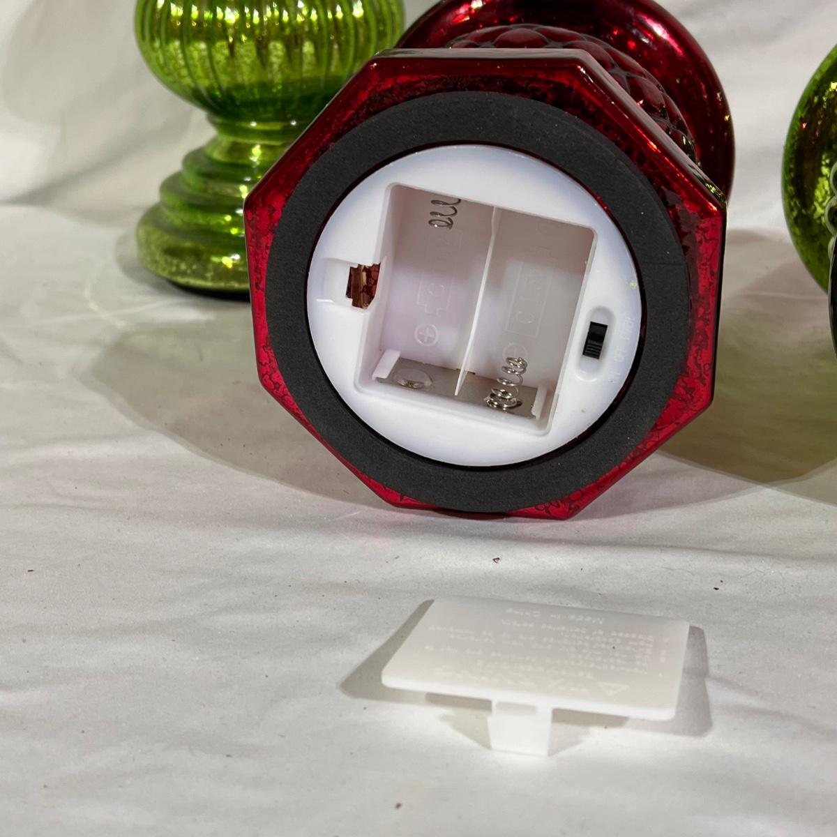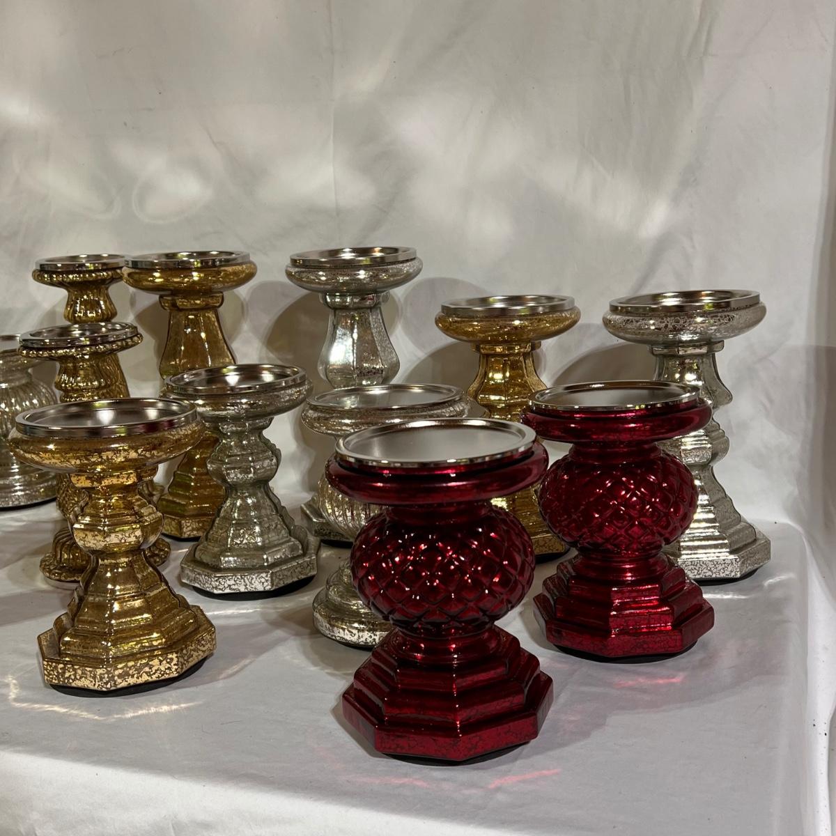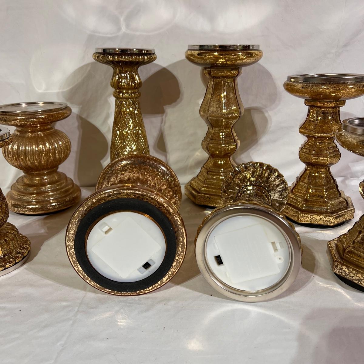 This lot includes seventeen plastic light-up candle pedestals in various sizes and colors. There are eight gold ones, five silver, two red and two green pedestals. All are operated by C 1.5V batteries. None have been tested. The largest is 6”D x 11”H and the smallest is 5.5”D x 7.5”H. Shipping available.