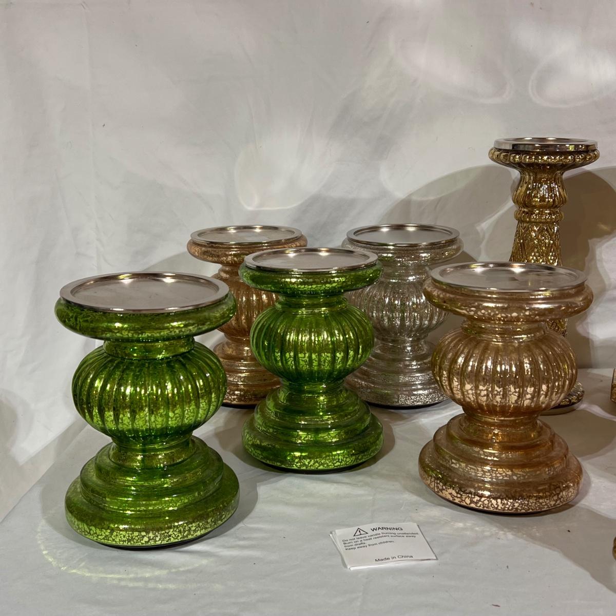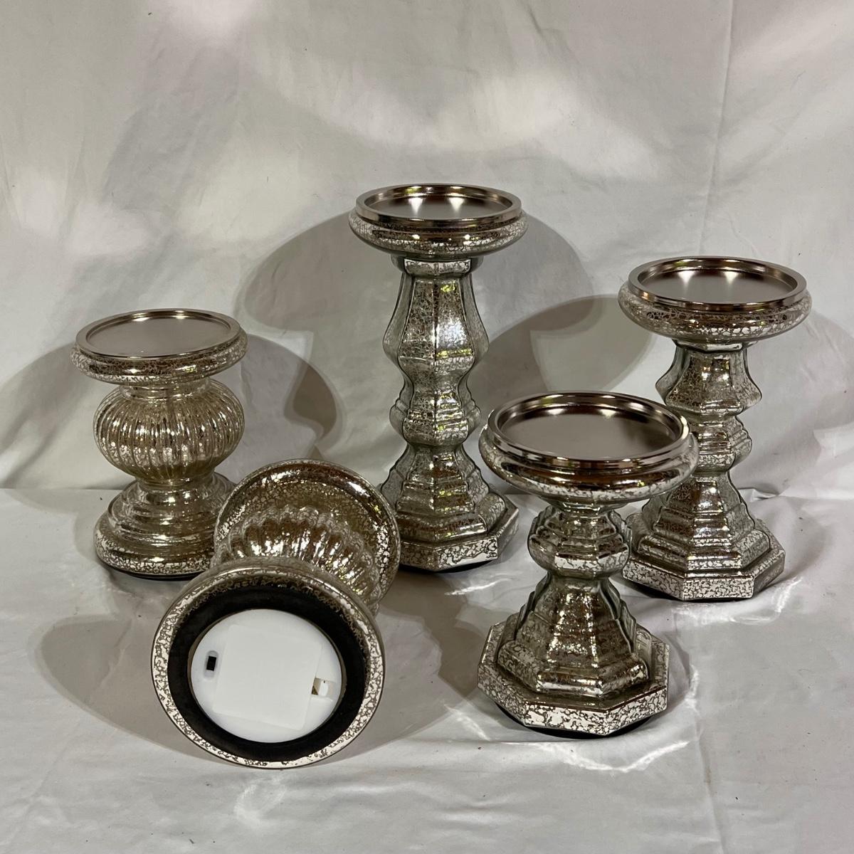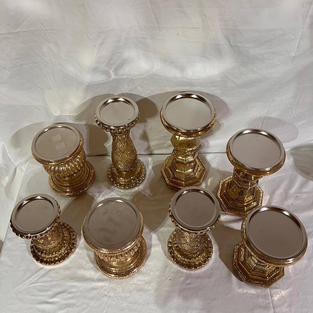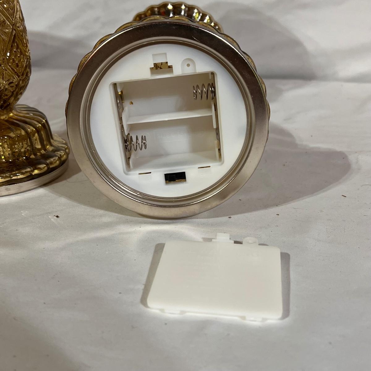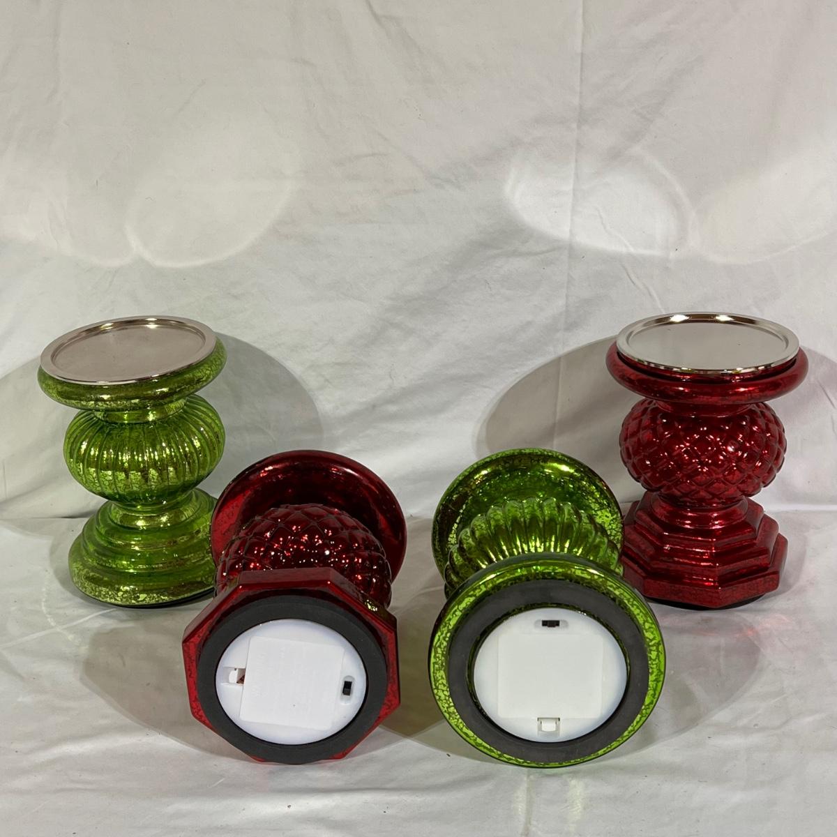 This lot includes seventeen plastic light-up candle pedestals in various sizes and colors. There are eight gold ones, five silver, two red and two green pedestals. All are operated by C 1.5V batteries. None have been tested. The largest is 6”D x 11”H and the smallest is 5.5”D x 7.5”H. Shipping available.