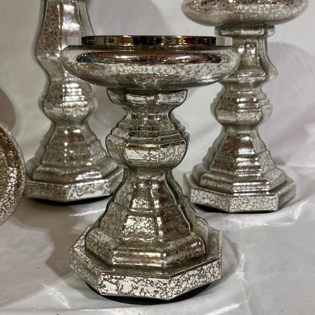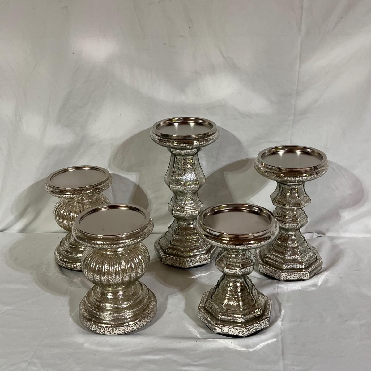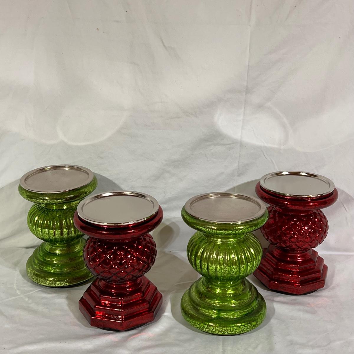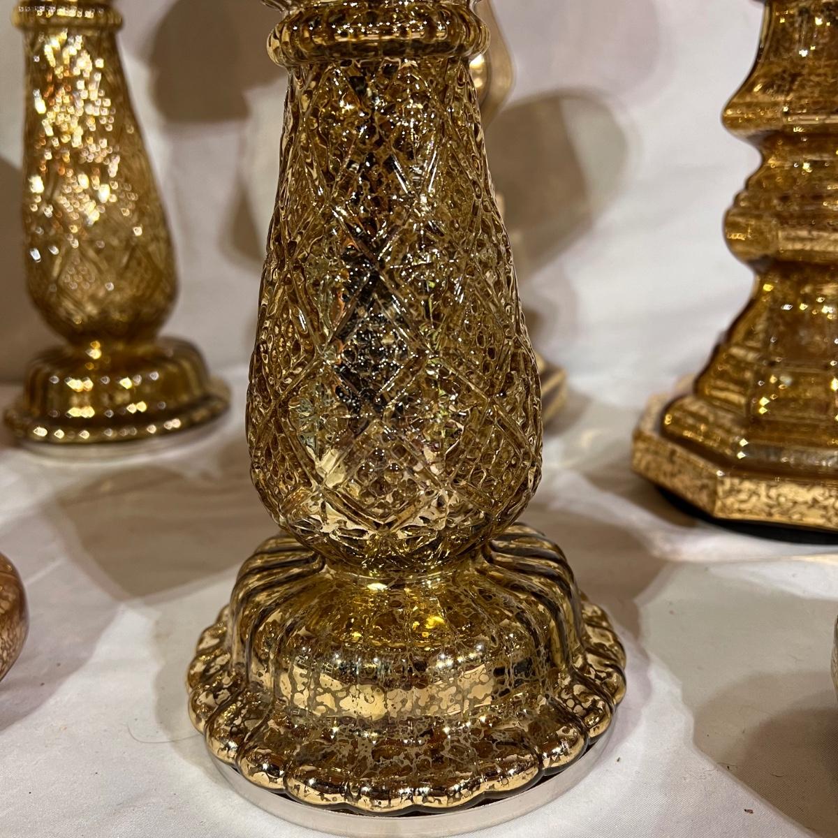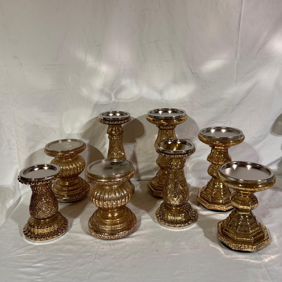 This lot includes seventeen plastic light-up candle pedestals in various sizes and colors. There are eight gold ones, five silver, two red and two green pedestals. All are operated by C 1.5V batteries. None have been tested. The largest is 6”D x 11”H and the smallest is 5.5”D x 7.5”H. Shipping available.