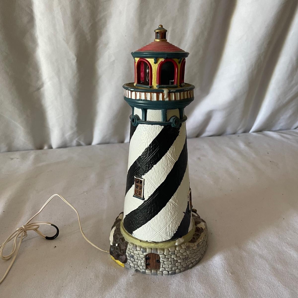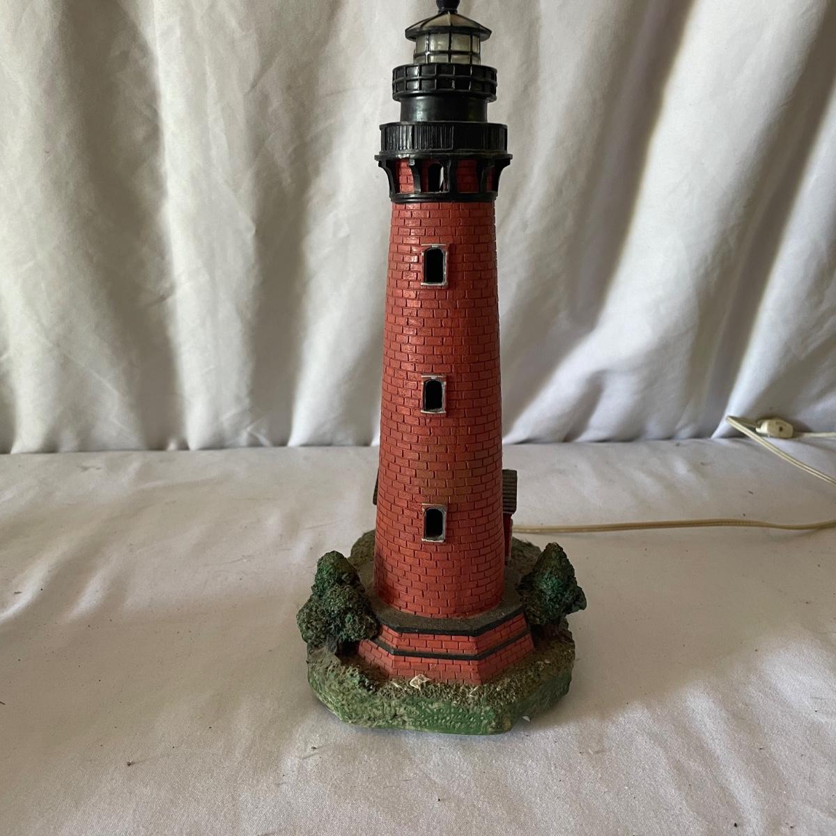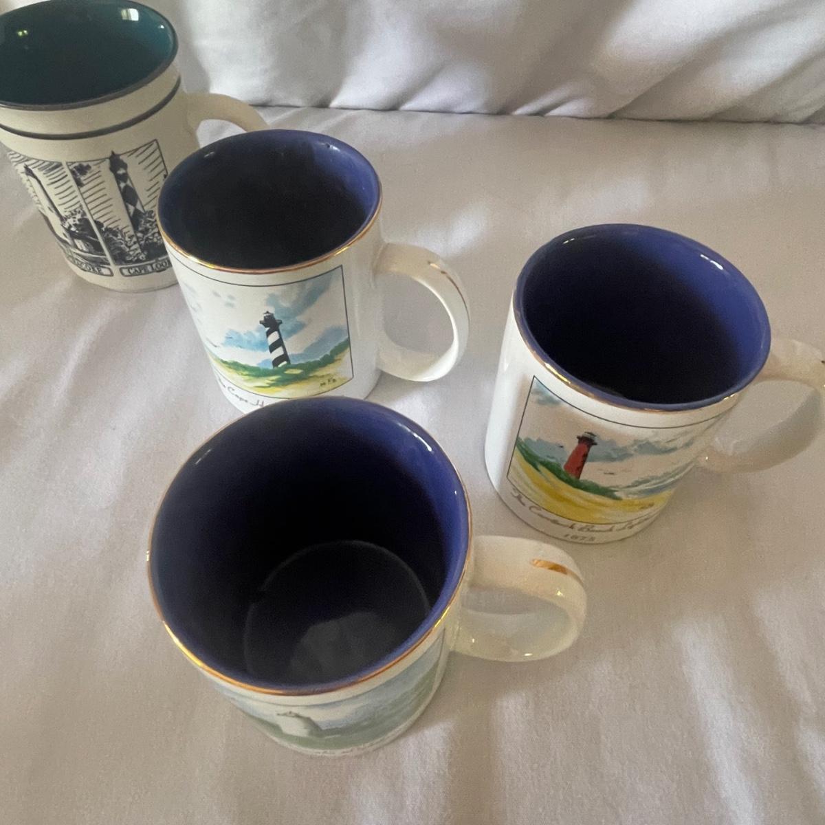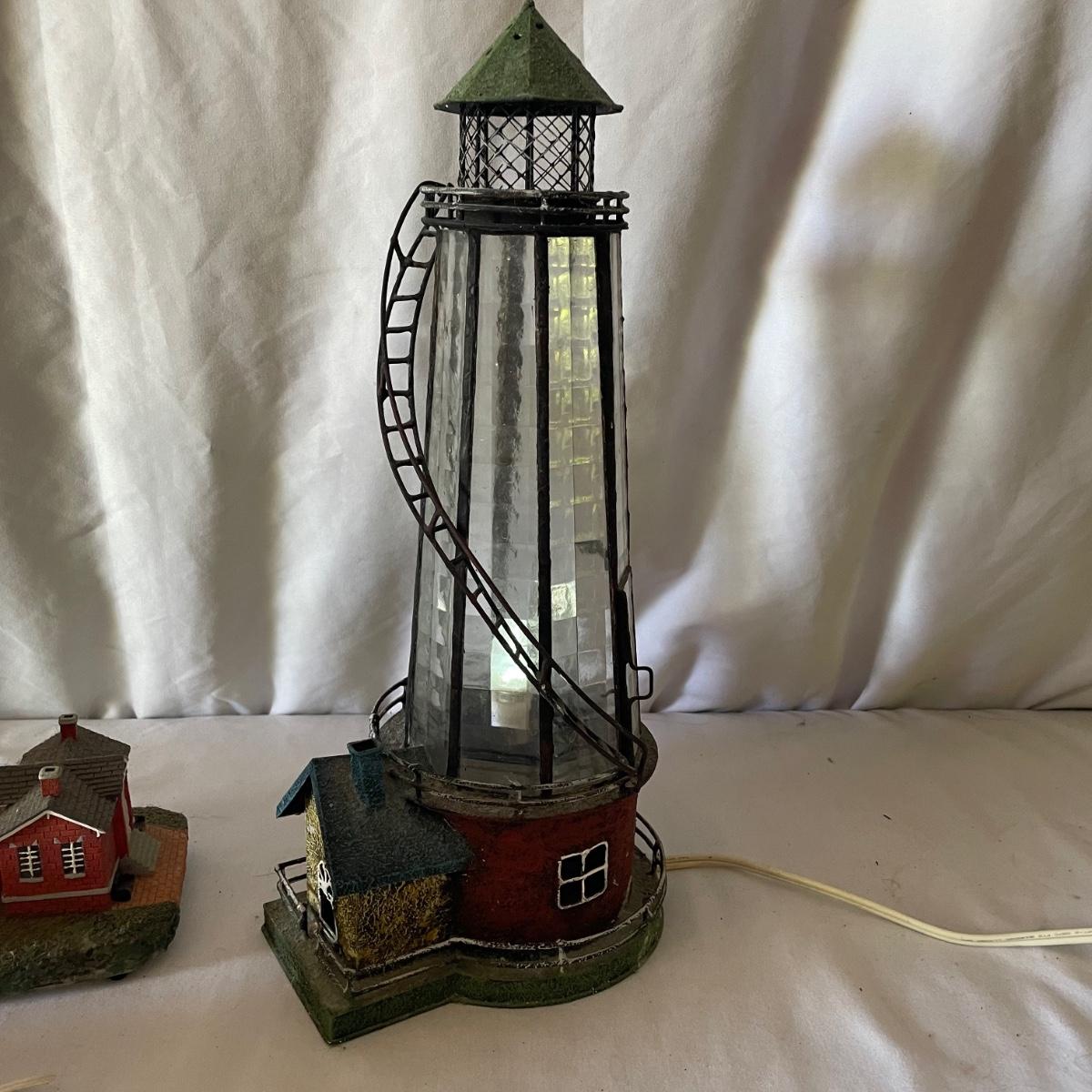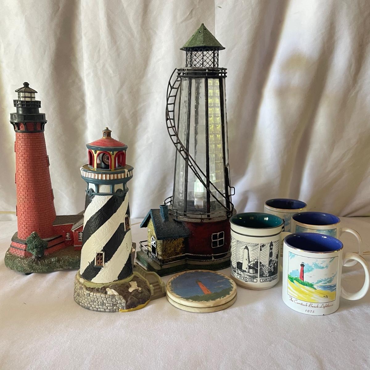 The largest of these 3 lighthouses, which is metal, worked when tested. The other’s did not. They are made of a resin type material. 4 ceramic coffee cups and 2 coasters also included.