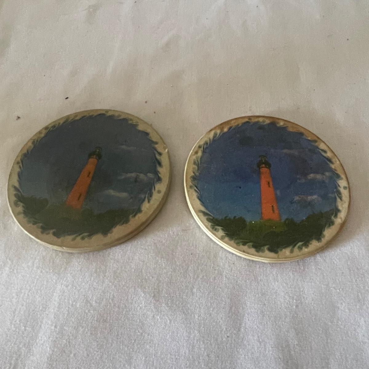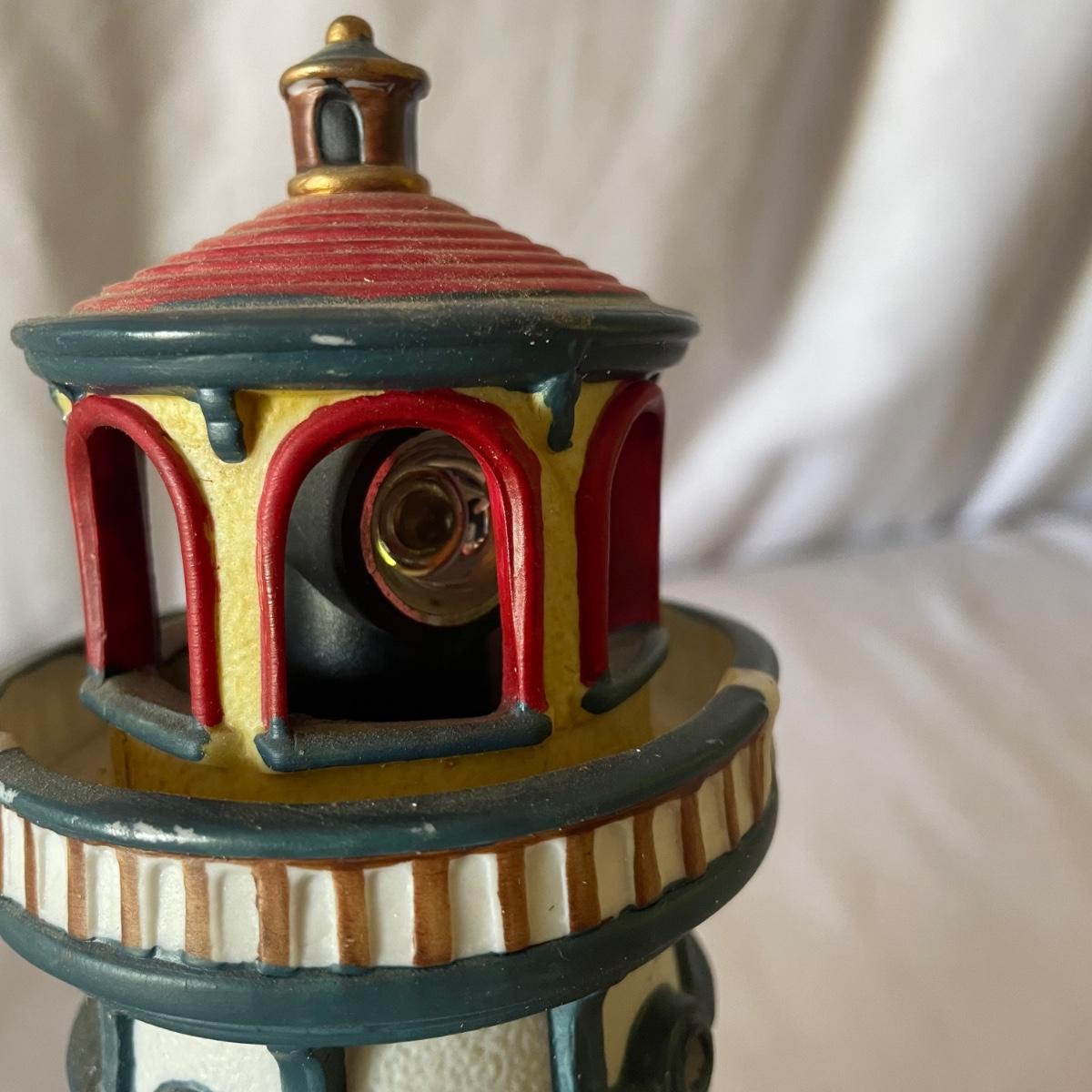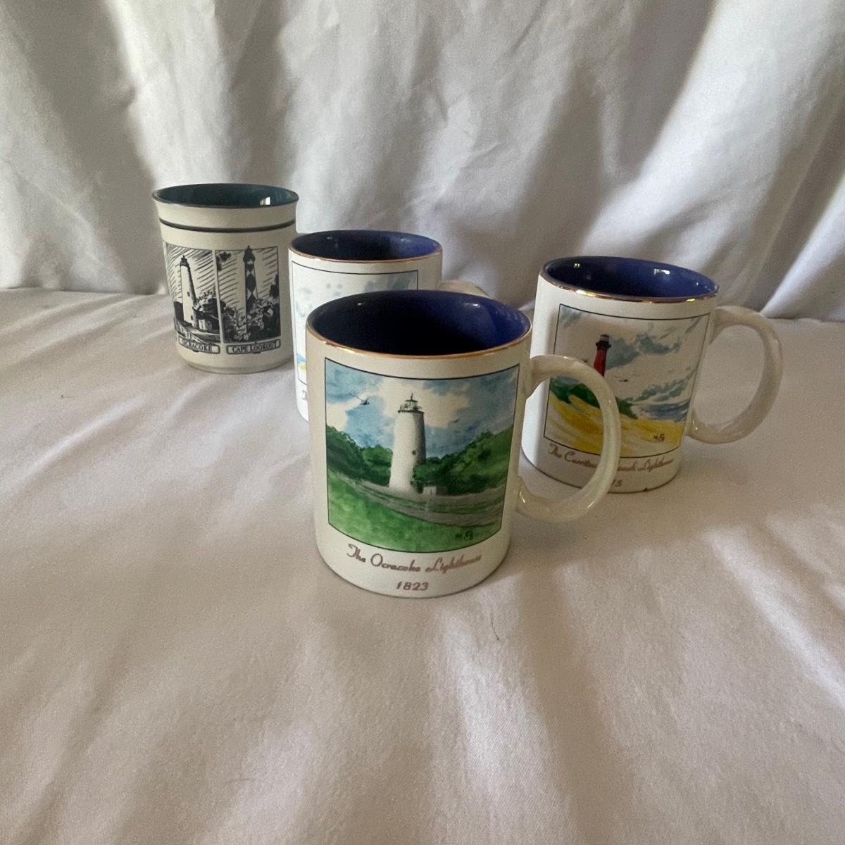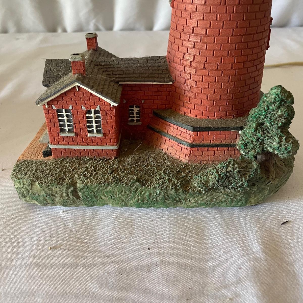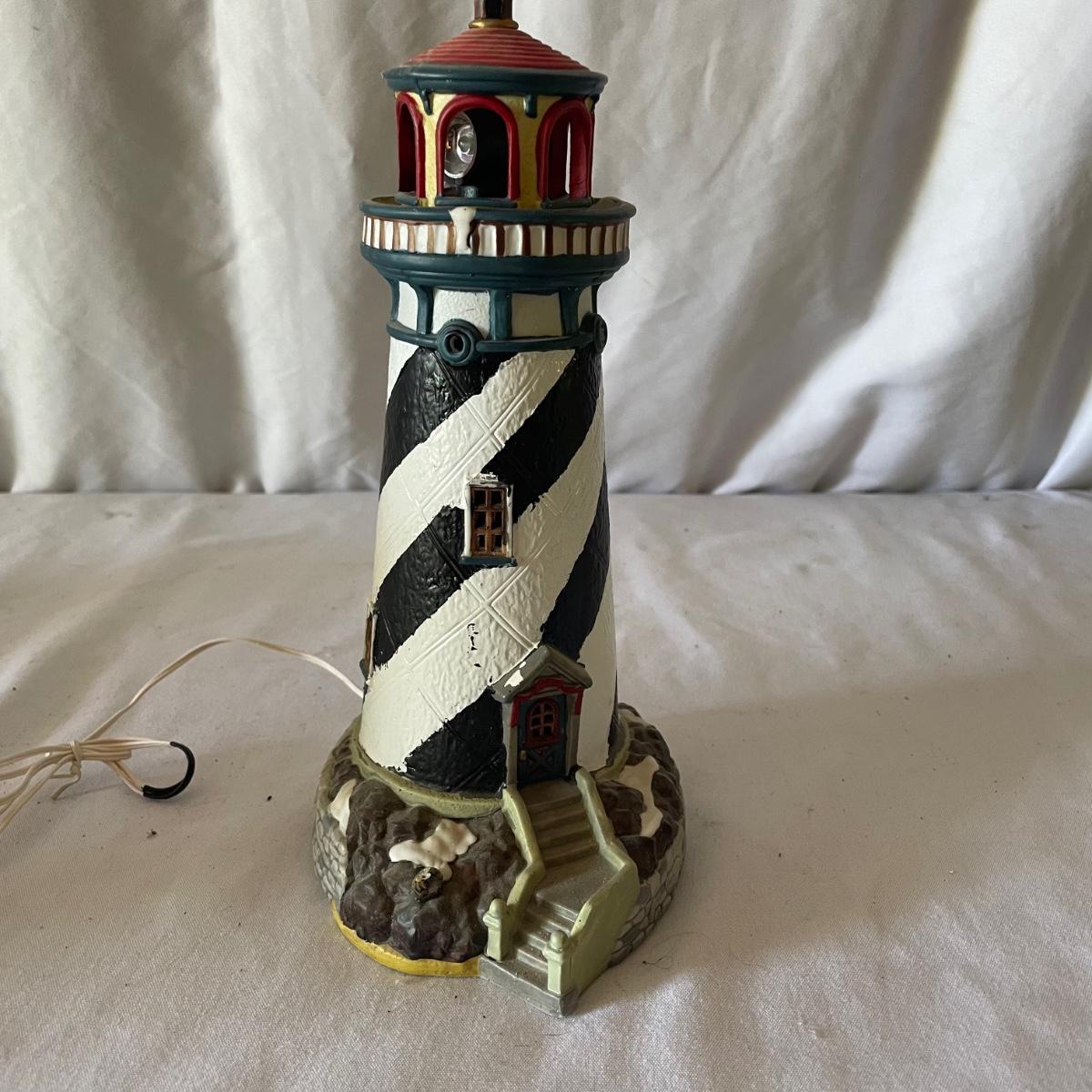 The largest of these 3 lighthouses, which is metal, worked when tested. The other’s did not. They are made of a resin type material. 4 ceramic coffee cups and 2 coasters also included.