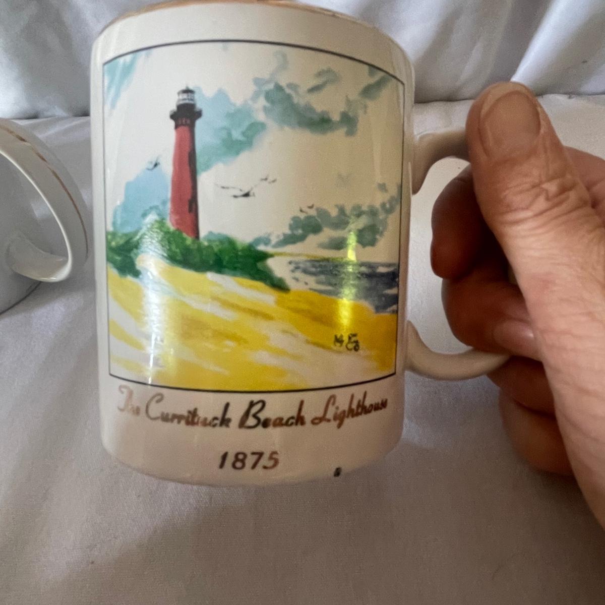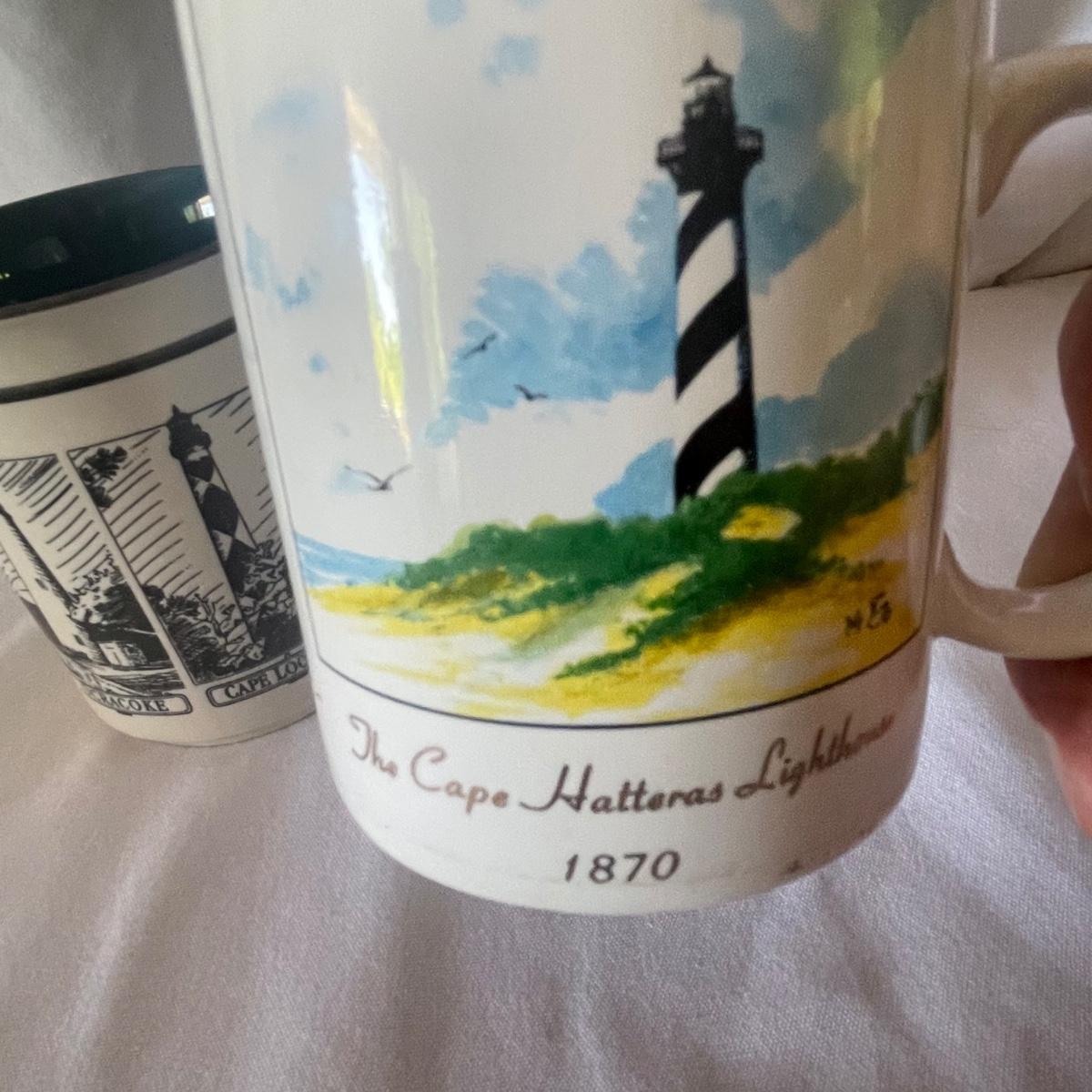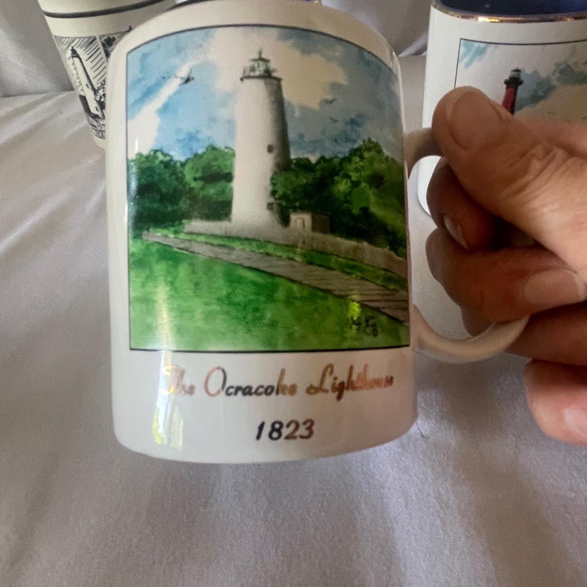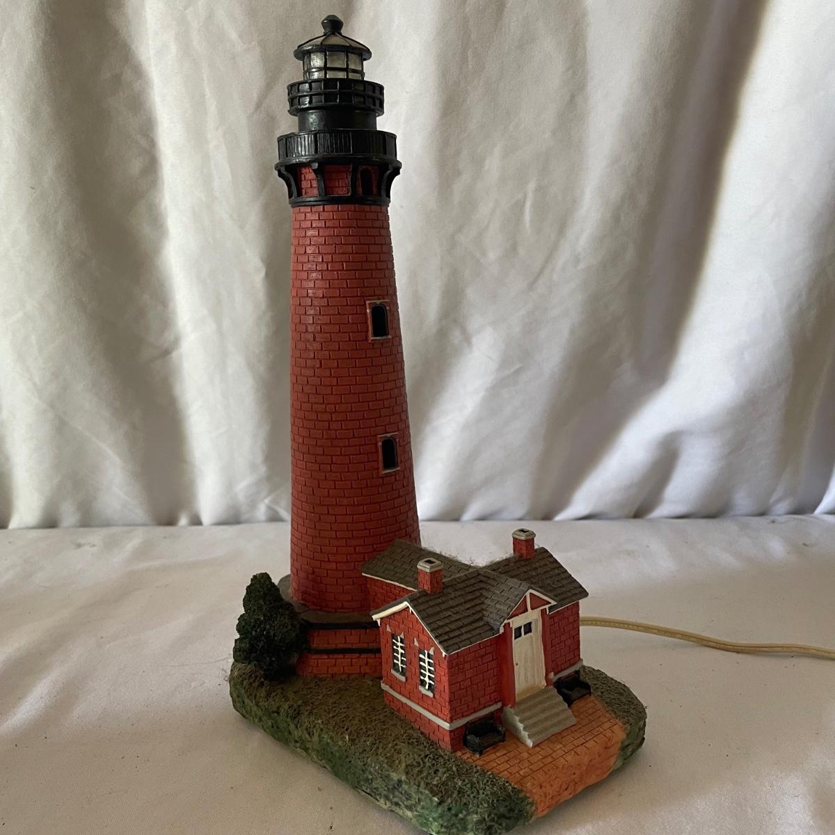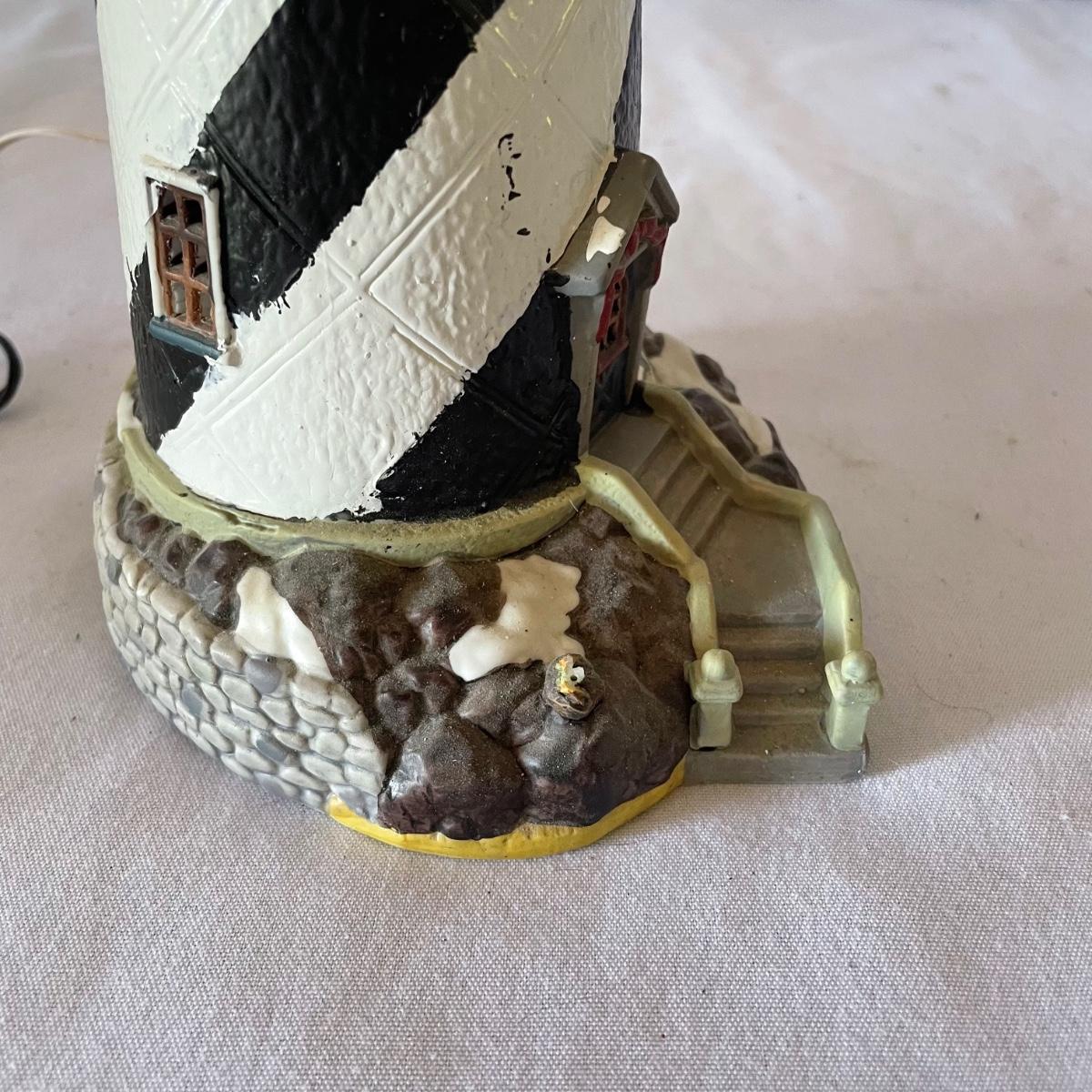 The largest of these 3 lighthouses, which is metal, worked when tested. The other’s did not. They are made of a resin type material. 4 ceramic coffee cups and 2 coasters also included.