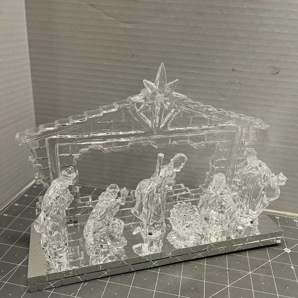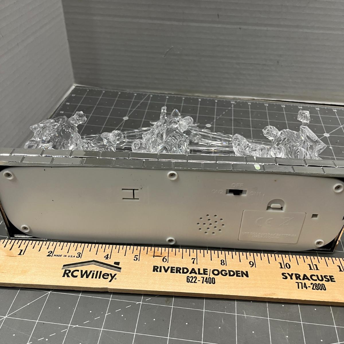 Includes 6 clear figures under LED-lit stable; musical base plays “Silent Night.”