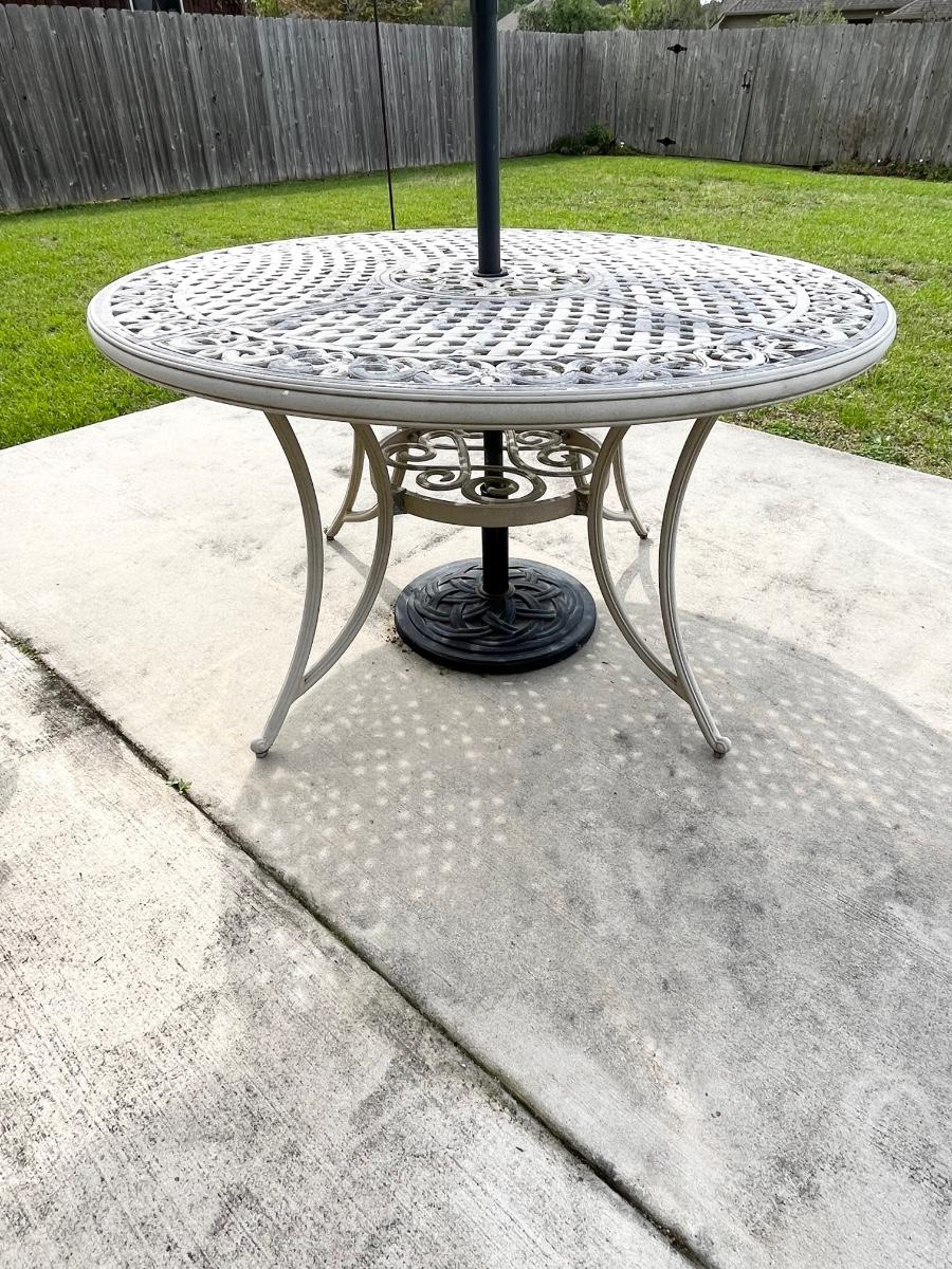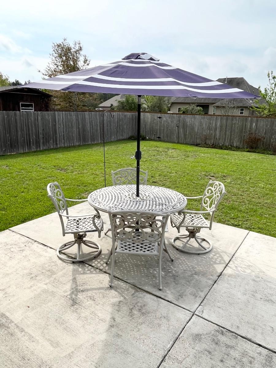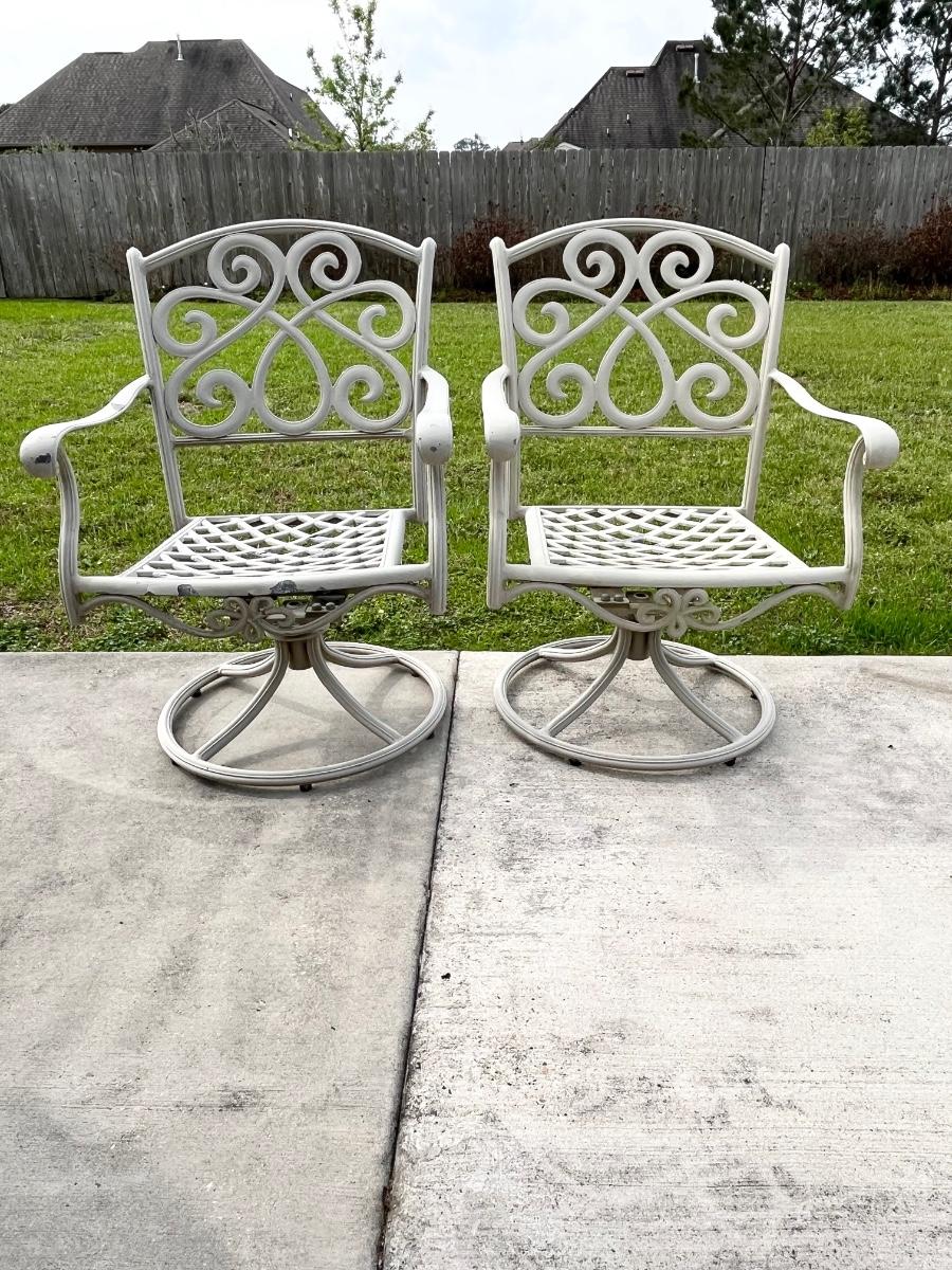 Paint chipping needs to be refinished ~ Set Includes ~ 51” Round Table ~ 2 x Swivel Rockers ~ 2 x Chairs ~ Umbrella Stand Umbrella ~ Seat height 16”