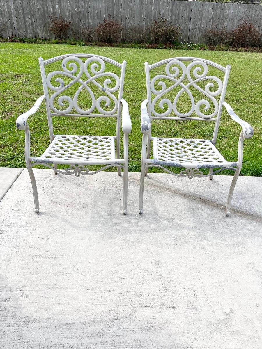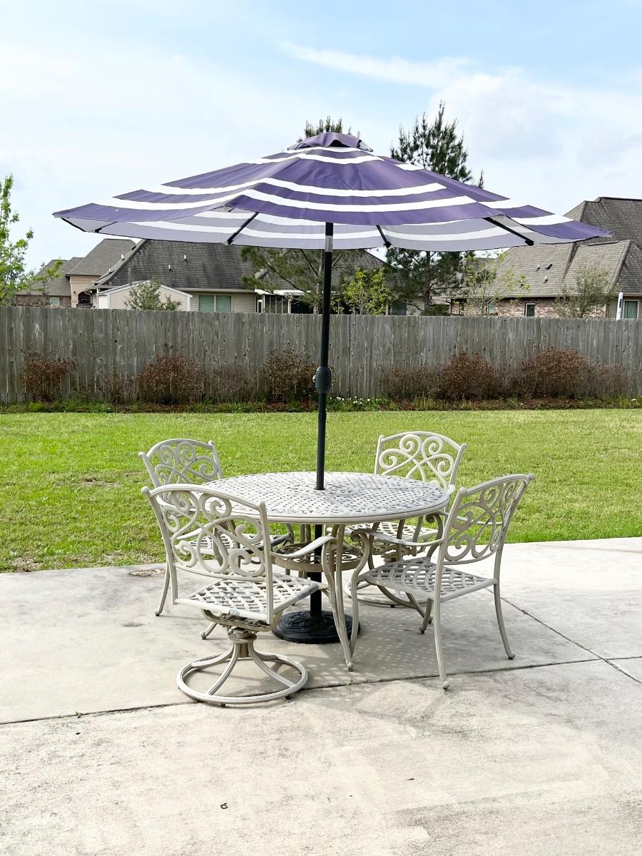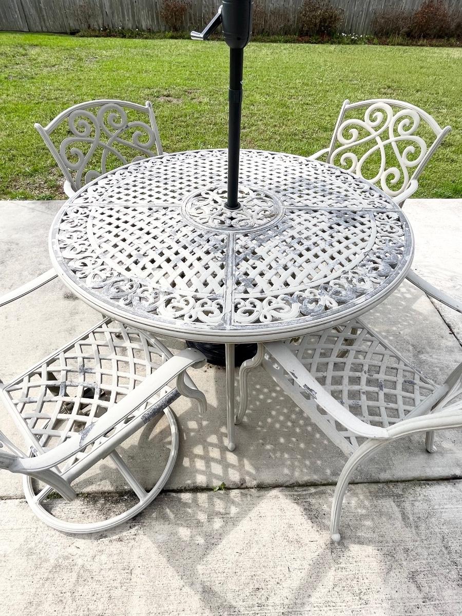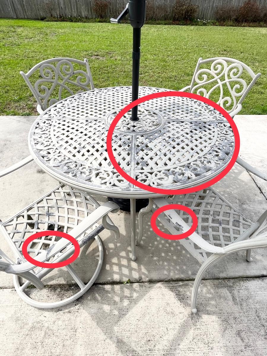Paint chipping needs to be refinished ~ Set Includes ~ 51” Round Table ~ 2 x Swivel Rockers ~ 2 x Chairs ~ Umbrella Stand Umbrella ~ Seat height 16”