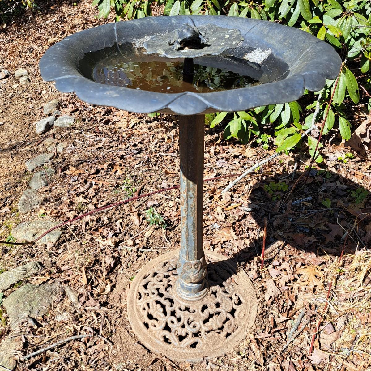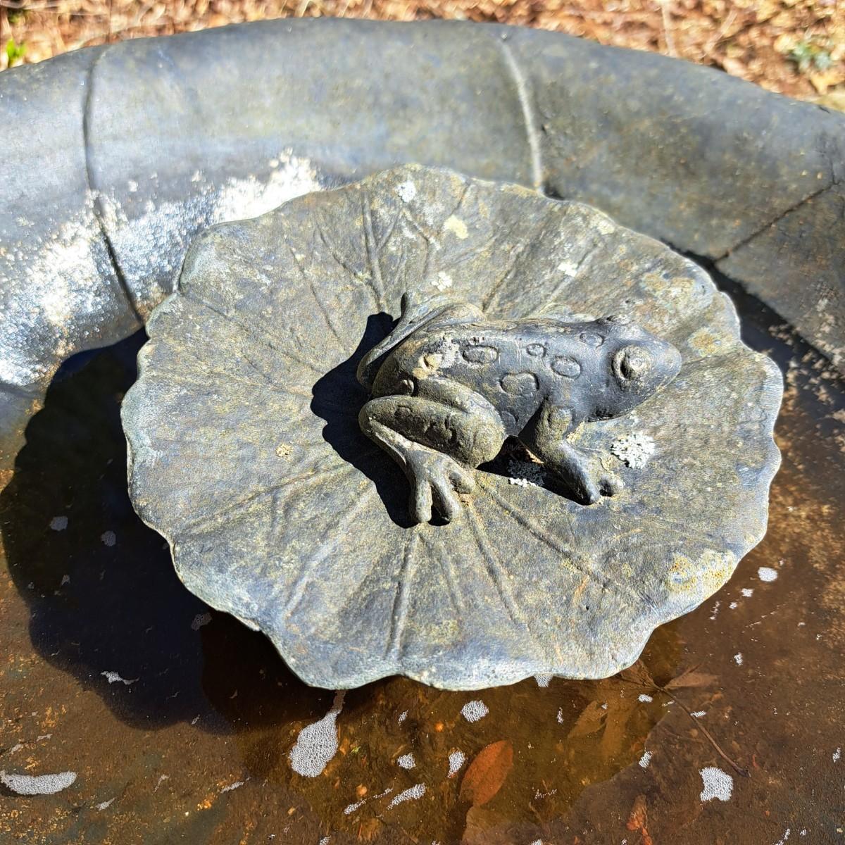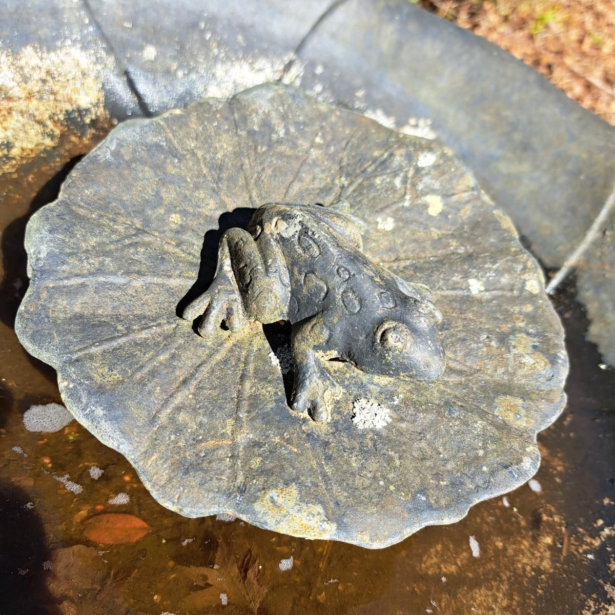 Measures approximately 30"H with a sweet, little contented frog lazing on a lily pad in the center. Birdbath bowl is 20"D and lily pad is 7"D. Some minor spotty rust on post; appears to painted black aluminum with a round filigree metal base. Local pickup only.