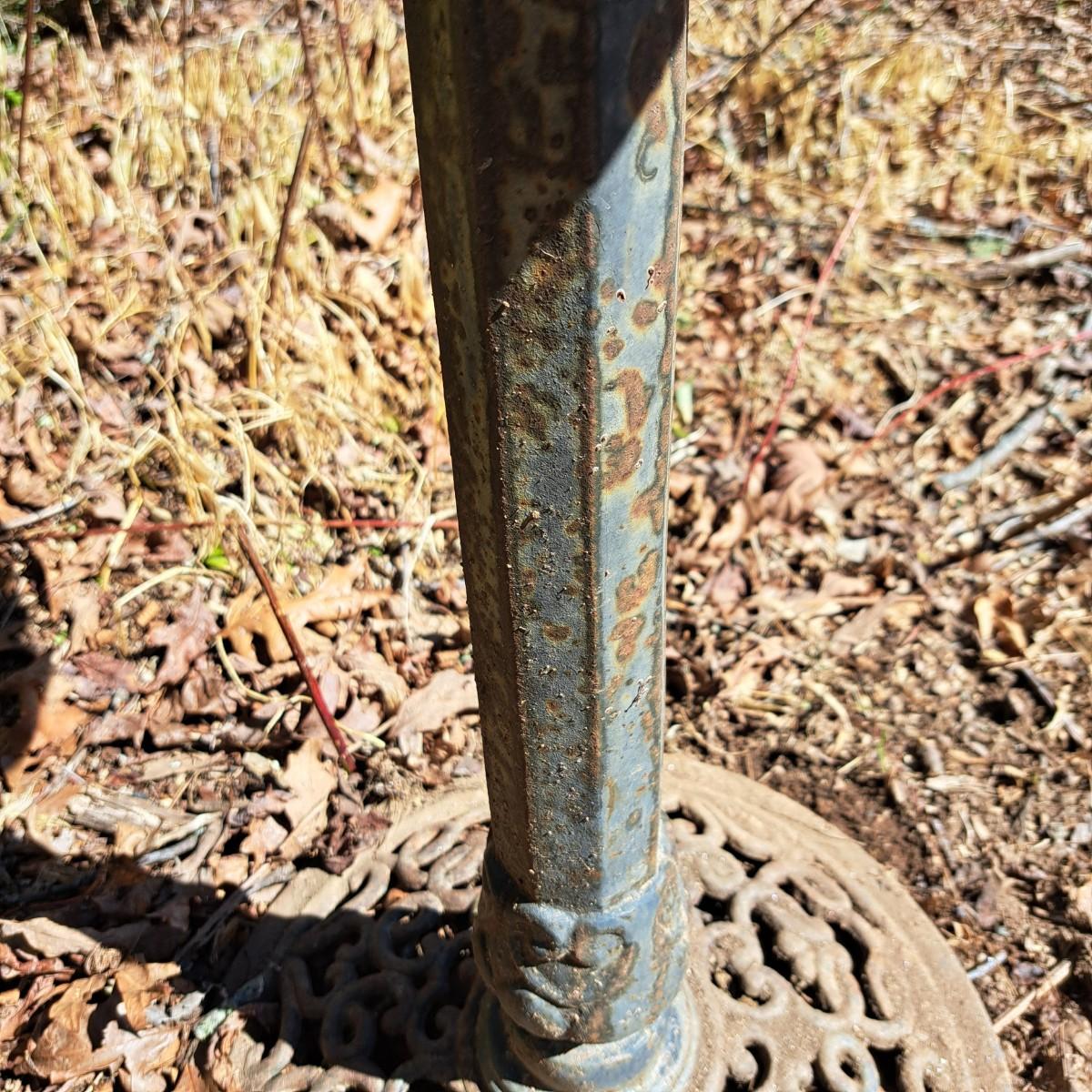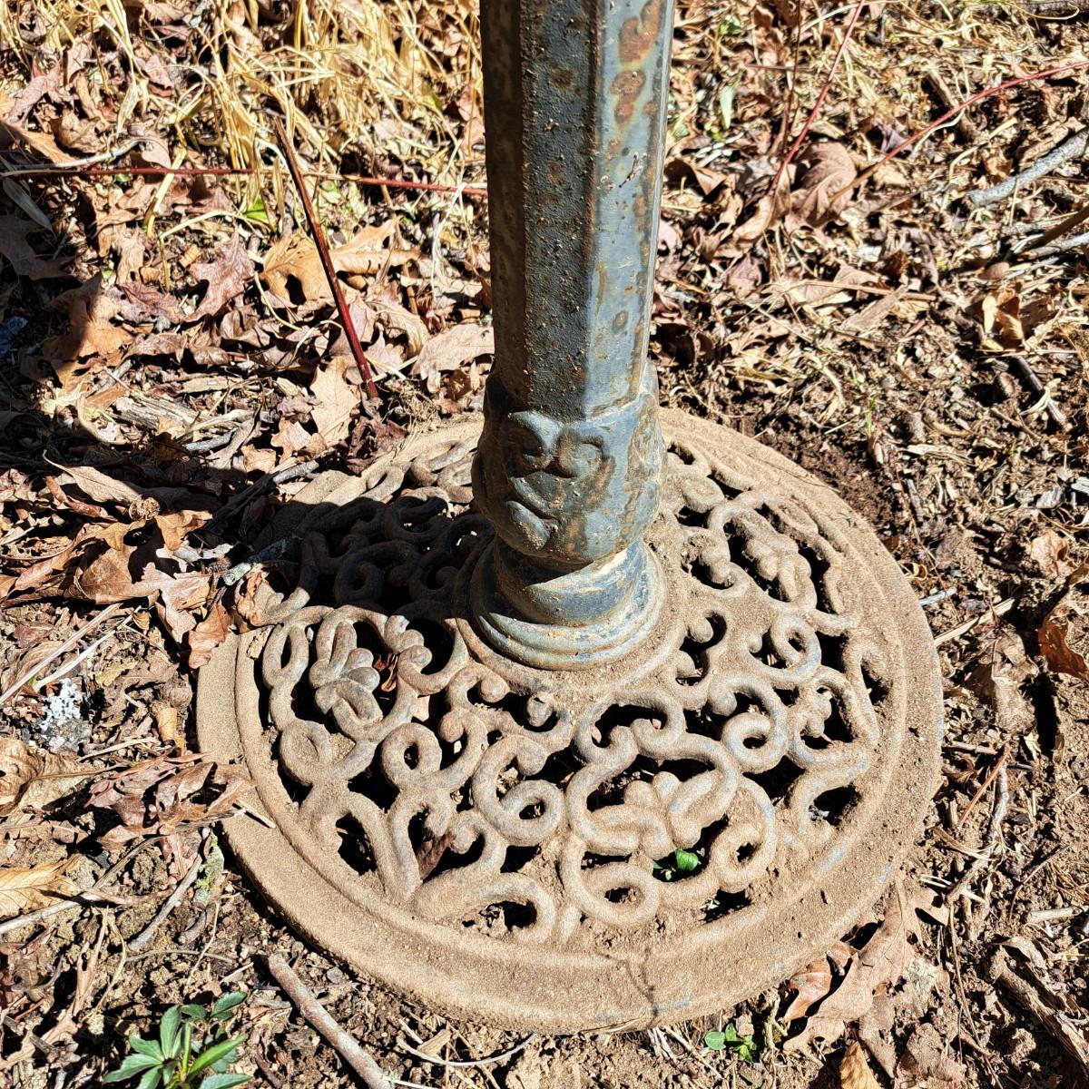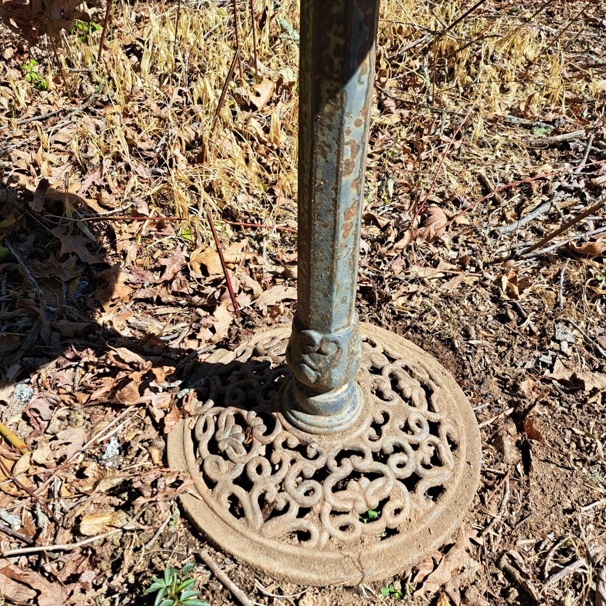 Measures approximately 30"H with a sweet, little contented frog lazing on a lily pad in the center. Birdbath bowl is 20"D and lily pad is 7"D. Some minor spotty rust on post; appears to painted black aluminum with a round filigree metal base. Local pickup only.