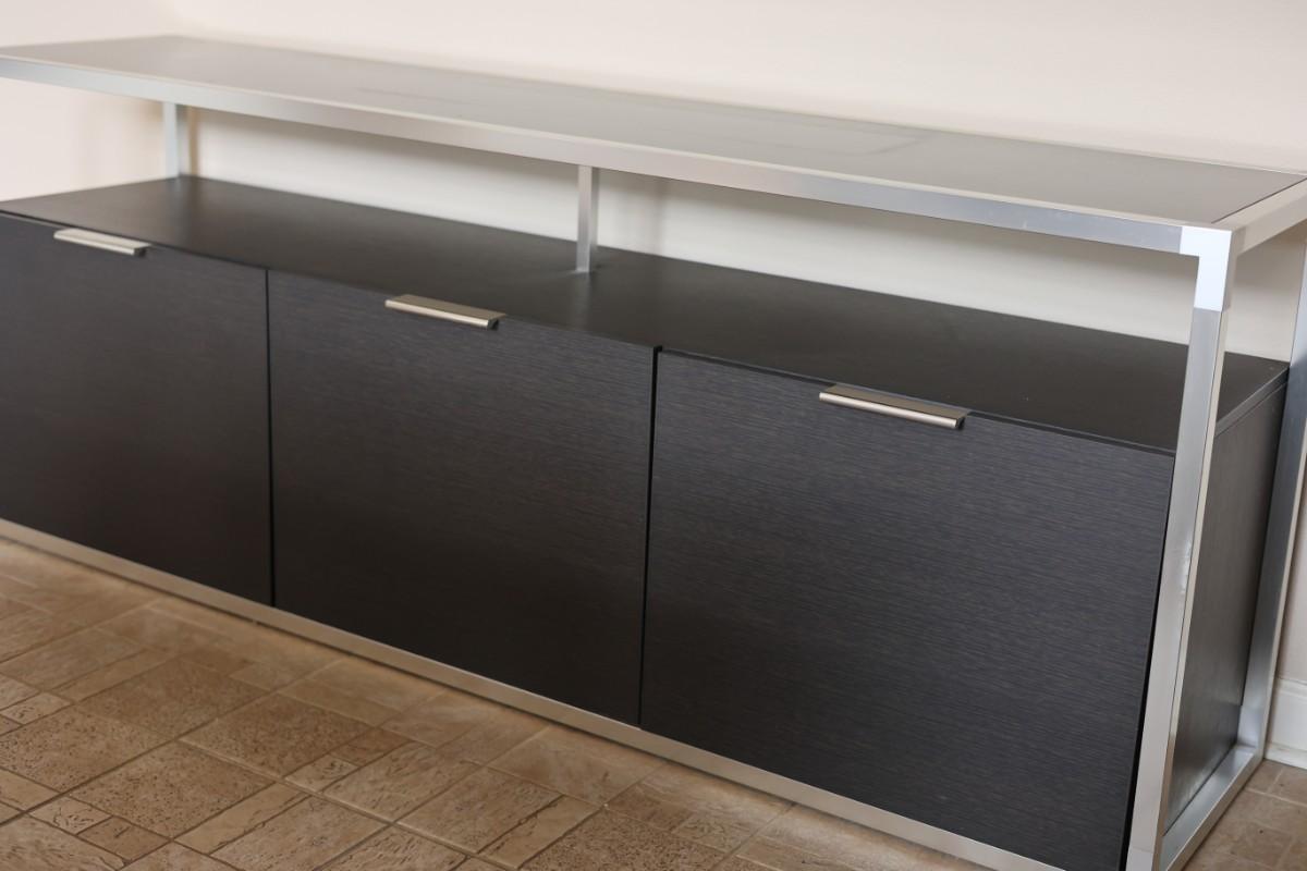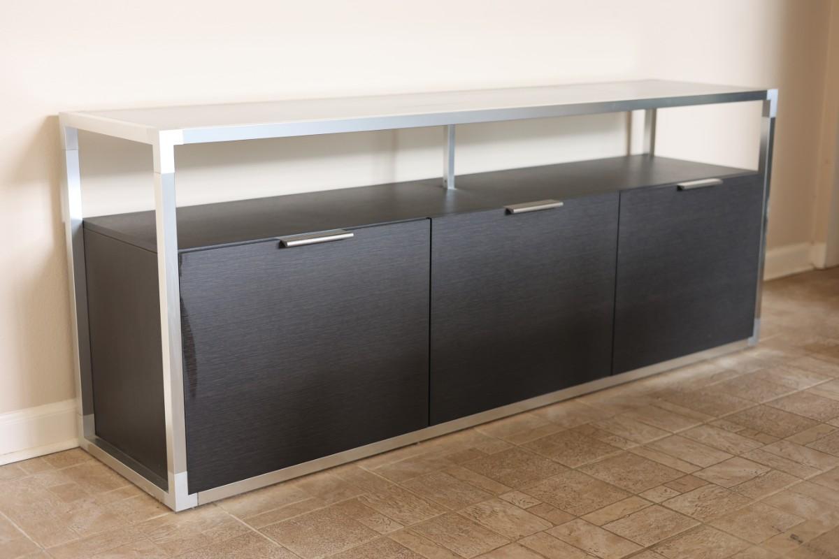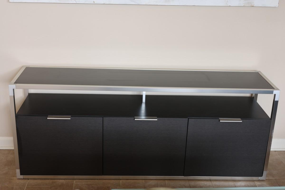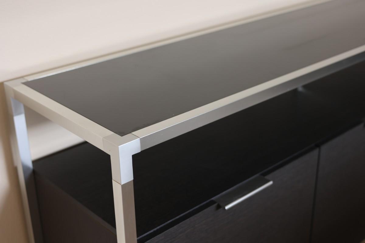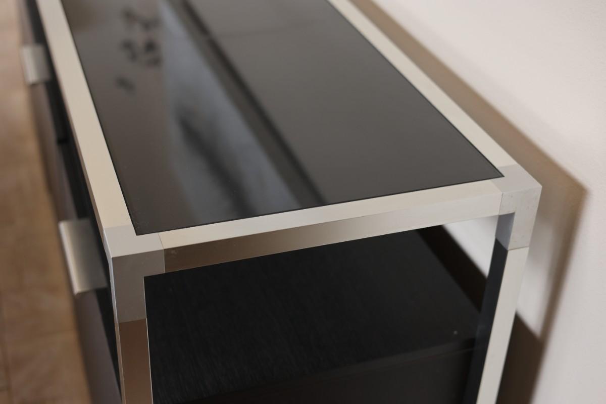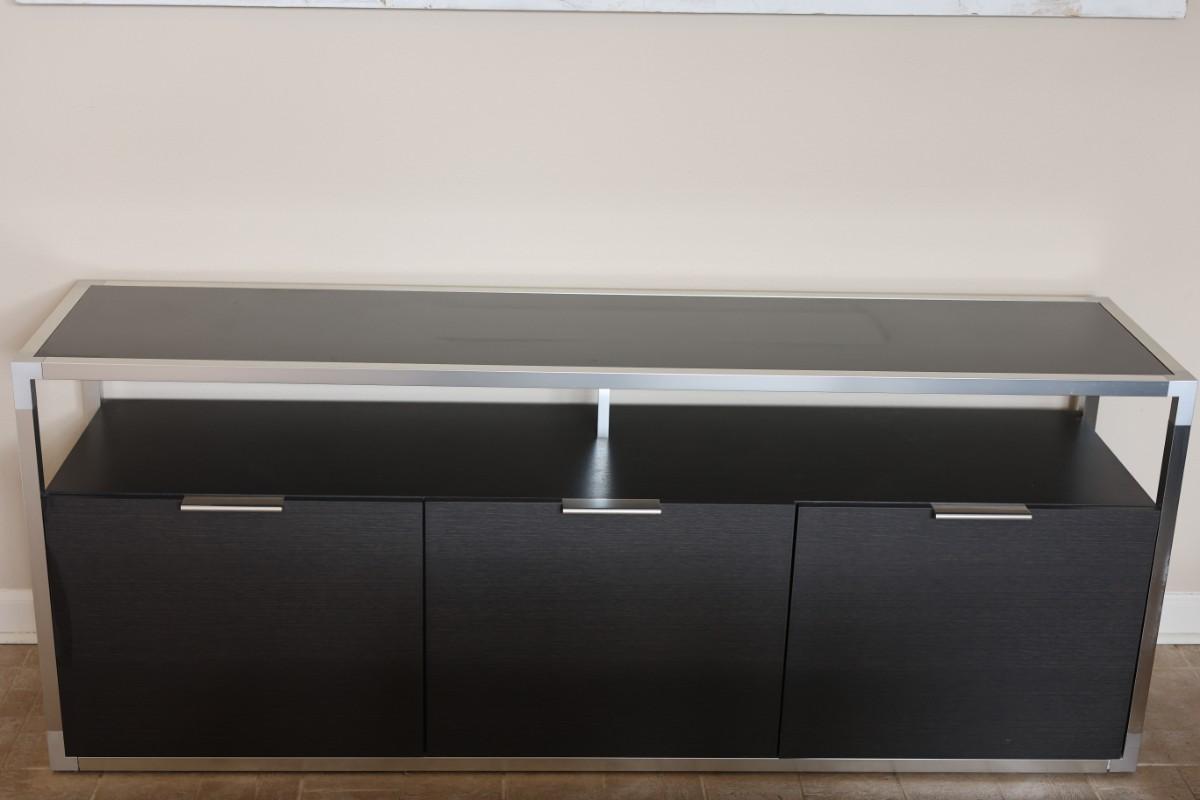 This exquisite, modern 3-door sideboard features an oak veneer with mocha lacquered profiles, a brilliant steel anodized aluminum finish and a toughened upper glass top. This striking piece is in excellent condition with only minor wear and tear. It was designed by the award-winning Didier Gomez.