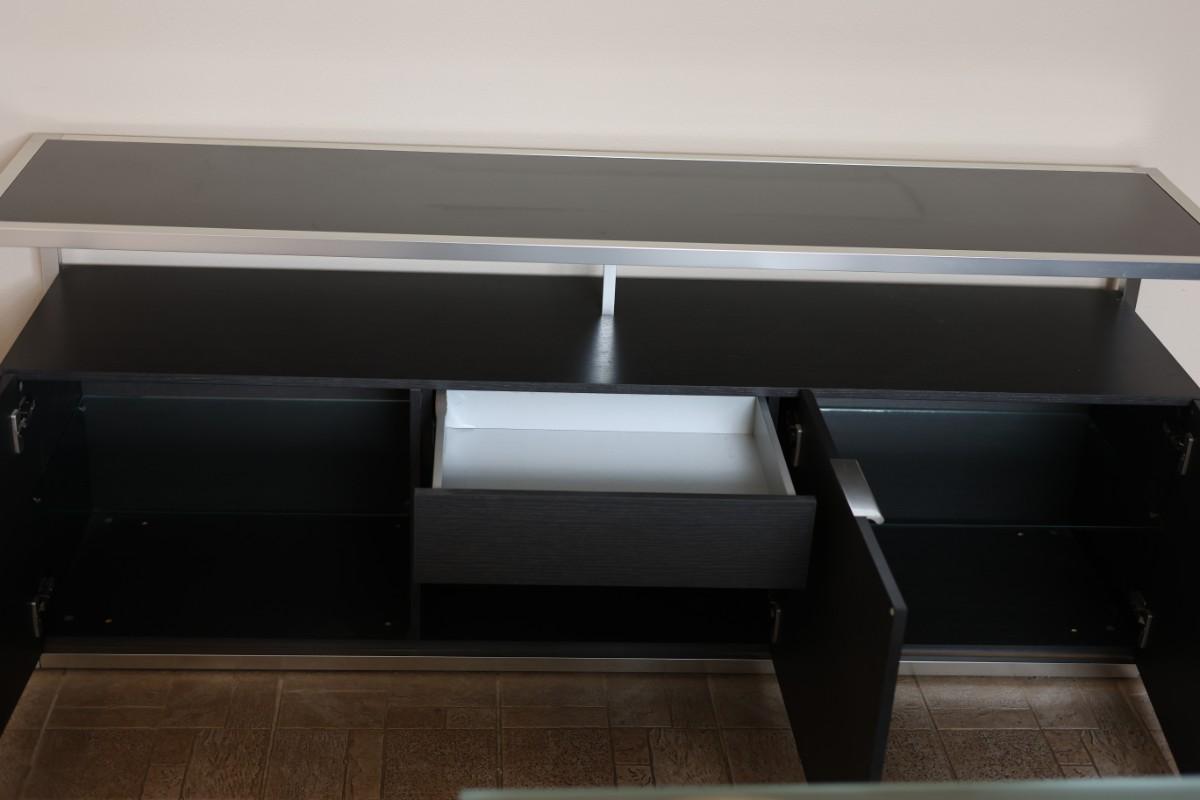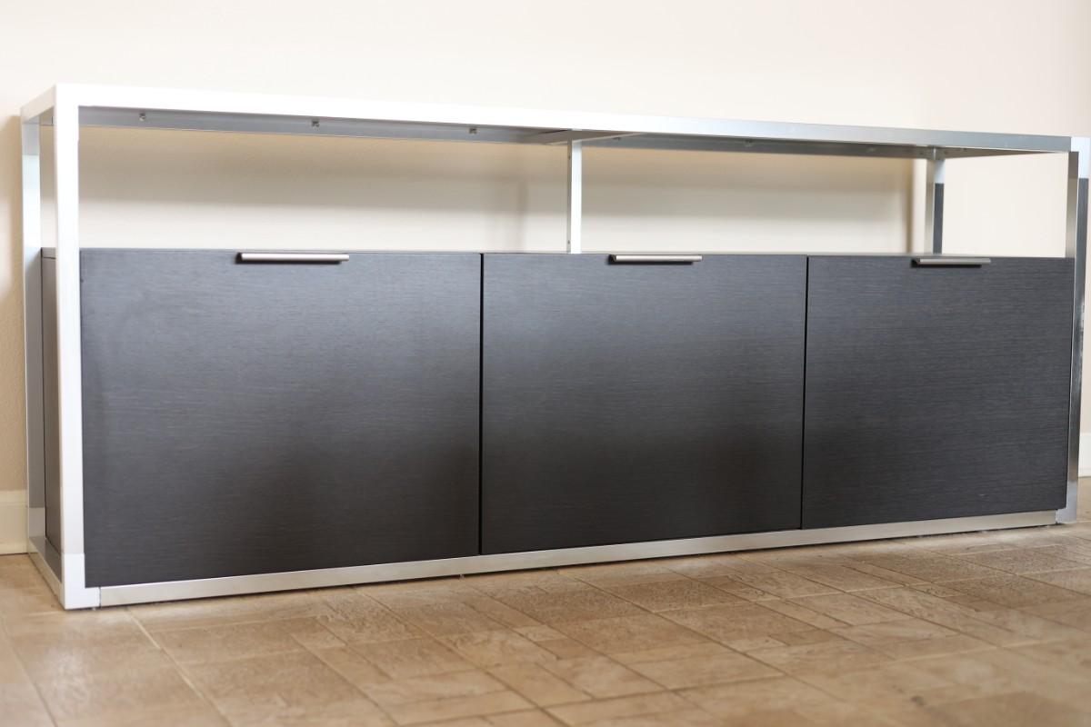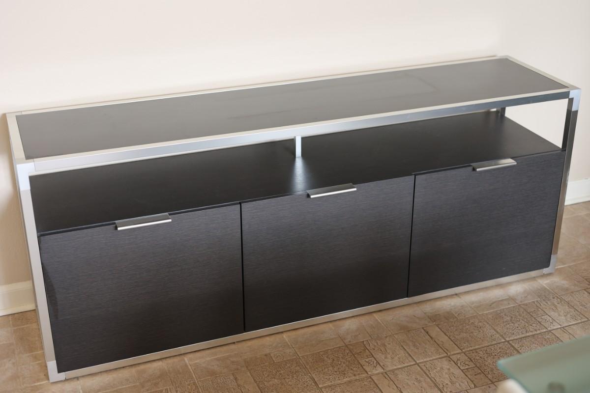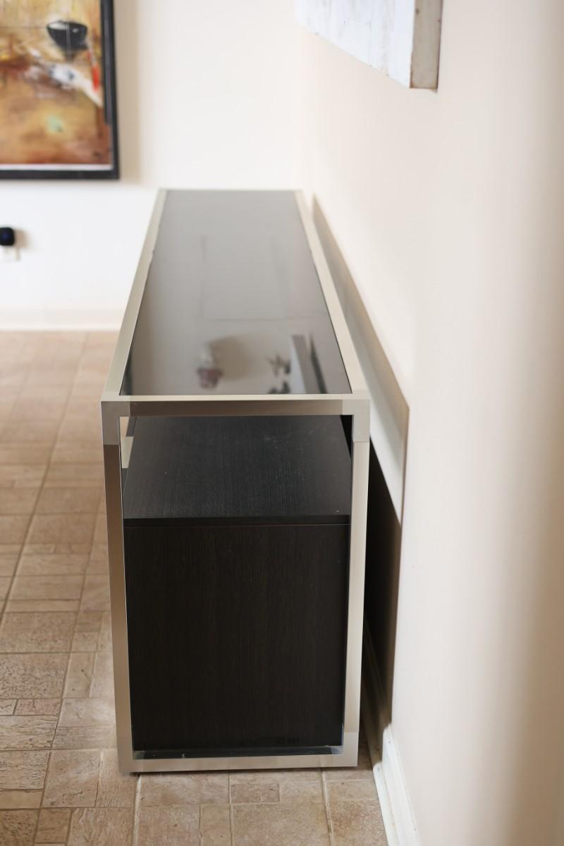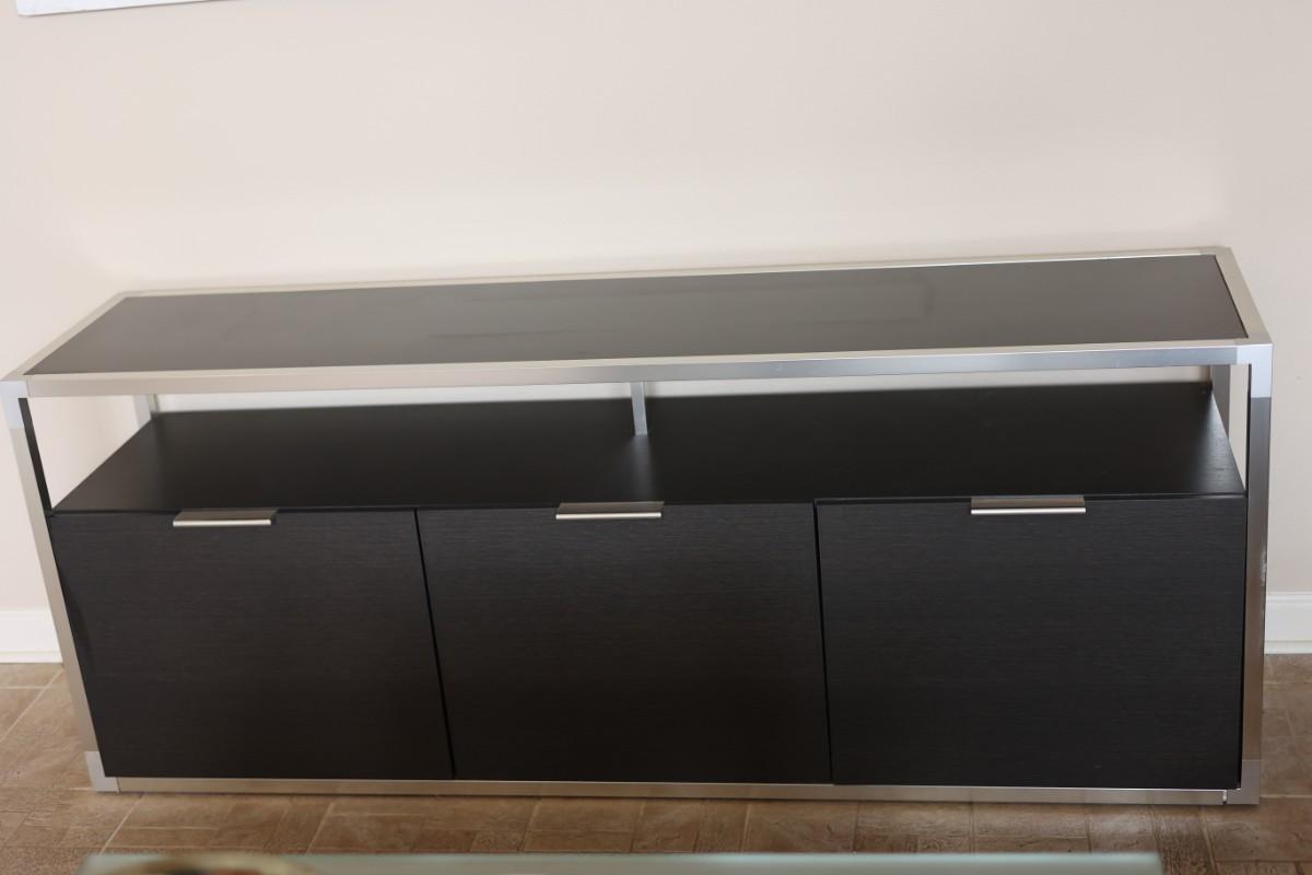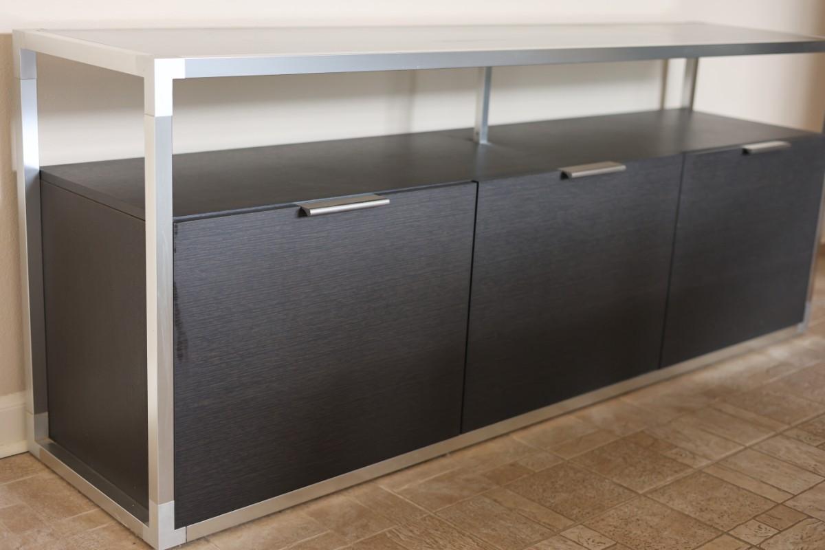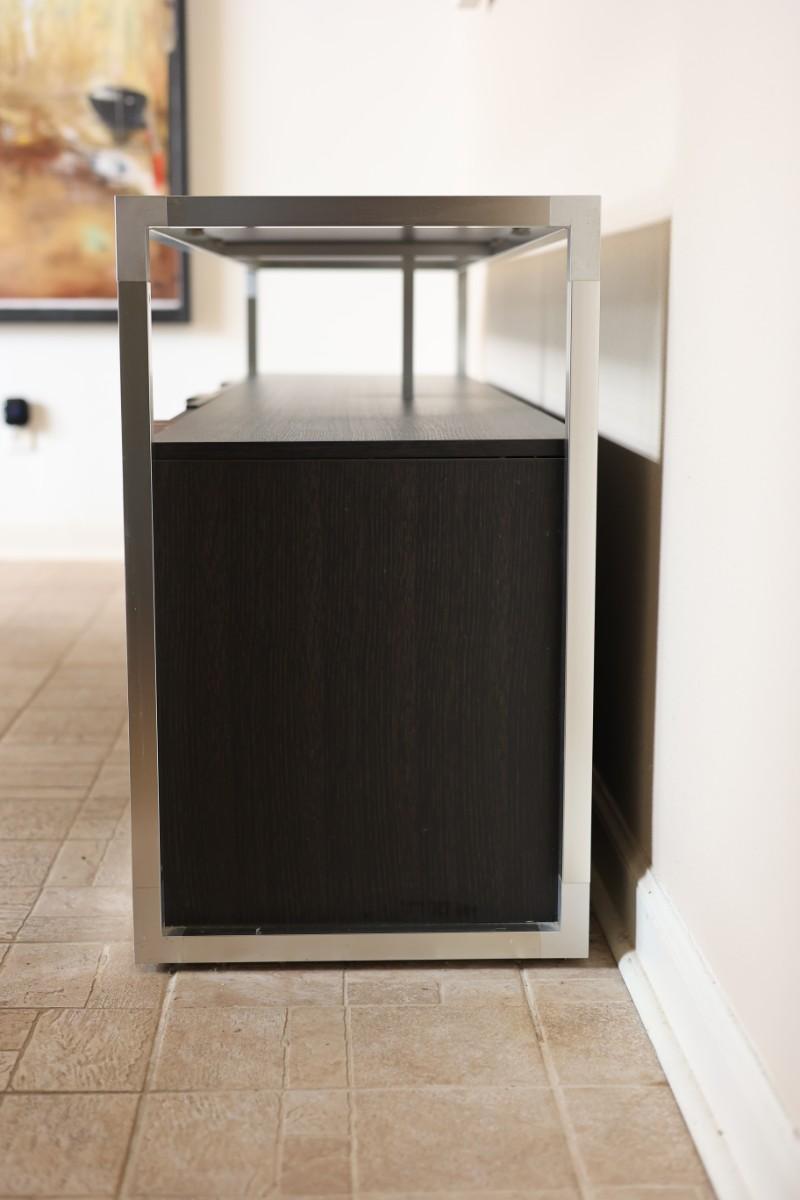 This exquisite, modern 3-door sideboard features an oak veneer with mocha lacquered profiles, a brilliant steel anodized aluminum finish and a toughened upper glass top. This striking piece is in excellent condition with only minor wear and tear. It was designed by the award-winning Didier Gomez.
