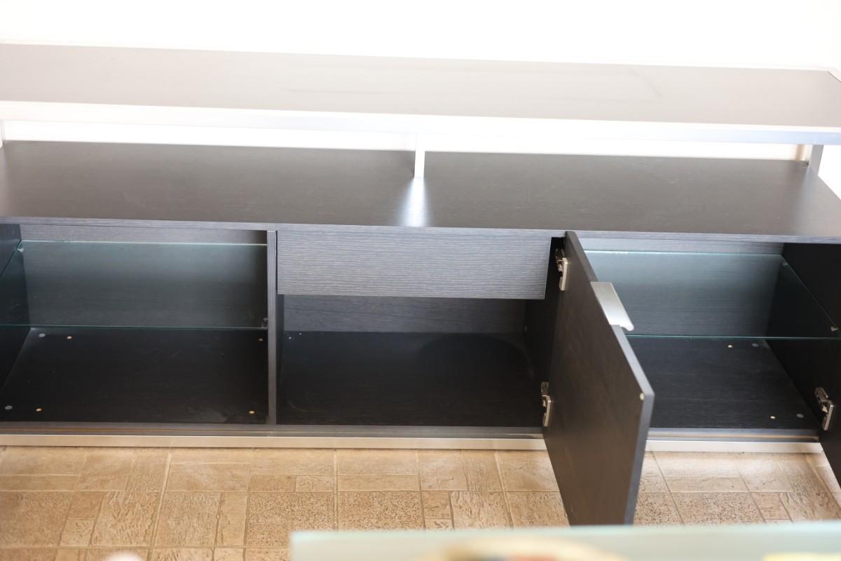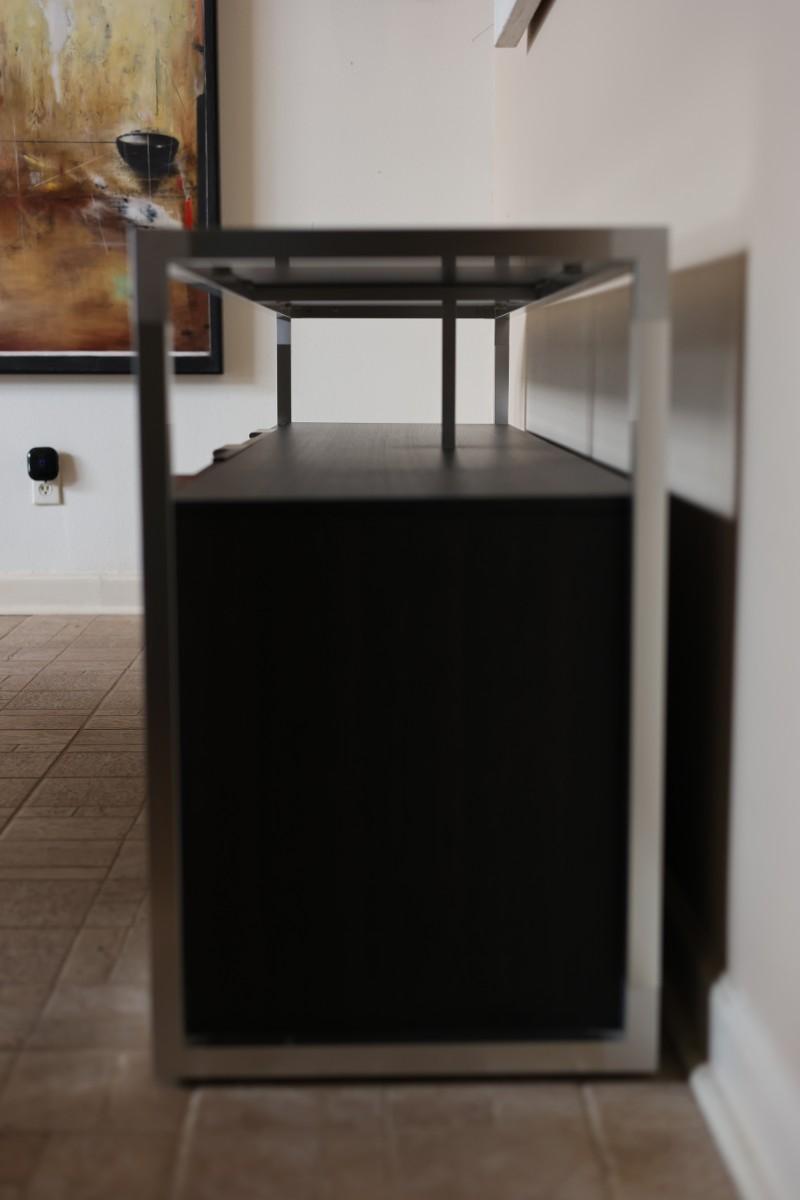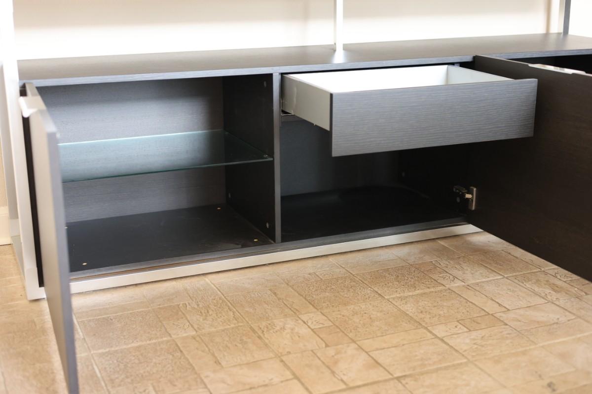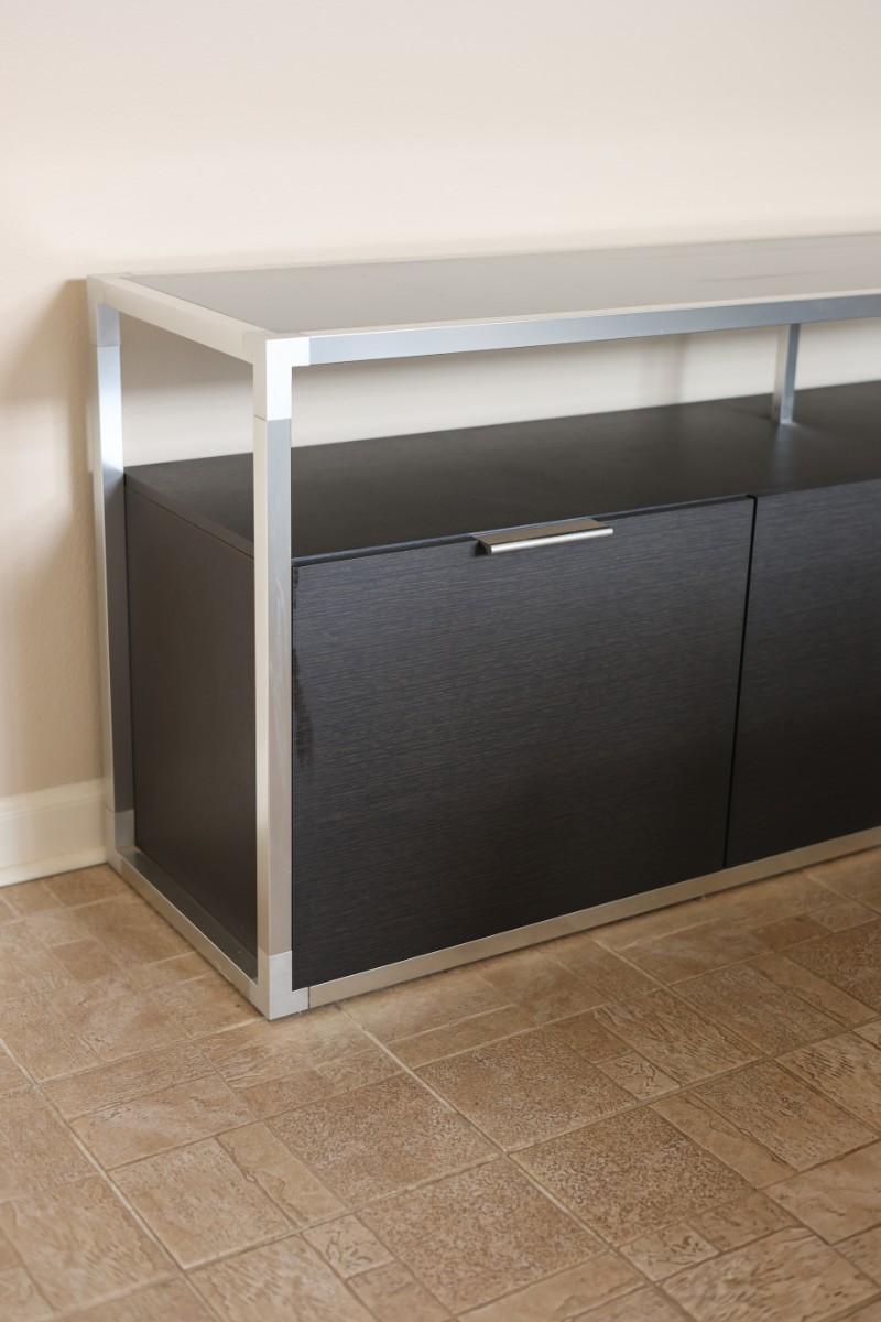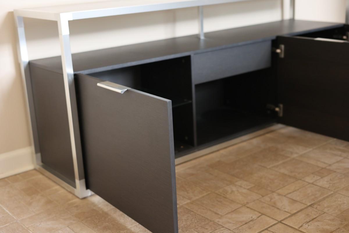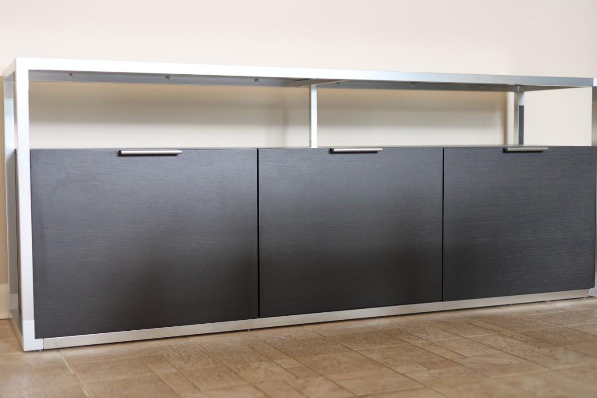 This exquisite, modern 3-door sideboard features an oak veneer with mocha lacquered profiles, a brilliant steel anodized aluminum finish and a toughened upper glass top. This striking piece is in excellent condition with only minor wear and tear. It was designed by the award-winning Didier Gomez.