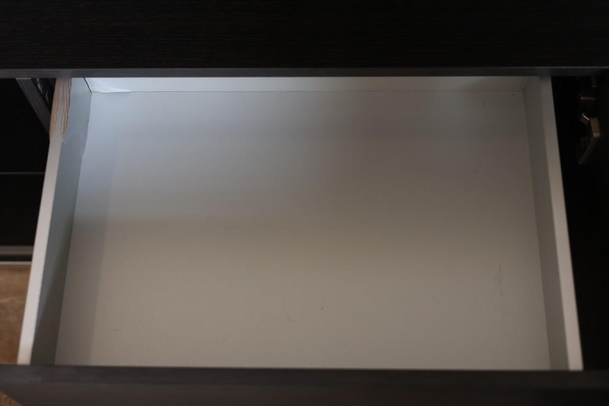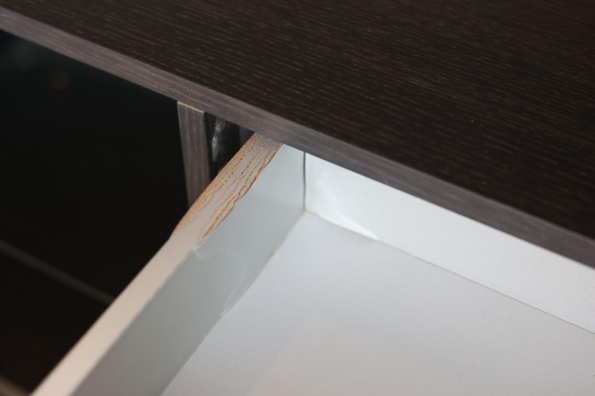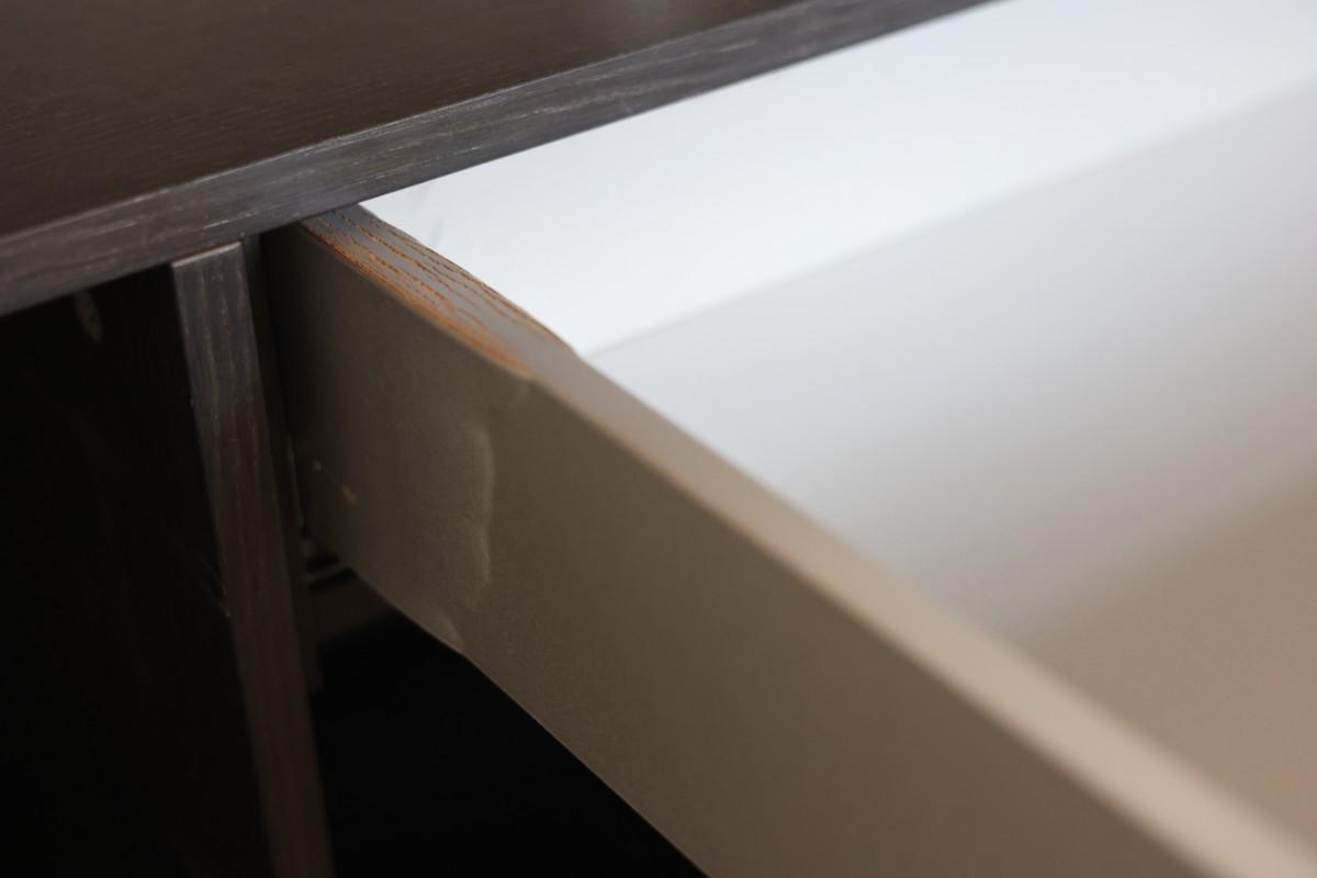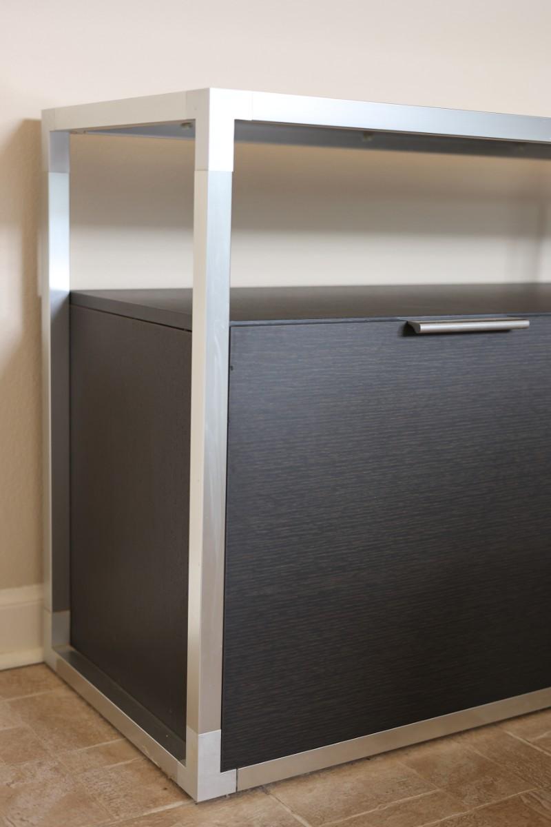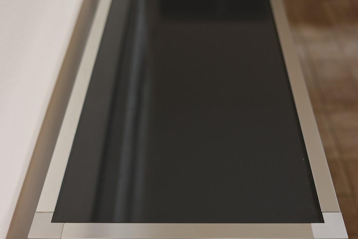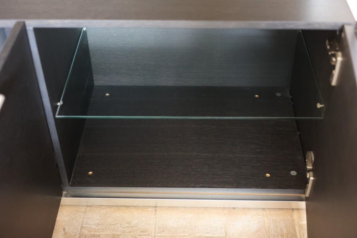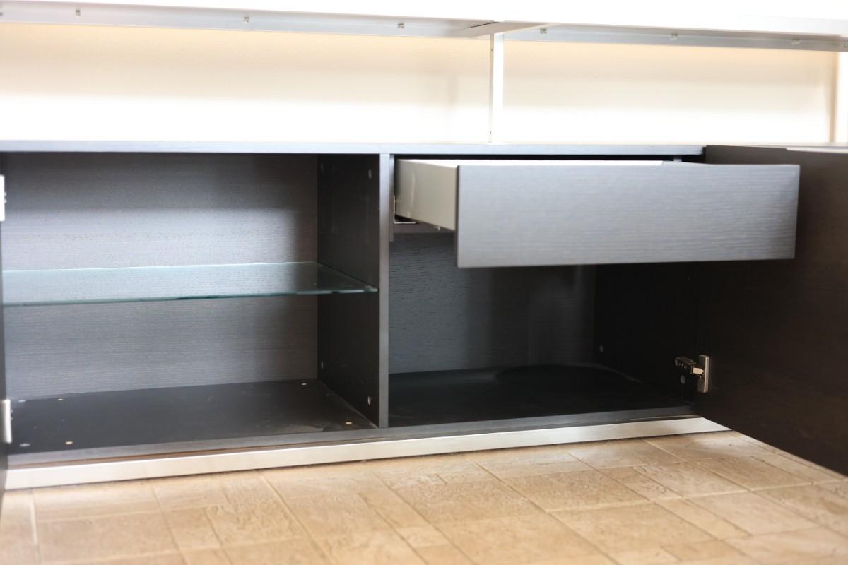 This exquisite, modern 3-door sideboard features an oak veneer with mocha lacquered profiles, a brilliant steel anodized aluminum finish and a toughened upper glass top. This striking piece is in excellent condition with only minor wear and tear. It was designed by the award-winning Didier Gomez.