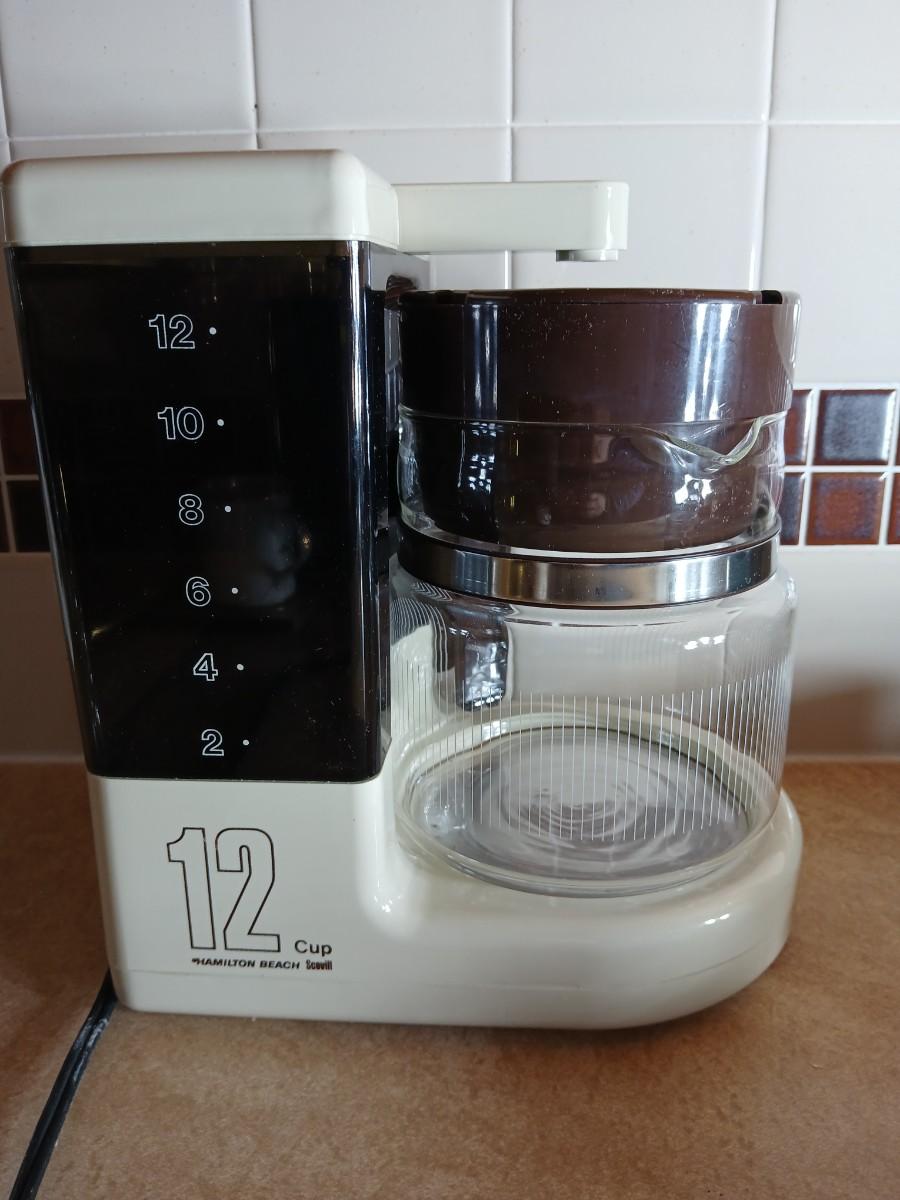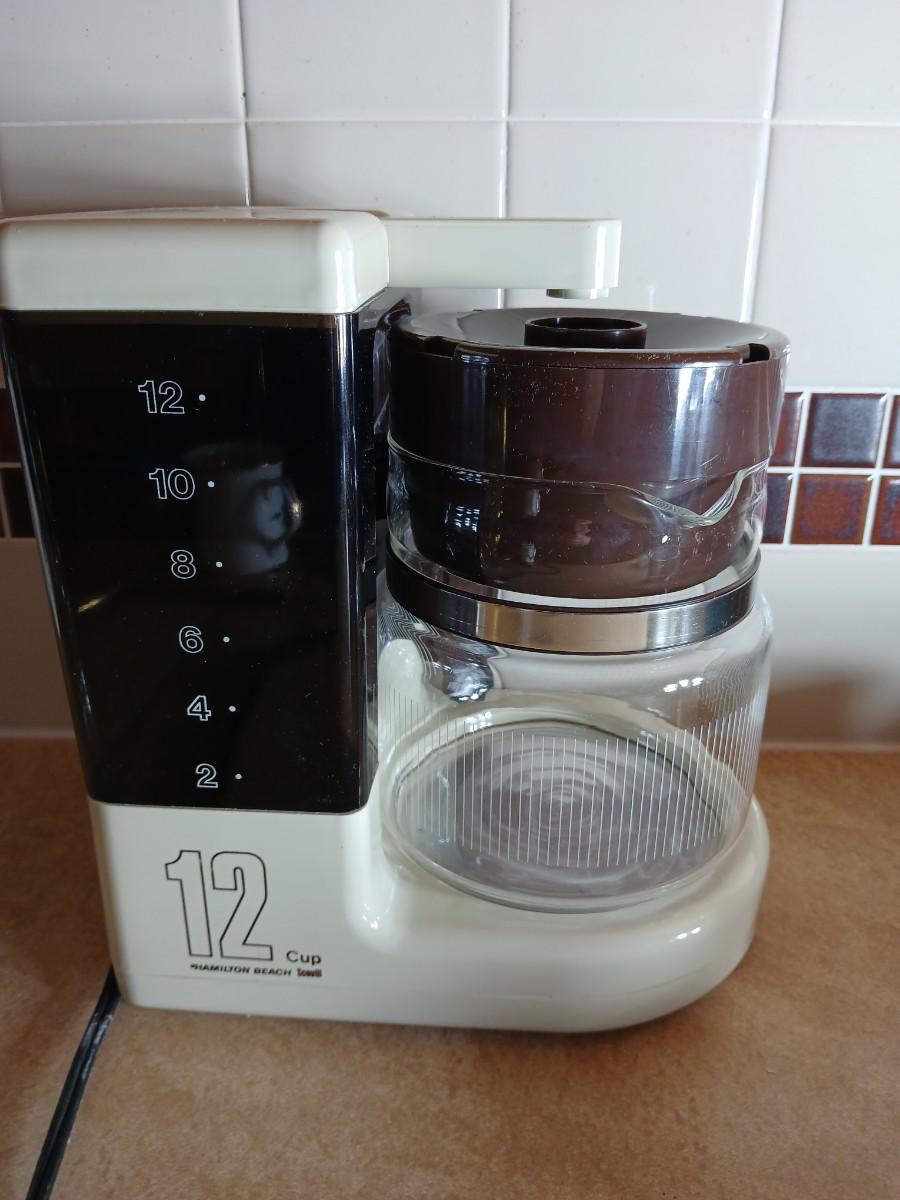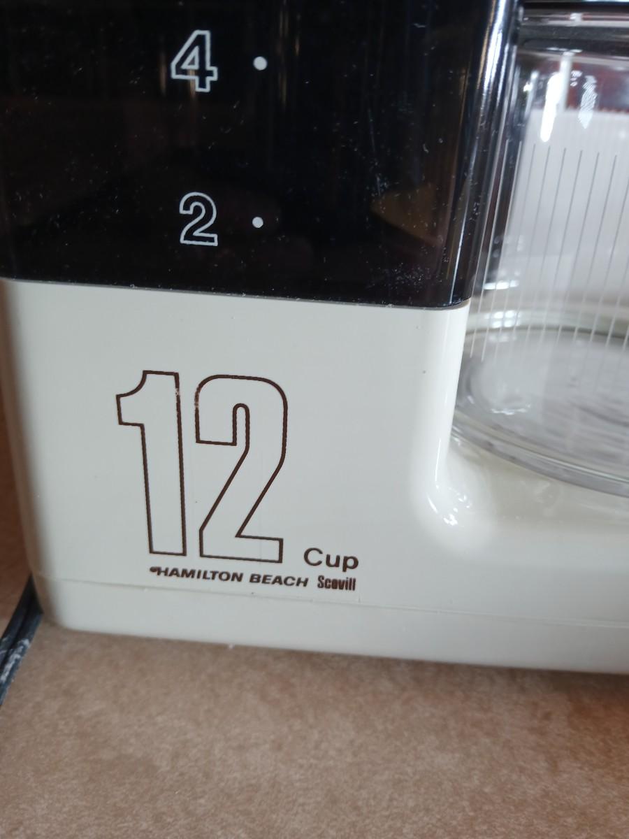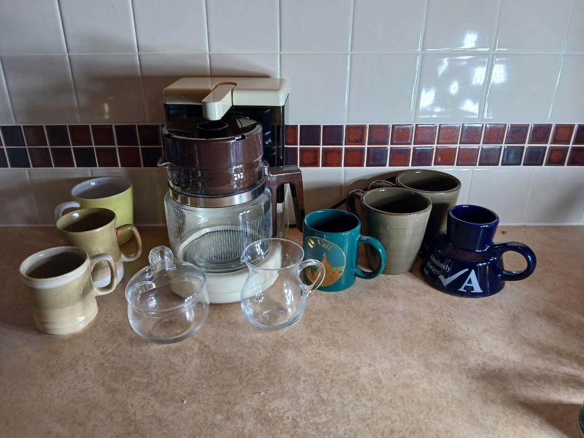 Like new 12 cup Hamilton beach coffee maker with all these coffee mugs sugar & cream dishes too! Model 791