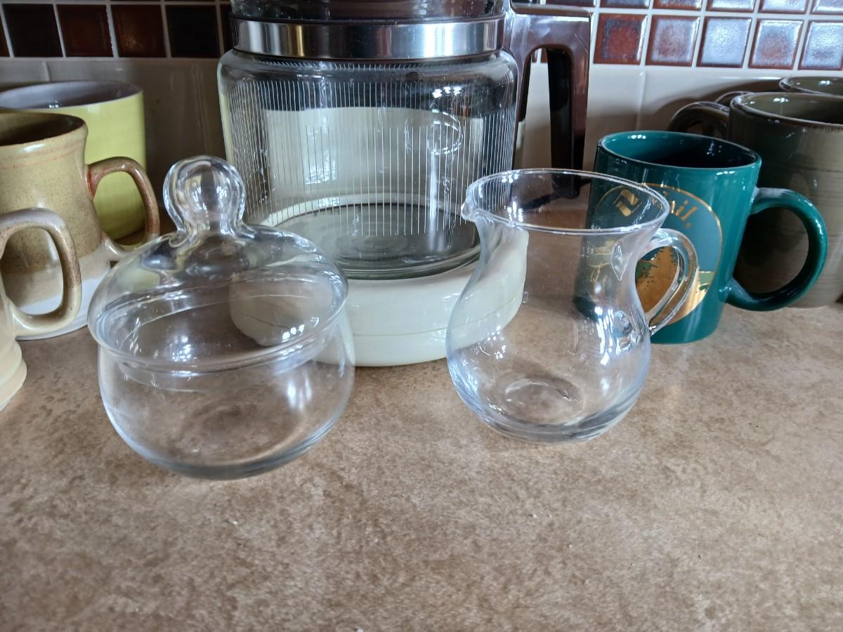 Like new 12 cup Hamilton beach coffee maker with all these coffee mugs sugar & cream dishes too!