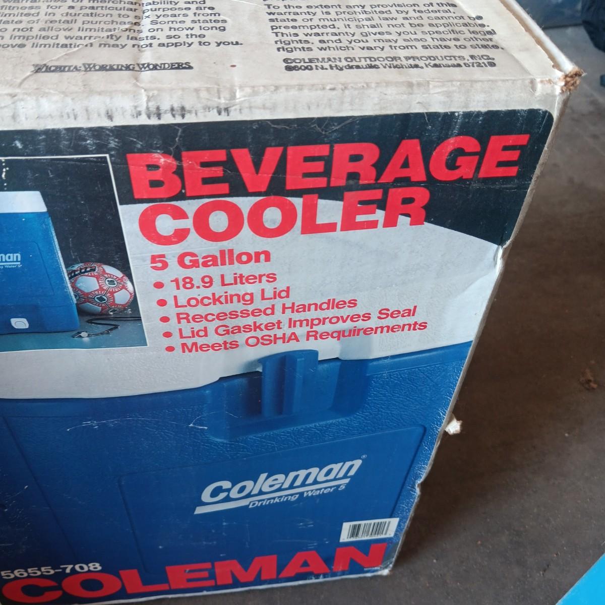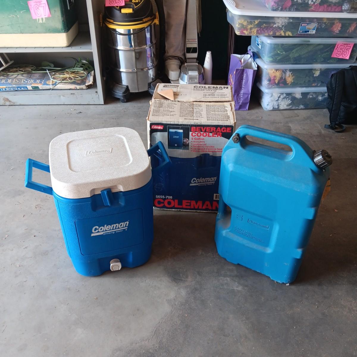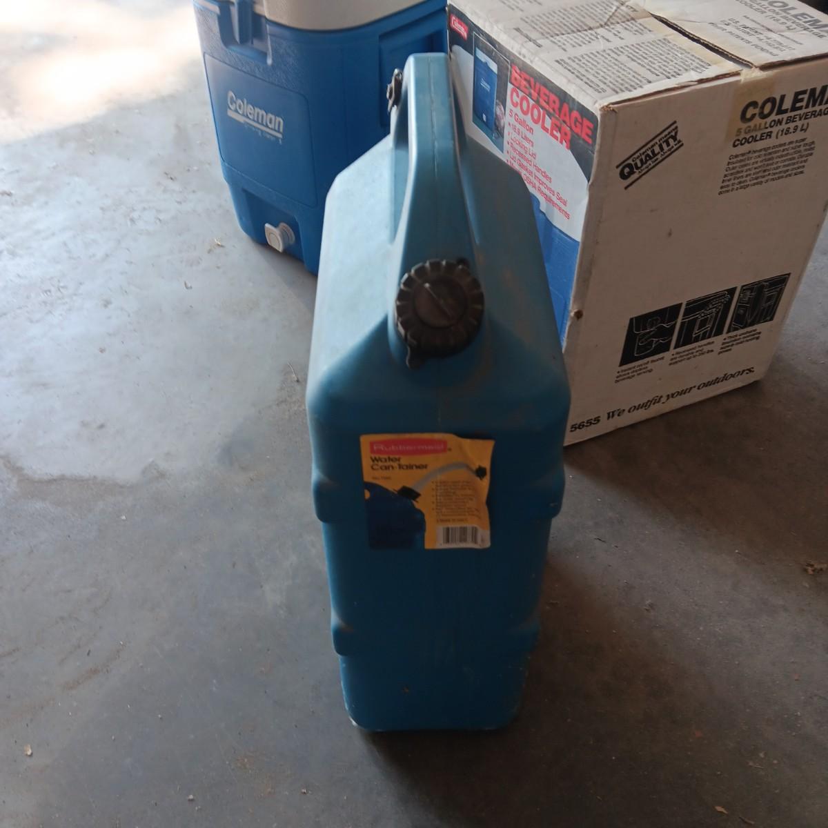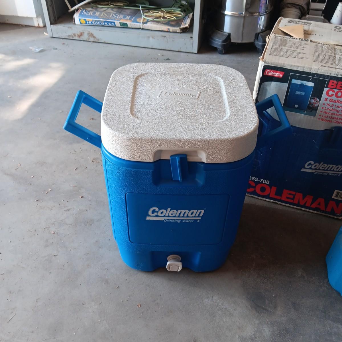 LIKE NEW COLEMAN BEVERAGE COOLER AND A 5 GALLON WATER CONTAINER
