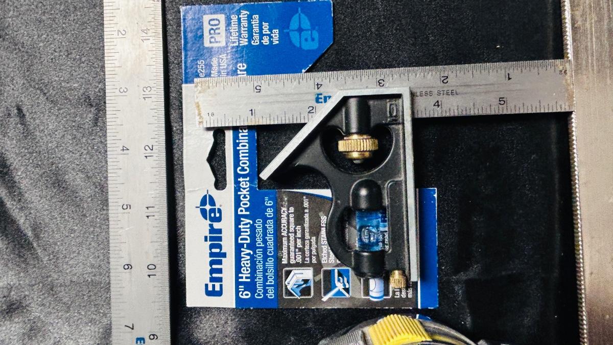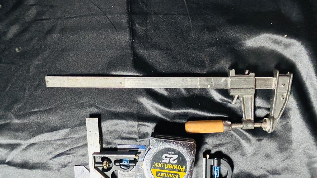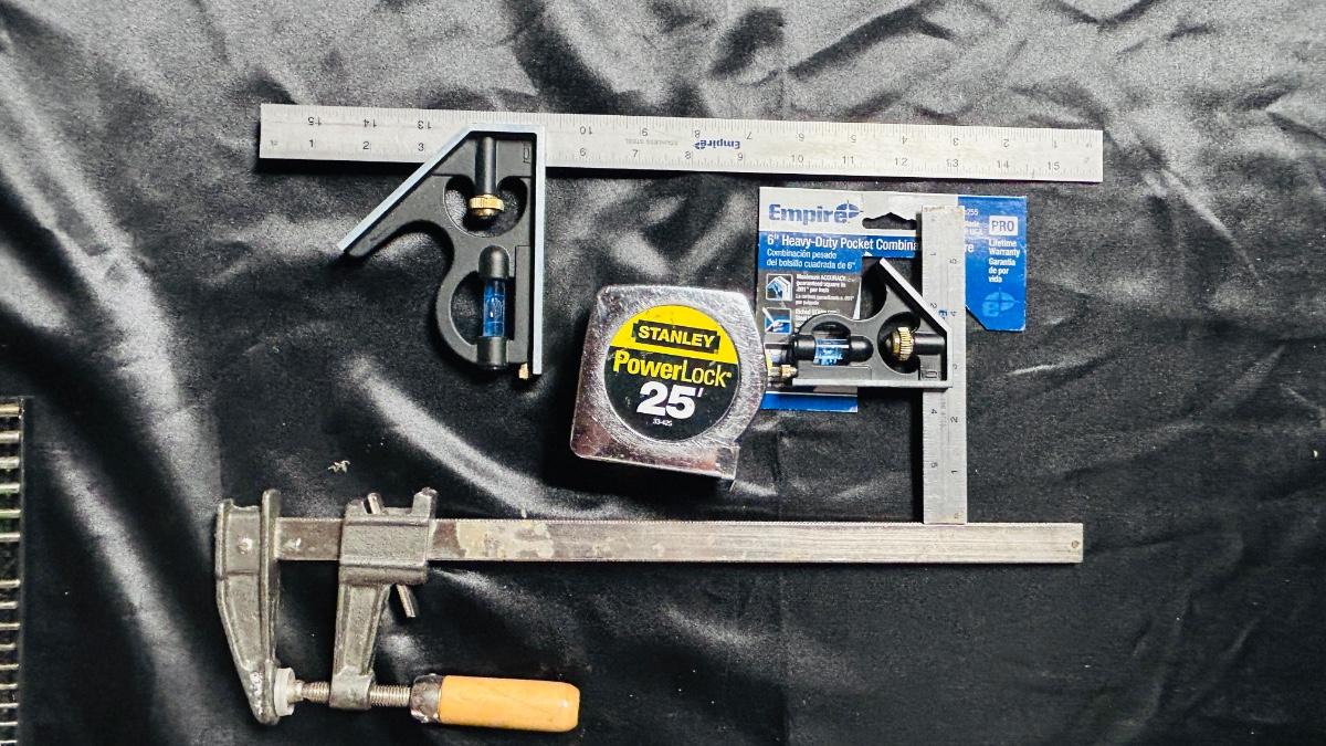 LIKE NEW EMPIRE COMBINATION SQUARES, STANLEY TAPE MEASURE AND 16” CLAMP