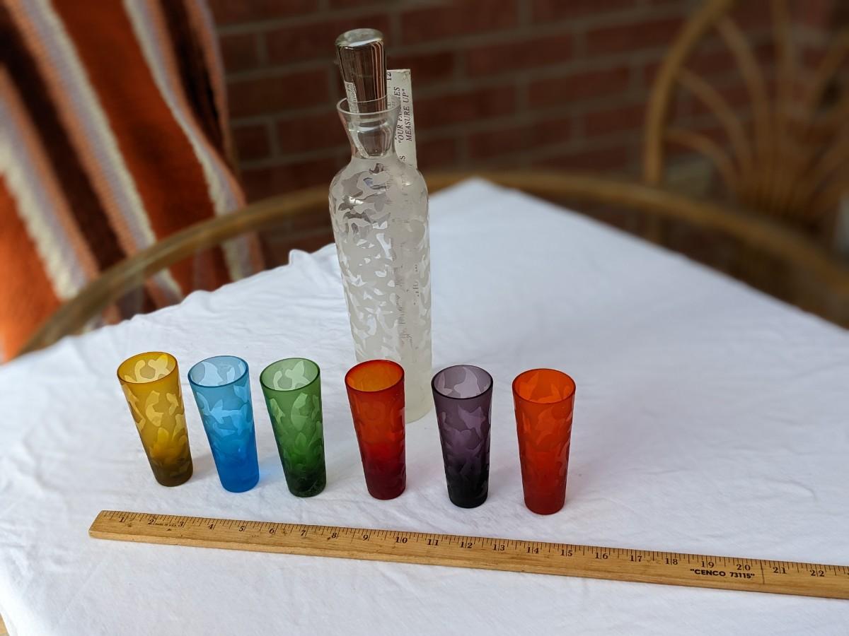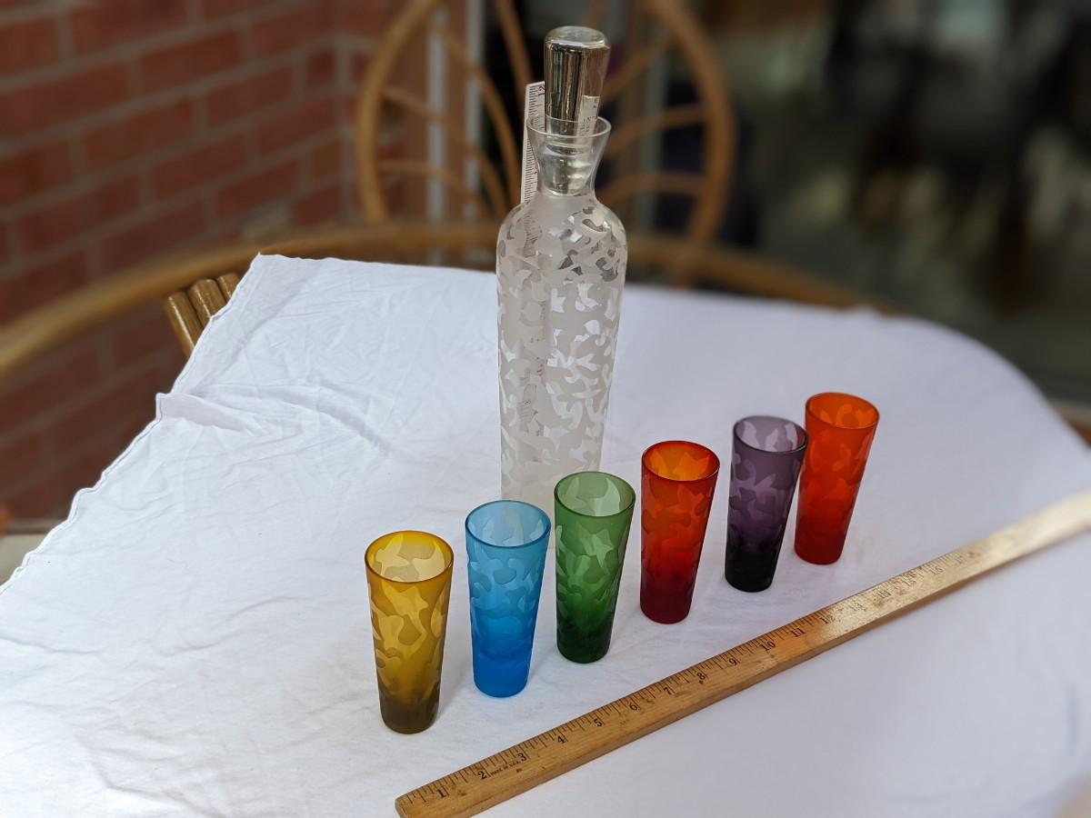 Like New Etched Multi Colored Glass Cordials and Decanter